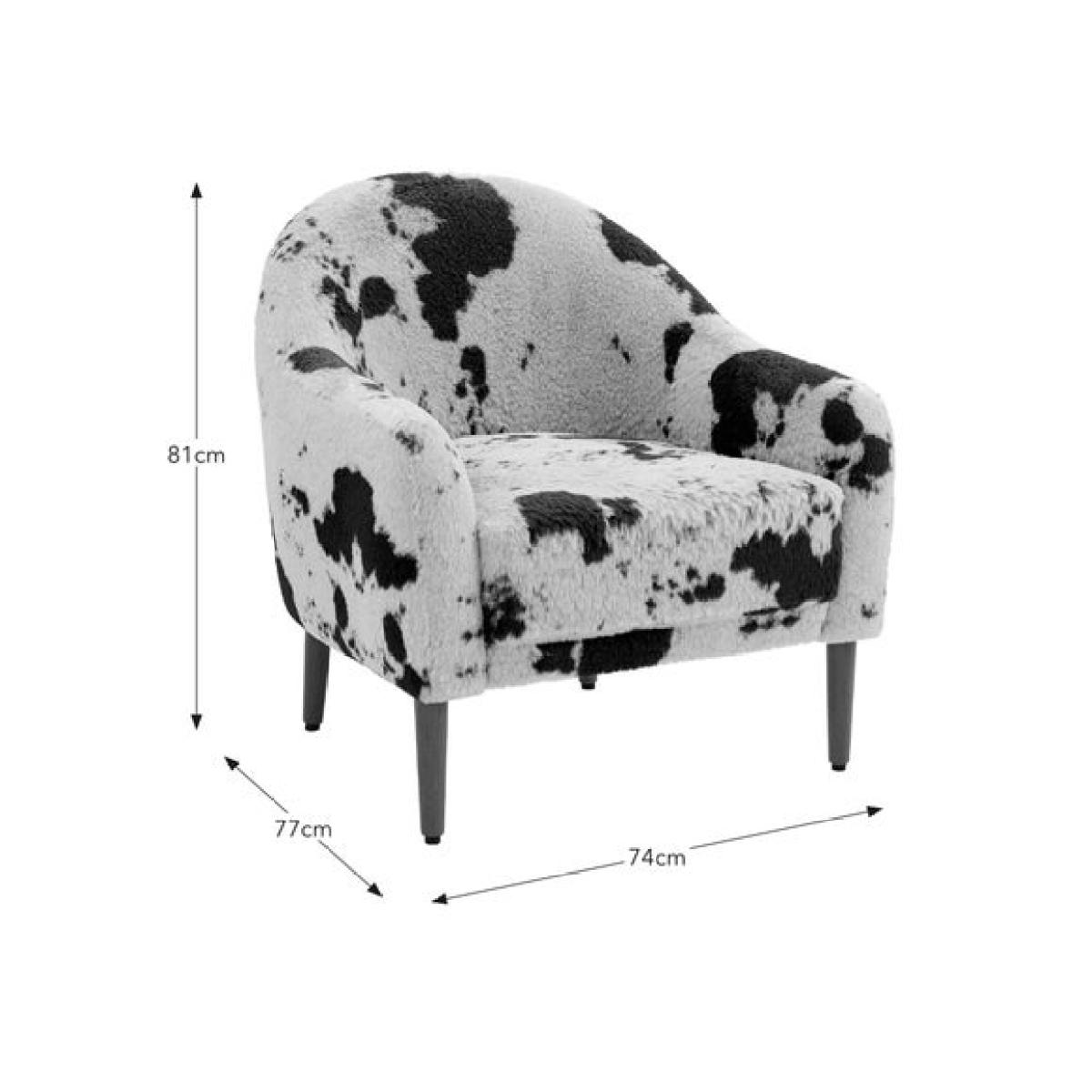 * Soft upholstery * Curved arms * Dark wood legs * Plush cushion filling The Kaspar tub chair makes a bold statement with its luxurious cow fur upholstery and classic tub-shaped design. Combining comfort with eye-catching texture, this chair offers a cosy, supportive seat while adding a touch of rustic charm and modern sophistication to any space.