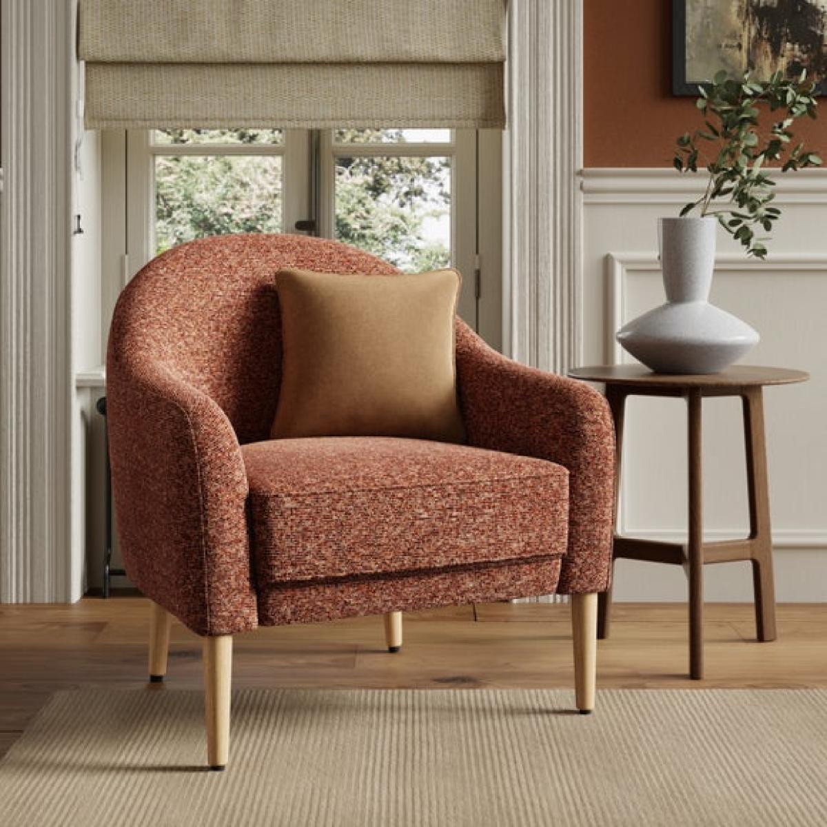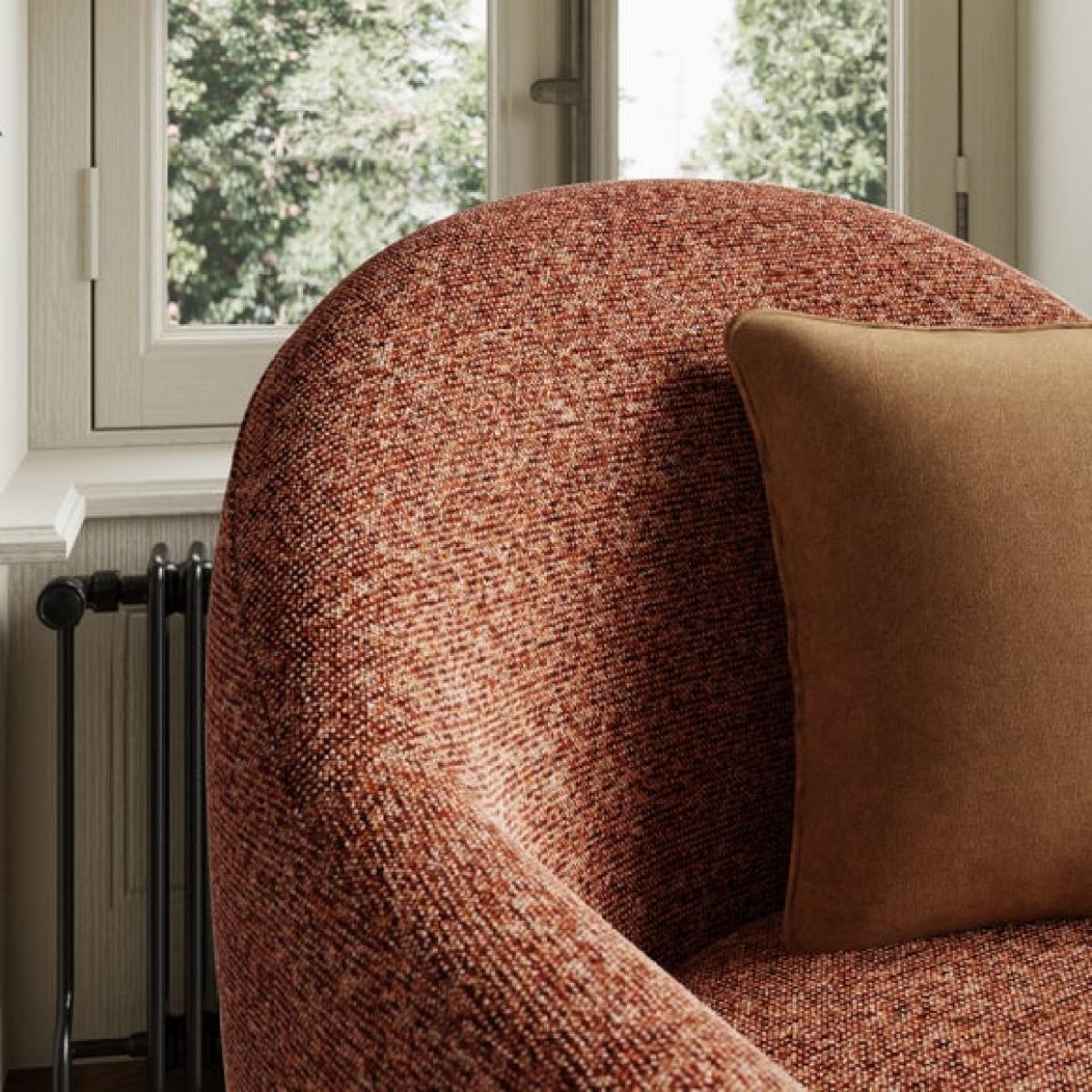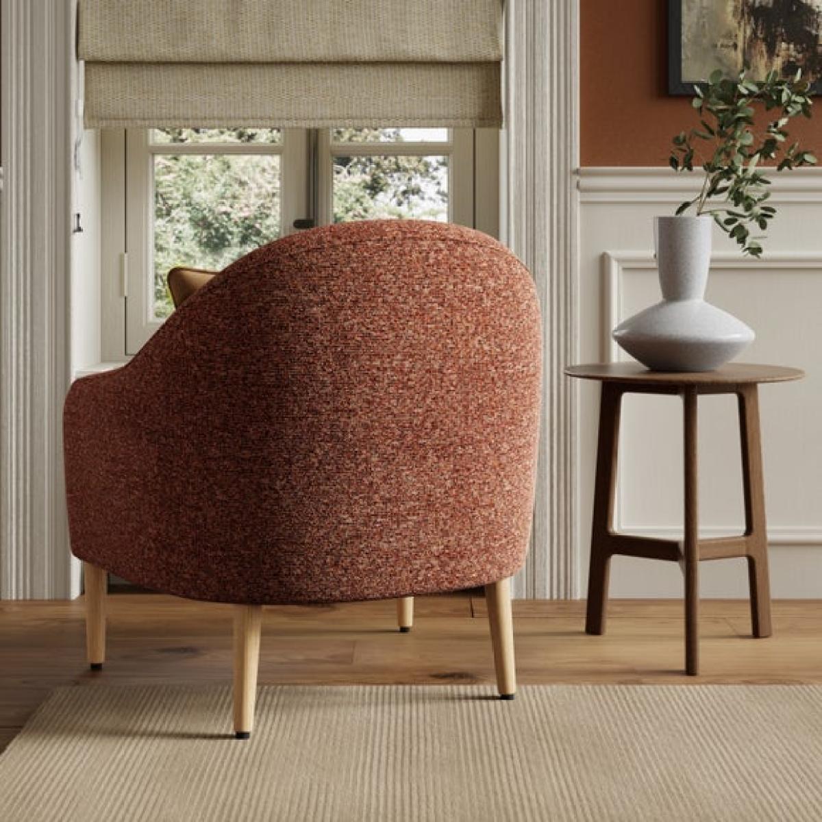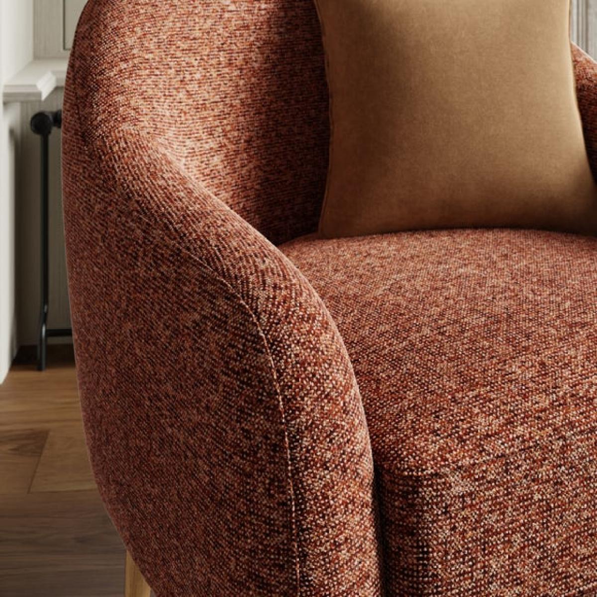 * Hardwood frame * Soft upholstery * Deep chair * Foam filled seat This chair is designed to envelop you in comfort, with its deep seat and curved backrest that create a cosy, cocoon-like feel, while the flecked chenille fabric adds a soft, inviting texture. The warm sunset tones bring a sense of calm and coziness, making it a perfect choice for relaxing spaces. Built on a solid hardwood frame and filled with supportive foam, this chair is as durable as it is stylish.