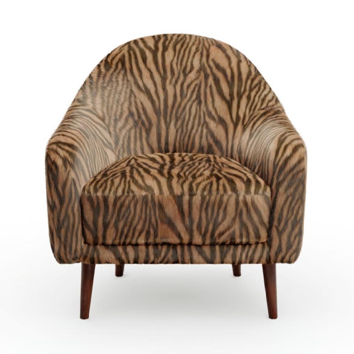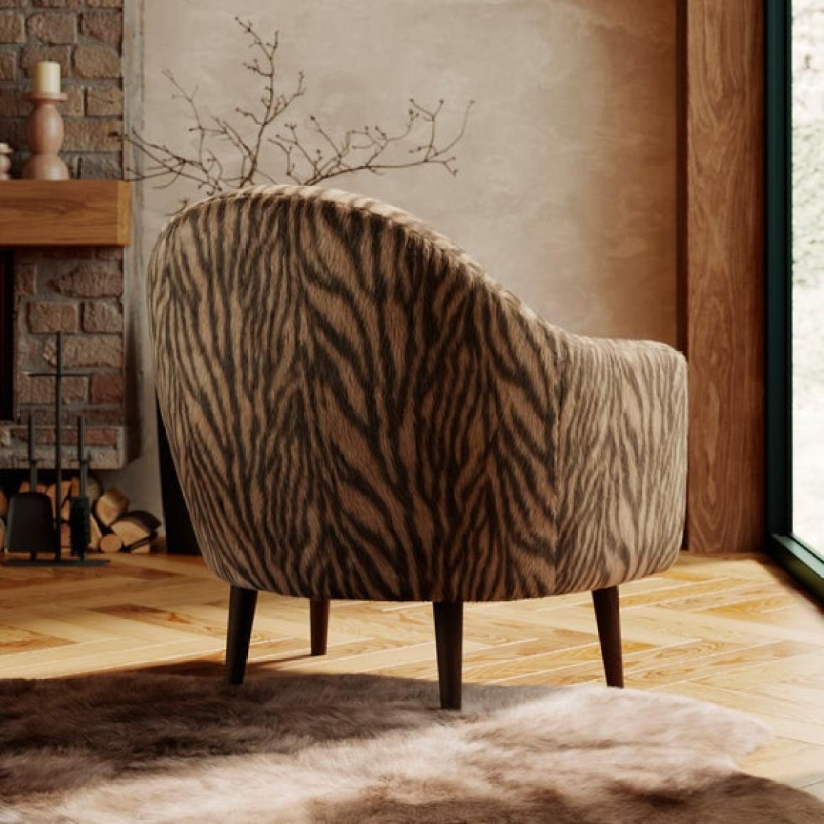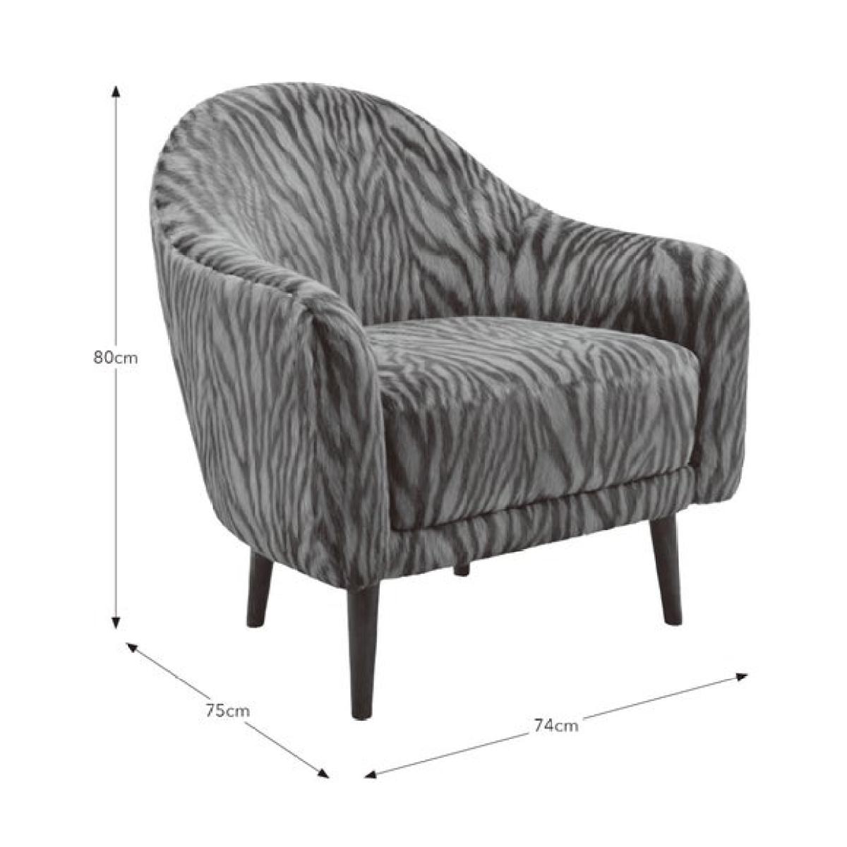 * Curved arms * Soft upholstery * Dark wooden legs * Plush cushion filling Add a bold touch to your space with this zebra print tub chair, designed to stand out while offering everyday comfort. The curved arms and plush cushion filling create a cosy, supportive seat that’s perfect for relaxing. Upholstered in soft faux fur, it brings texture and warmth to any room. Dark wood legs provide a sturdy base with a refined finish. Ideal for bedrooms, lounges or reading corners, it’s a stylish choice with a wild side.