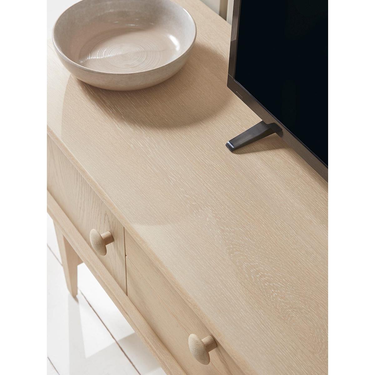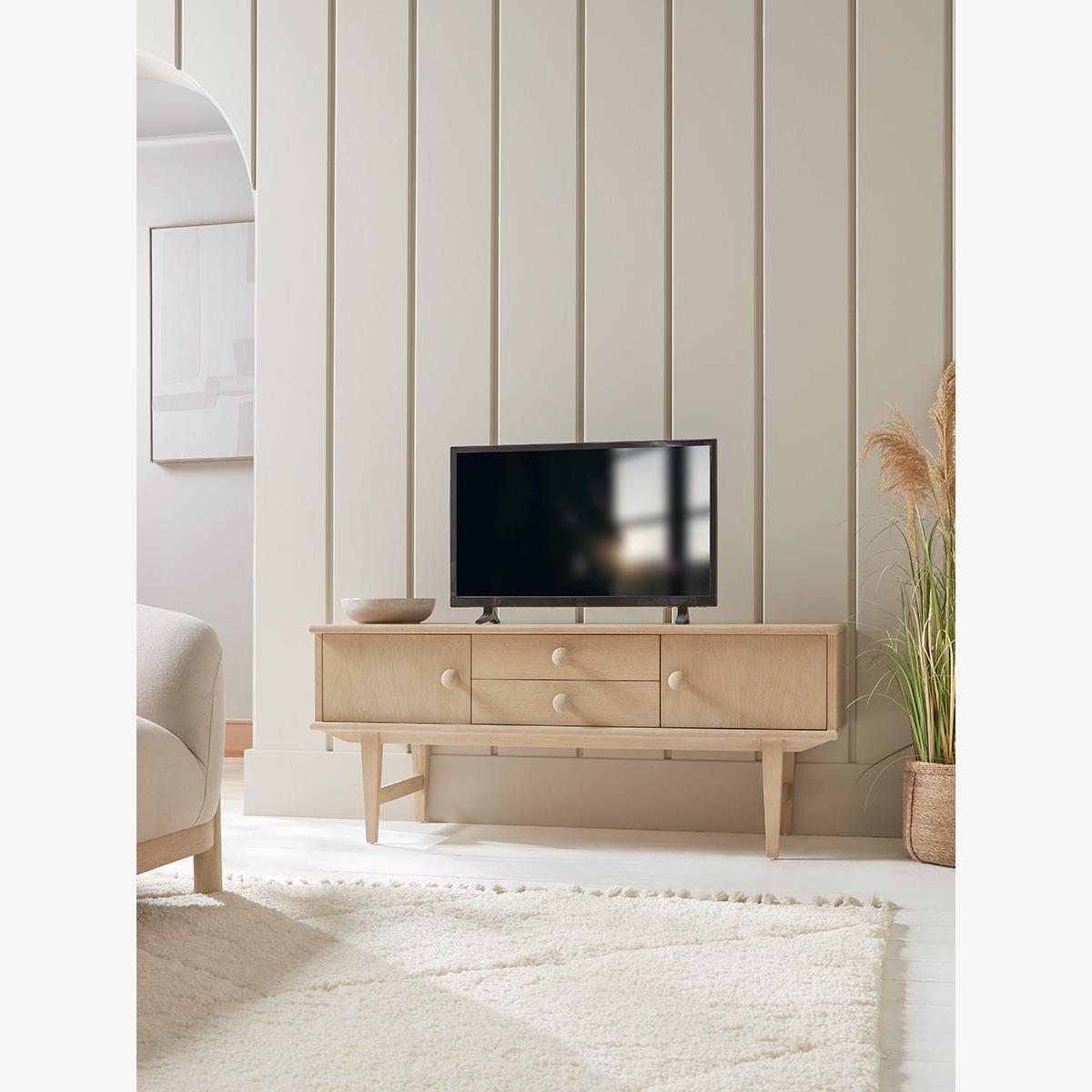 I’m a fan of this Katara unit for its clean lines and light oak finish - it slots straight into Scandi, modern or even soft-boho schemes without overwhelming the room. Its raised legs and pared-back profile keep the space feeling airy, while the concealed drawers offer just enough storage to hide away remotes, cables and odds and ends. To style it, balance out the width with a low-slung artwork or mirror propped against the wall. Keep tech clutter to a minimum by coiling leads inside the drawers, then add a couple of vases or a small plant at one end and a stack of books or a decorative bowl at the other. A slim runner or textured rug in front will help anchor the whole look.
