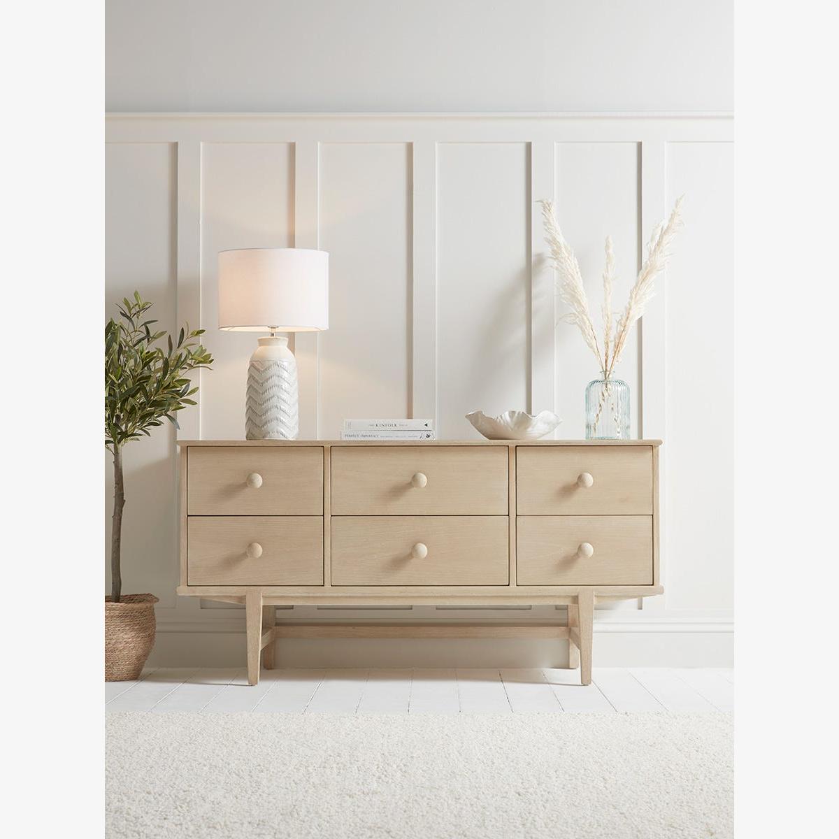 I love how this Katara unit’s light oak finish and clean lines make it a versatile base for both Scandi and Japandi schemes - it sits equally well against a pale wall or in a brighter, maximalist space. The six drawers offer discreet storage for everyday clutter, keeping your living area looking neat. Styling tip: layer a low-profile lamp on one end and a mix of textured vases or a bowl on the other, leaving the centre clear to let the structure breathe. Hang a simple framed print or a round mirror above to draw the eye up, and tuck a tall plant next to one side for a relaxed, lived-in feel.