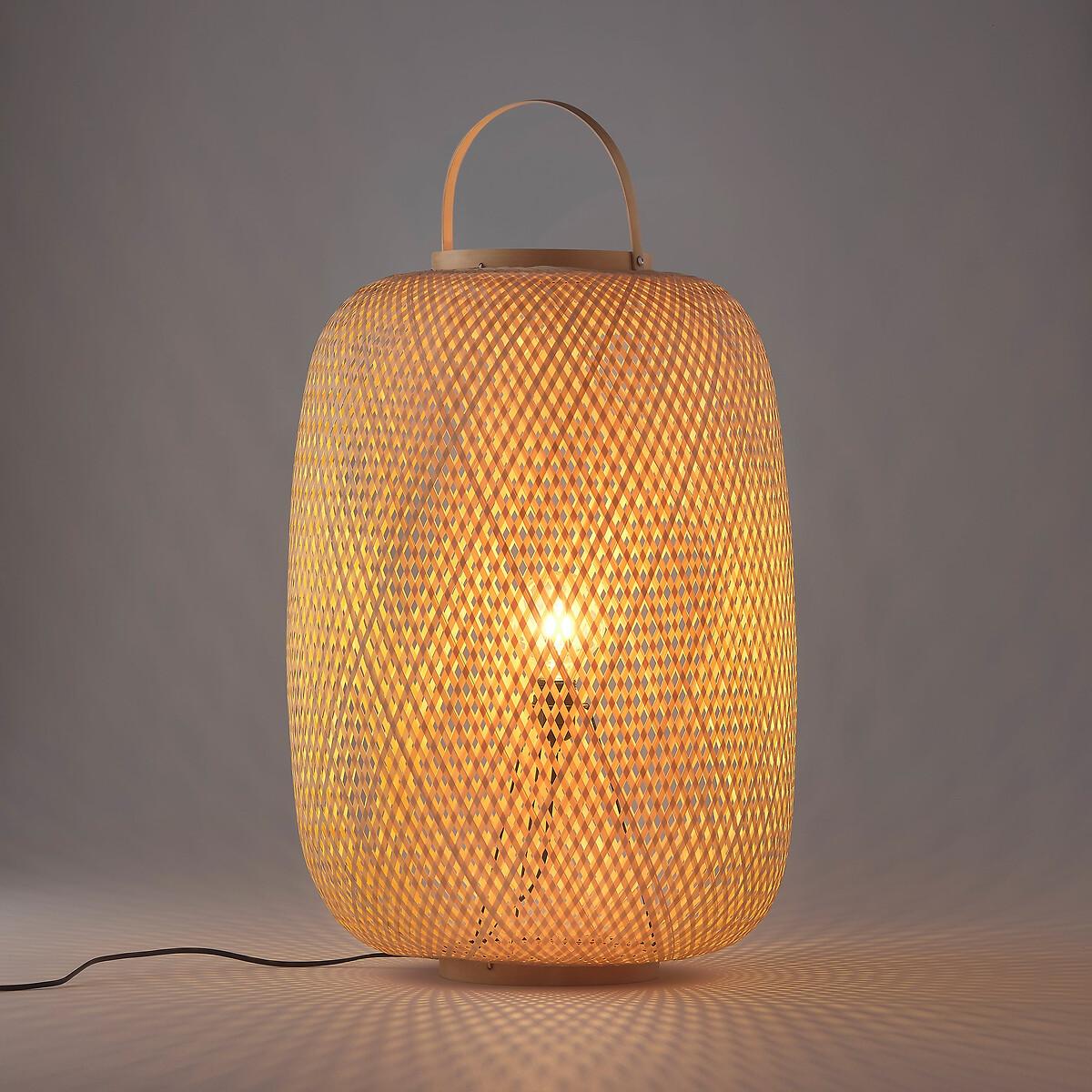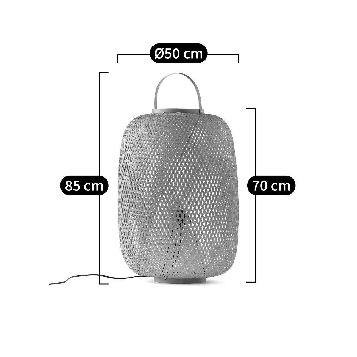Get the natural look with our Katia table lamp: a lantern-inspired light composed of a woven structure crossed with bamboo fibres for a soft diffusion of light. Easy to transport with its own built-in handle, the Katia lamp provides an original way to light a room from the floor. Product Details • Woven bamboo lamp. • Iron structure covered with epoxy paint • Bamboo bulb support. • E27 socket for 60W max bulb not included, class ABCDE.Dimensions • Diameter : 50cm. • Height: 70cm (excluding handle) / 85cm (with handle).Dimensions and weight of parcel:1 parcel• 72 x 52 x 52cm• 4kg