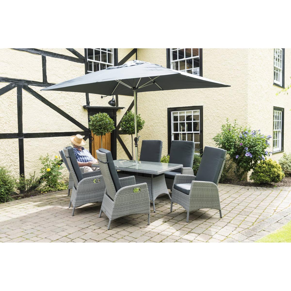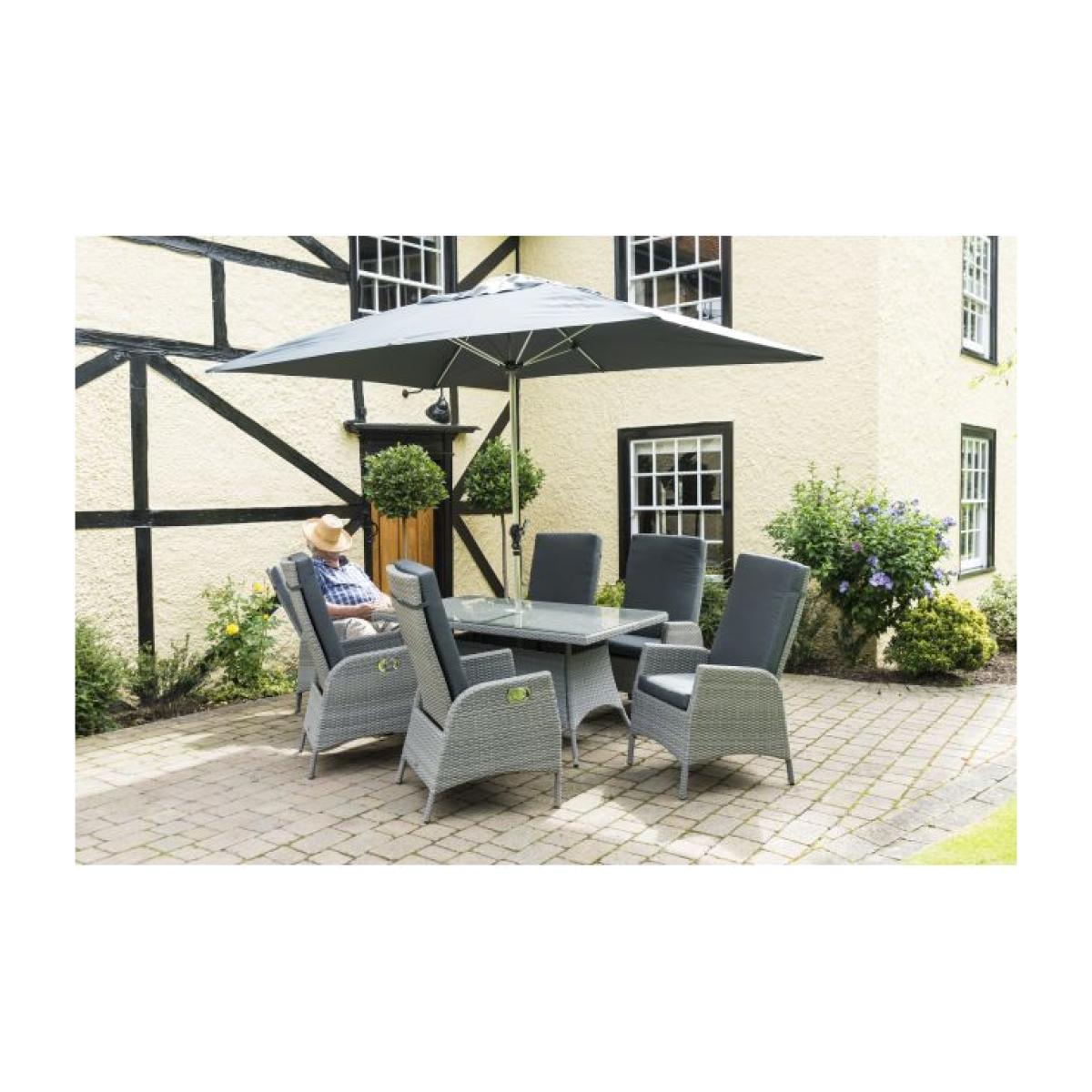 The Katie Blake Chatsworth 6 Seater Rectangular Recliner Set is from a range of beautifully hand-crafted rattan garden furniture and comes in a Dove Grey weave with grey seat and back cushions. The cushions are 100% polyester, manufactured using a high quality of fabric. The table is topped with 5mm safety glass. The Chatsworth can be left outdoors permanently requiring no maintenance except a wash with warm soapy water. The set features detachable cushions that can be removed and stored away when not in use. The set consists of a 150cm x 90cm rectangular table, 6 recliner armchairs with seat and back cushions. There is also a 3m x 2m Sturdi polished aluminium parasol with crank mechanism and a 20kg Sturdi concrete parasol base. Chatsworth comes with a 10 year manufacturer's guarantee, but this is reliant on you using a Katie Blake Cover to protect your furniture. Without a cover, there is a 3-year warranty. Please note cushions and parasols, whilst shower resistant, must not be left outside permanently otherwise some deterioration will occur. All screens vary in colour reproduction and whilst every effort has been made to display the colour as accurately as possible it is for guidance only.