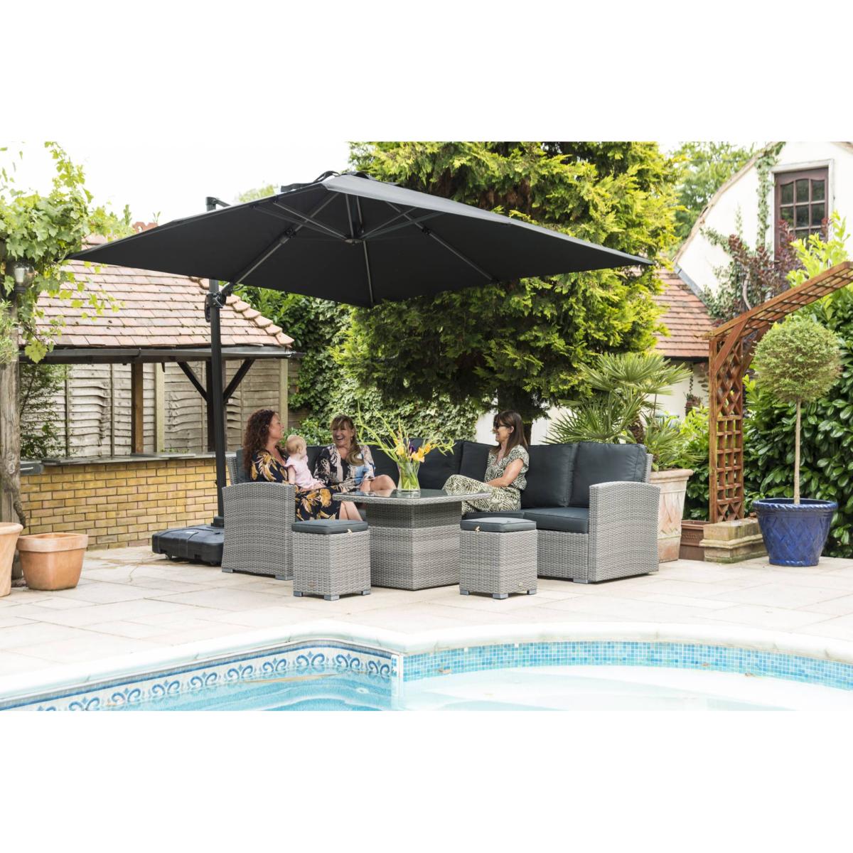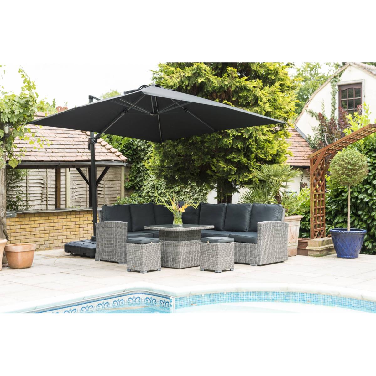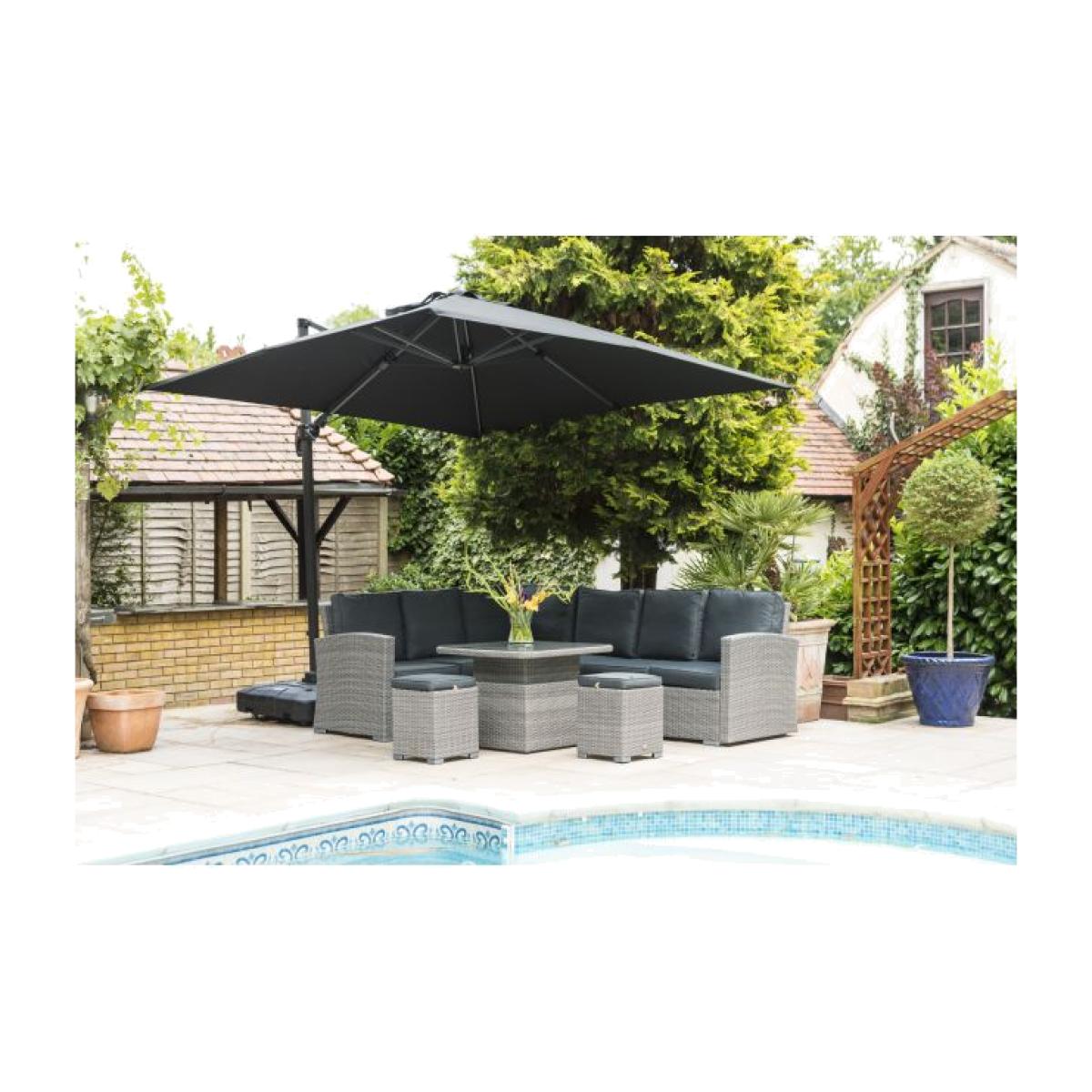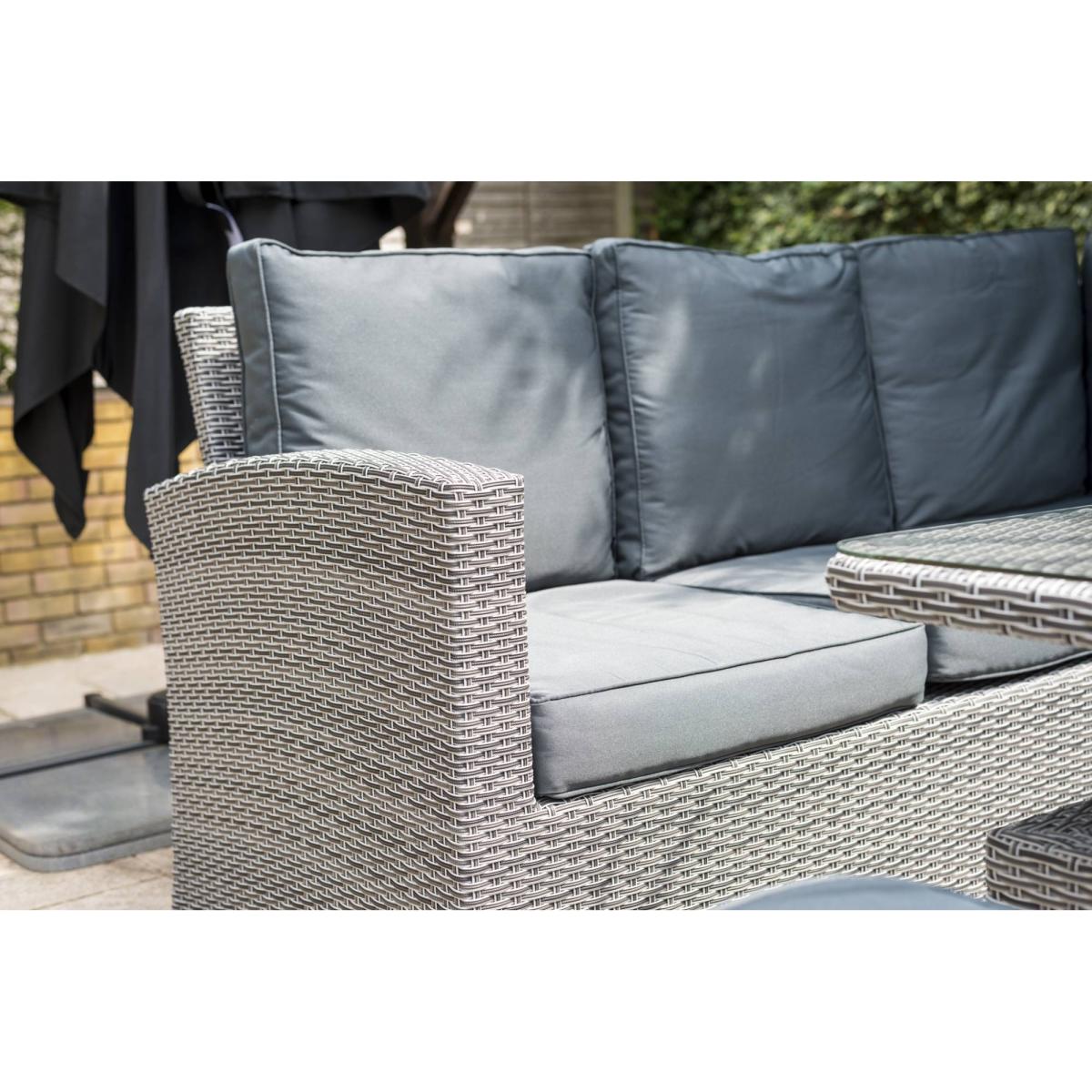 The Katie Blake Chatsworth Corner Set is from a range of beautifully hand-crafted rattan garden furniture and comes in a Dove Grey weave with grey seat and back cushions. The cushions are 100% polyester, manufactured using a high quality of fabric. The table is topped with 5mm safety glass. Chatsworth can be left outdoors permanently requiring no maintenance except a wash with warm soapy water. The set features detachable cushions that can be removed and stored away when not in use. Chatsworth comes with a 10-year manufacturer's guarantee, but this is reliant on you using a Katie Blake Cover to protect your furniture. Without a cover, there is a 3-year warranty. Please note cushions and parasols, whilst shower resistant, must not be left outside permanently otherwise some deterioration will occur. The set consists of a corner Set with cushions, an 80cm x 80cm Hi/Lo adjustable table and 2 footstools with cushions This set has a footprint of 2.5m x 2.5m Some home assembly to attach the arms of the corner group is required All screens vary in colour reproduction and whilst every effort has been made to display the colour as accurately as possible it is for guidance only.
