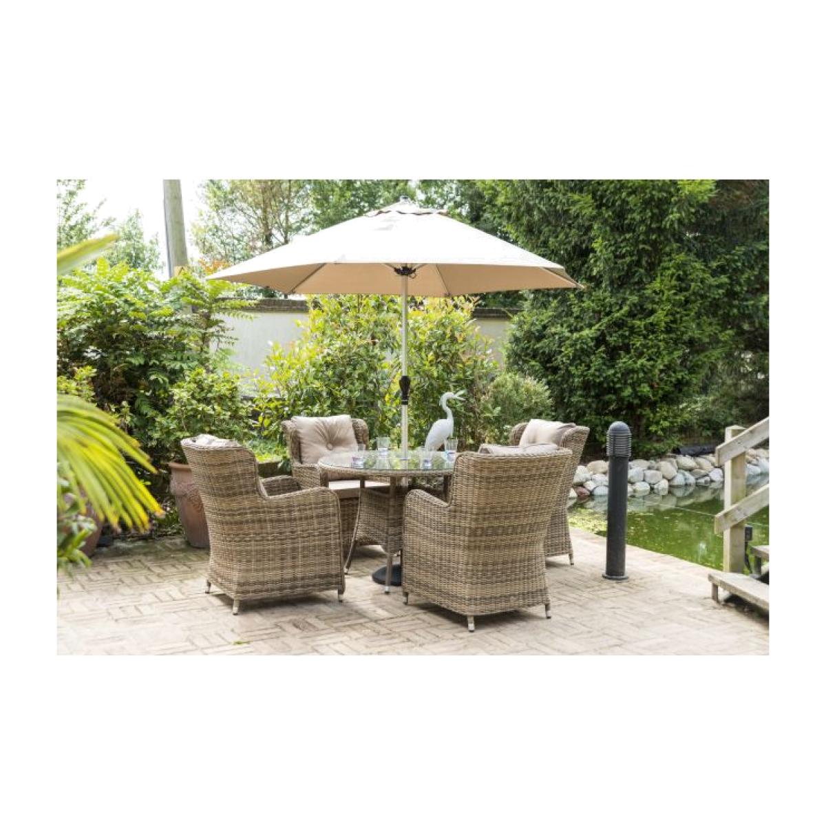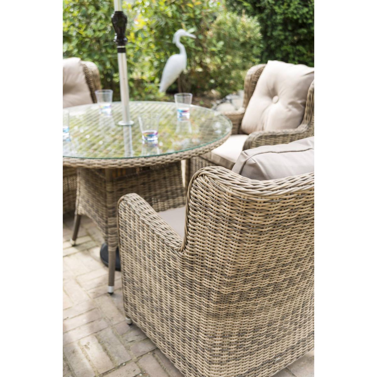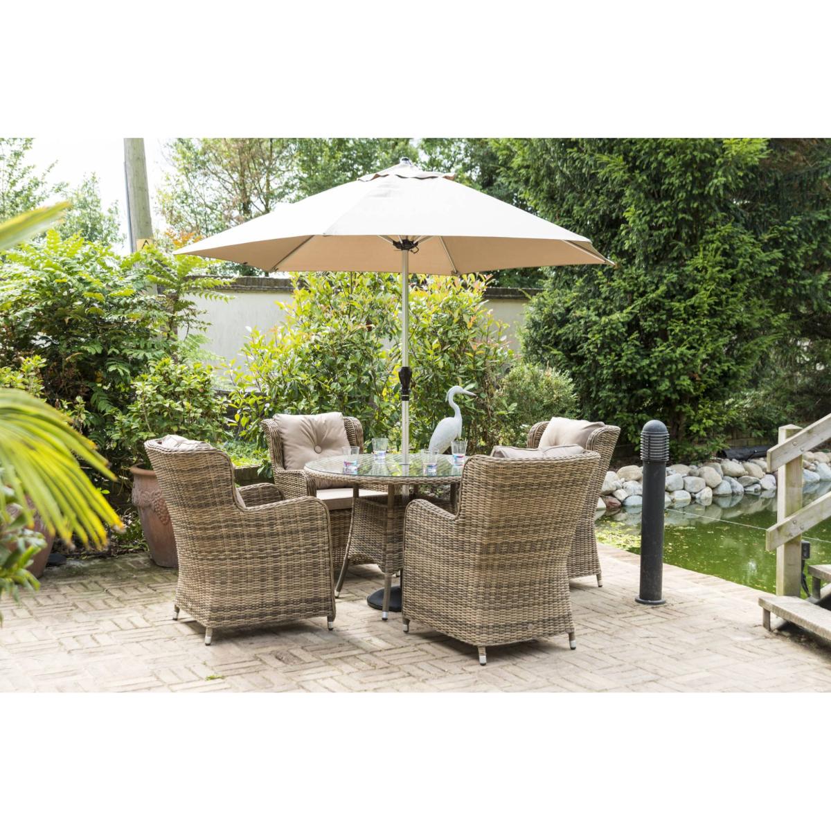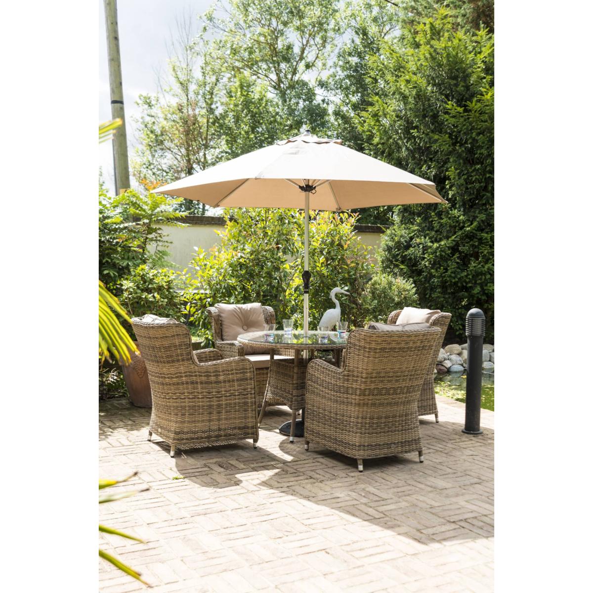 Katie Blake's Seville Garden Furniture Collection is fabricated using only the highest quality and long-lasting materials. With its classic looks, generous sized chairs and comfortably filled cushioning, it is as stylish as it is durable. The light and sturdy aluminium framework has a weather resistant synthetic resin weave. The Seville collection can be left outdoors permanently requiring no maintenance except a wash with warm soapy water. The Katie Blake Seville 4-Seater Dining Set includes a parasol and base with a 1.1m round table and 4 high back armchairs with seat and back cushions. The 2.5m polished aluminium parasol has a crank mechanism and fits neatly into the 15kg concrete parasol base. The weave is a classic multi-tonal natural colour with taupe cushions. Seville comes with a 10-year manufacturer's guarantee, but this is reliant on you using a Katie Blake Cover to protect your furniture. Without a cover, there is a 3-year warranty. Please note cushions and parasols, whilst shower resistant, must not be left outside permanently otherwise some deterioration will occur. This set has a footprint of 2.5m x 2.5m Chair Dimensions - H 95 x W 110 x D 110cm All screens vary in colour reproduction and whilst every effort has been made to display the colour as accurately as possible it is for guidance only.