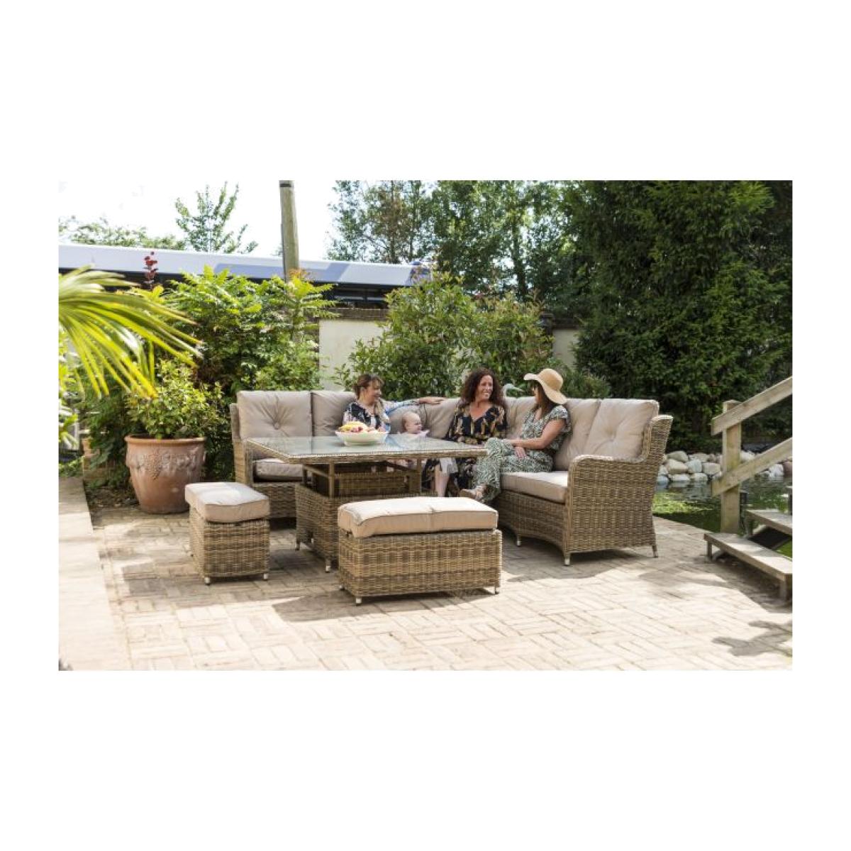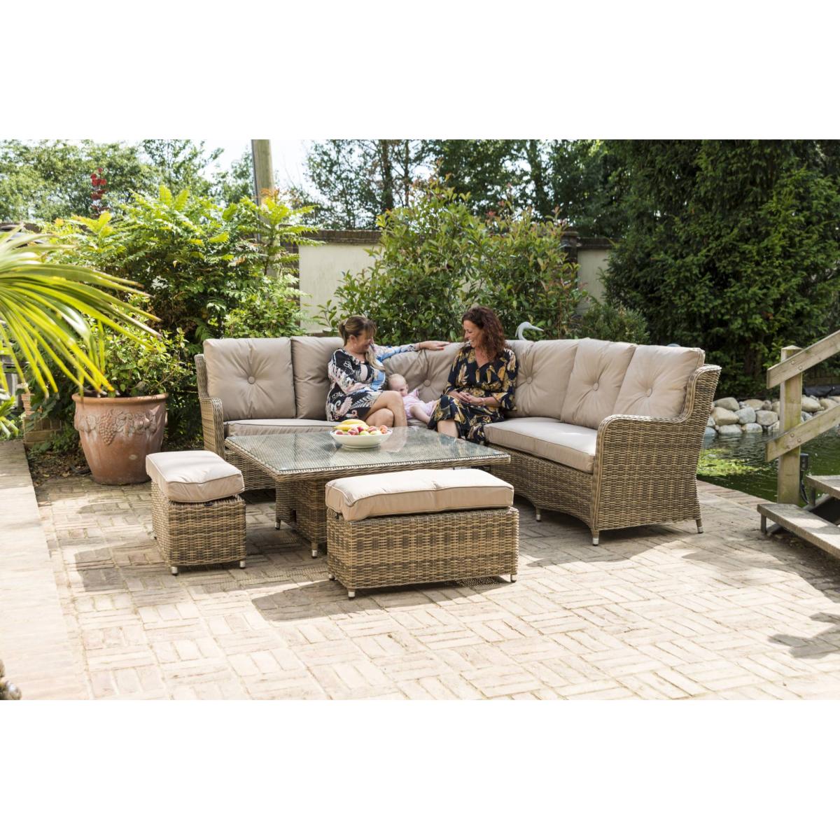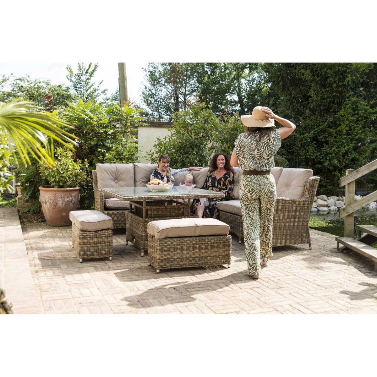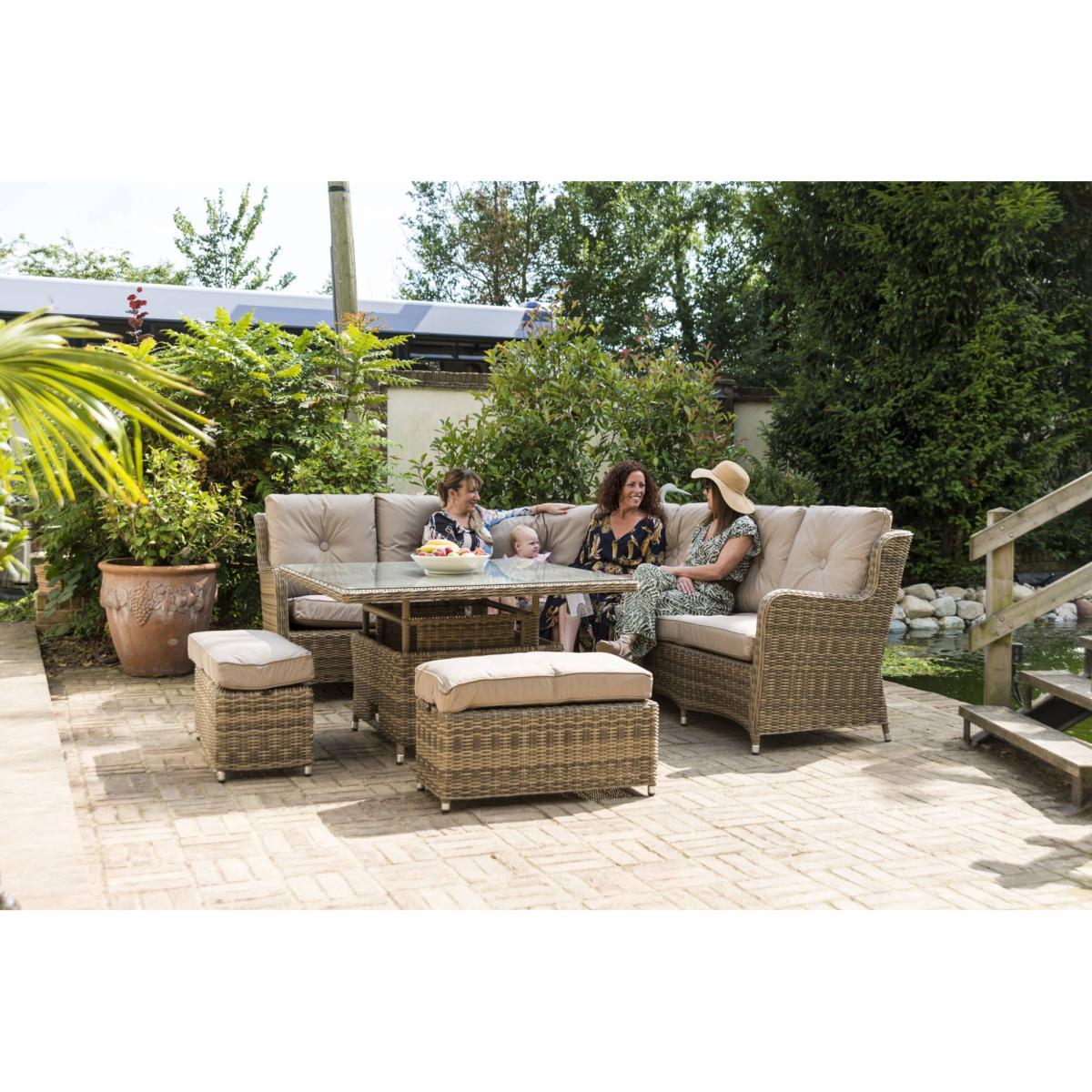 Katie Blake's Seville Garden Furniture Collection is fabricated using only the highest quality and long-lasting materials. With its classic looks, generous sized chairs and comfortably filled cushioning, it is as stylish as it is durable. The light and sturdy aluminium framework has a weather resistant synthetic resin weave. The Seville collection can be left outdoors permanently requiring no maintenance except a wash with warm soapy water. The Katie Blake Seville Large Corner Unit with Hi-Lo Table ensures relaxed outdoor dining with Katie Blake?s clever height-changing dining table. Leave it at coffee table height for comfortable lounging then adjust to the full height ready for a stylish dinner part. The set consists of a large corner unit, a 2-seater left sofa and a 2-seater right sofa with seat and back cushions and 2 footstools along with a 120cm x 120cm adjustable table. The weave is a classic multi-tonal natural colour with taupe cushions This set has a total footprint of 3m x 3m. Seville comes with a 10-year manufacturer's guarantee, but this is reliant on you using a Katie Blake Cover to protect your furniture. Without a cover, there is a 3-year warranty. Please note cushions and parasols, whilst shower resistant, must not be left outside permanently otherwise some deterioration will occur. All screens vary in colour reproduction and whilst every effort has been made to display the colour as accurately as possible it is for guidance only.