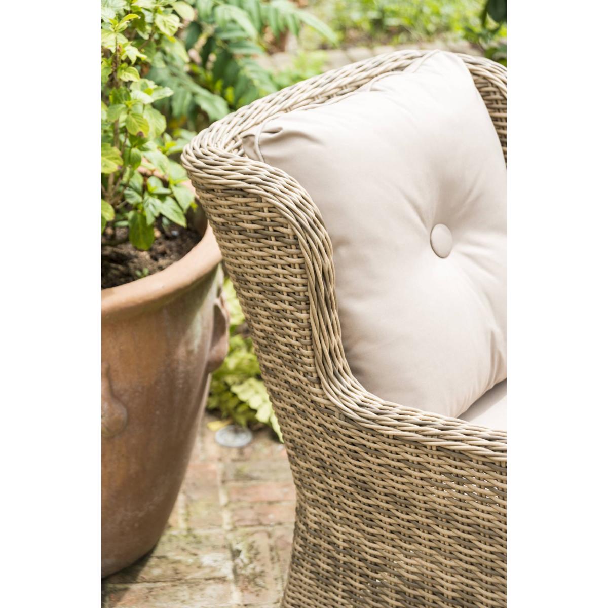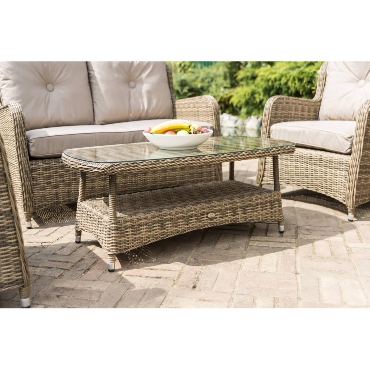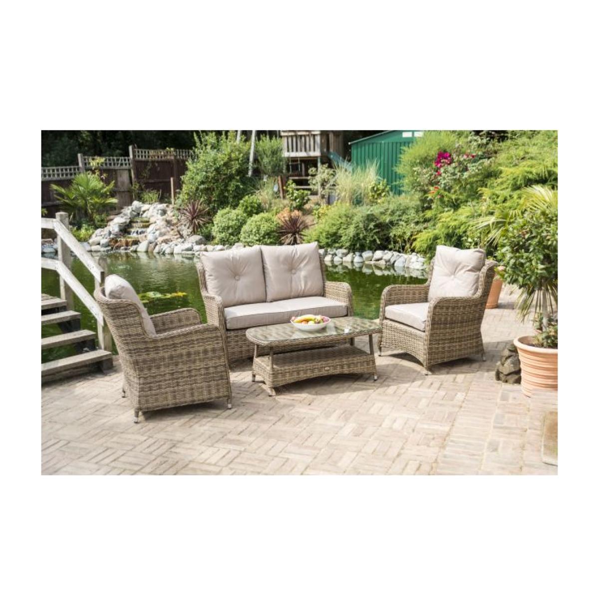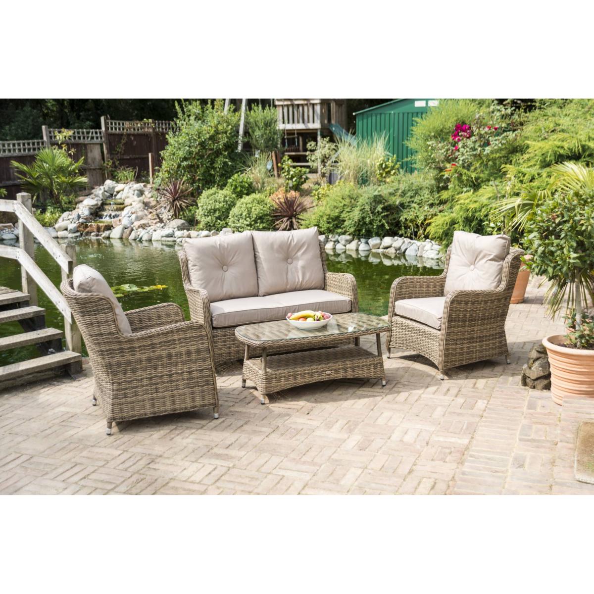 Katie Blake's Seville Garden Furniture Collection is fabricated using only the highest quality and long-lasting materials. With its classic looks, generous sized chairs and comfortably filled cushioning, it is as stylish as it is durable. The light and sturdy aluminium framework has a weather resistant synthetic resin weave. The Seville collection can be left outdoors permanently requiring no maintenance except a wash with warm soapy water. The Katie Blake Seville Sofa Seat Set includes a 2-seater sofa, 2 armchairs and a glass top coffee table. The weave is a classic multi-tonal natural colour with taupe cushions. Seville comes with a 10-year manufacturer's guarantee, but this is reliant on you using a Katie Blake Cover to protect your furniture. Without a cover, there is a 3-year warranty. Please note cushions and parasols, whilst shower resistant, must not be left outside permanently otherwise some deterioration will occur.