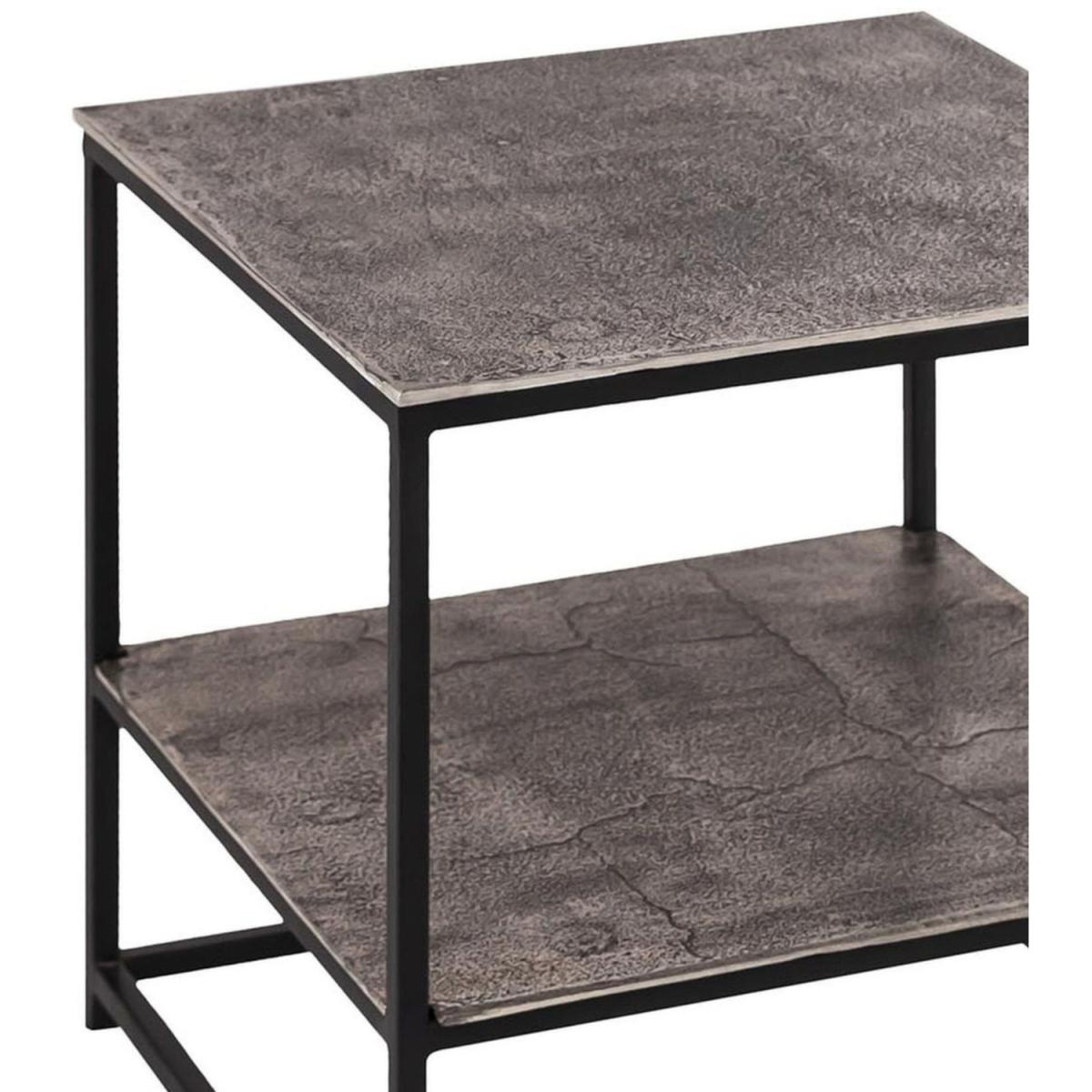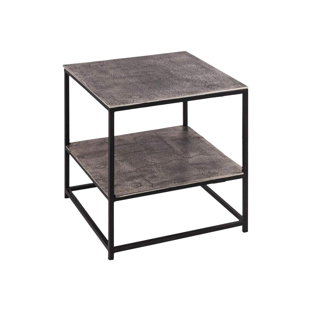This is the Farrah Collection Silver Side Table. Hand cast in aluminium, the casting process gives these pieces a pitted, textured surface which is both eye-catching and hardwearing. Designed with versatility of use in mind, the Farrah Furniture Collection comprises sturdy pieces which are also light enough to move around your home. A contrasting black painted frame finishes this side table's look and makes it a perfect fit with contemporary homes. Use this item's surface and stunning shelf space to display decorative accessories from the Farrah Collection. A fantastic choice for living rooms.