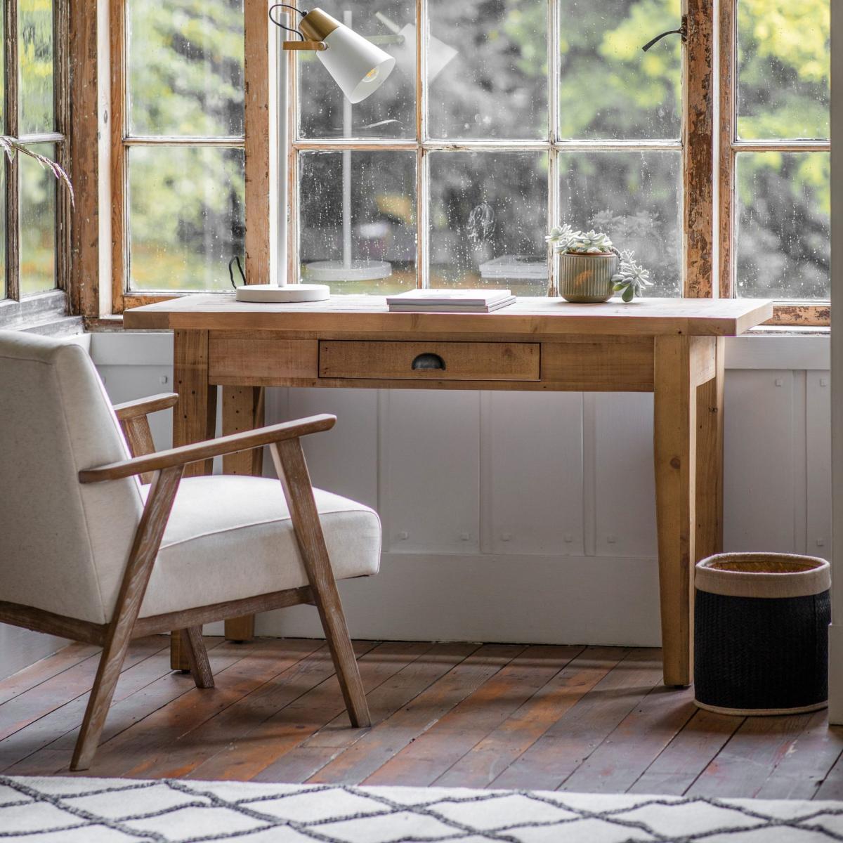 I love the rustic charm of the Katniss recycled pine desk - it brings an authentic, natural feel to any space, making it ideal for relaxed home offices or creative studios. Its sturdy construction and simple design leave plenty of styling options, whether you prefer a minimal look with sleek accessories or a more eclectic vibe with plants and colourful accents. This desk works particularly well in interiors that embrace natural materials and neutral tones, enhancing a cosy yet functional environment. Practical styling tips include keeping clutter minimal to showcase its natural beauty, adding a vintage-inspired lamp for task lighting, and pairing it with a comfortable, supportive chair to complete the workspace ensemble.