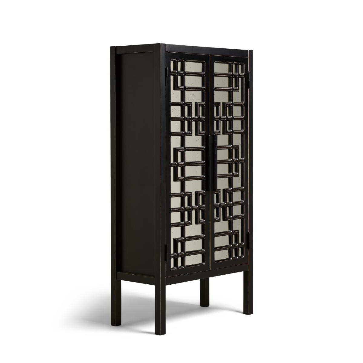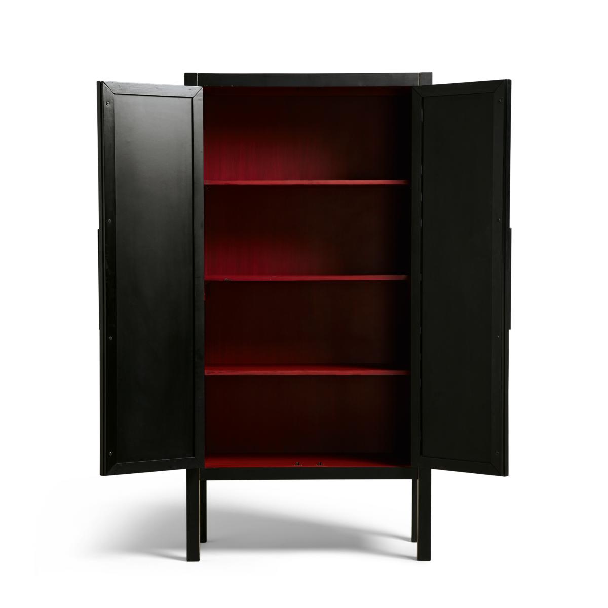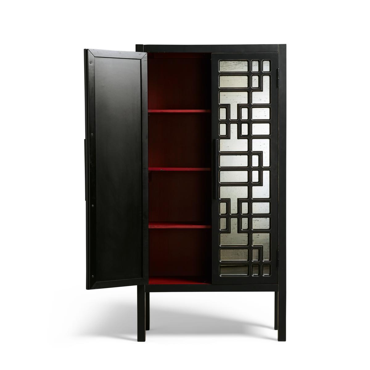 Drawing on the elaborate woodwork found in traditional Japanese architecture, the Katsura Cabinet is defined by bold lines and a dark, painted finish, which has a rubbed effect on the edges and corners. Behind its wooden façade sit mirrored panels that will reflect light while, inside, you'll find striking red-painted wooden shelves. There are three shelves, the middle of which is fixed and the other two are adjustable and removeable so that you can arrange the inside how you wish.
