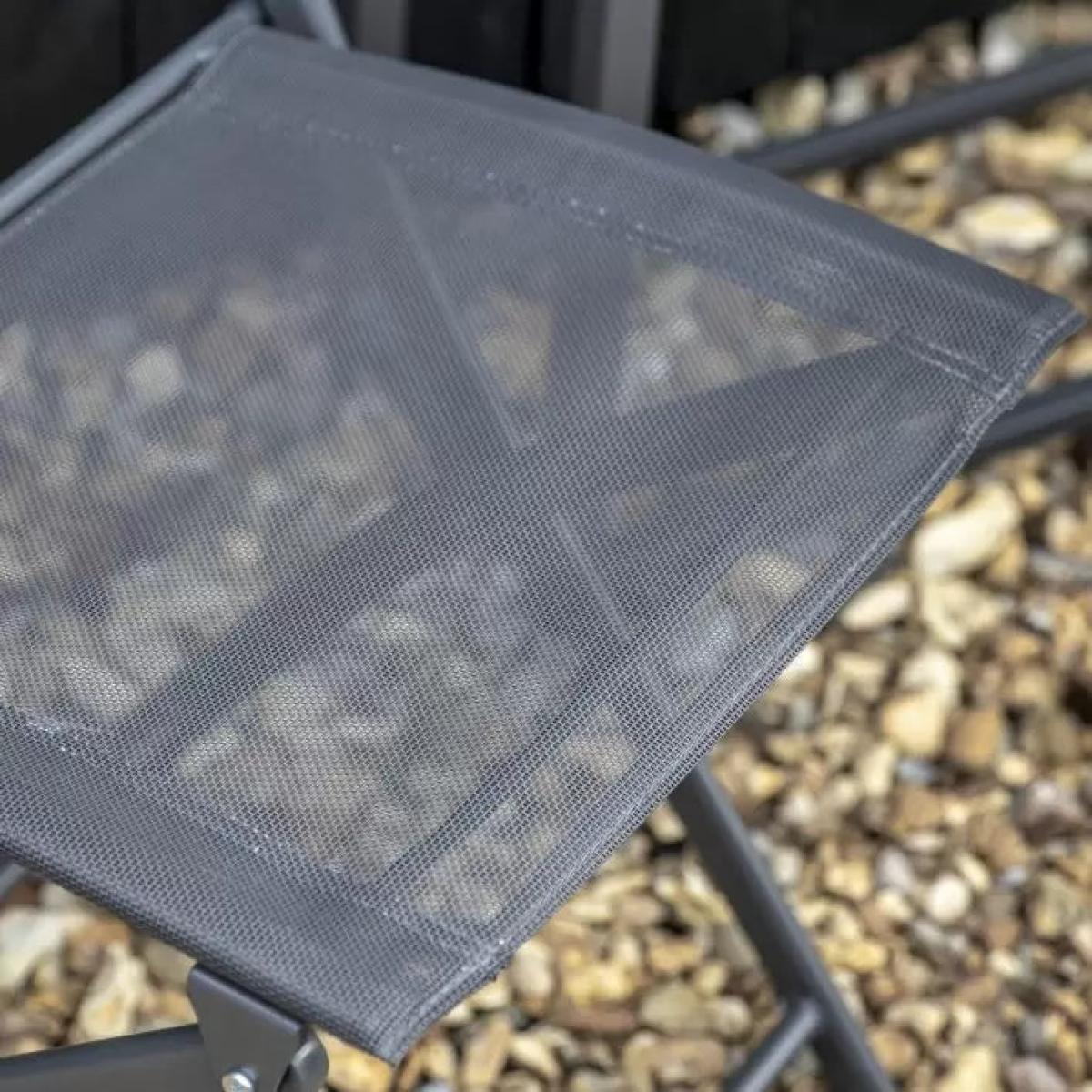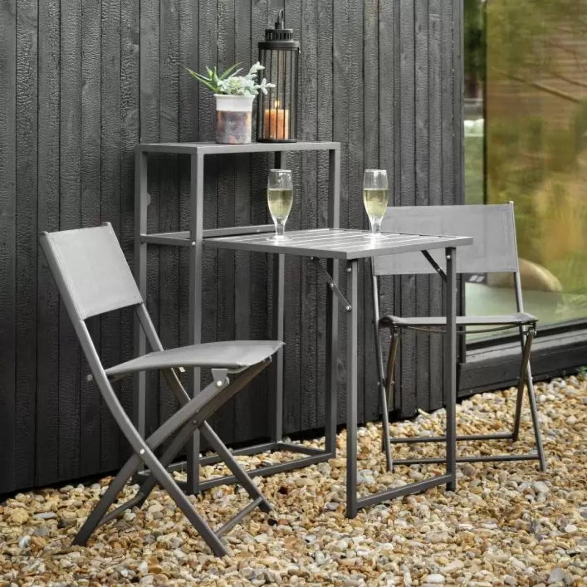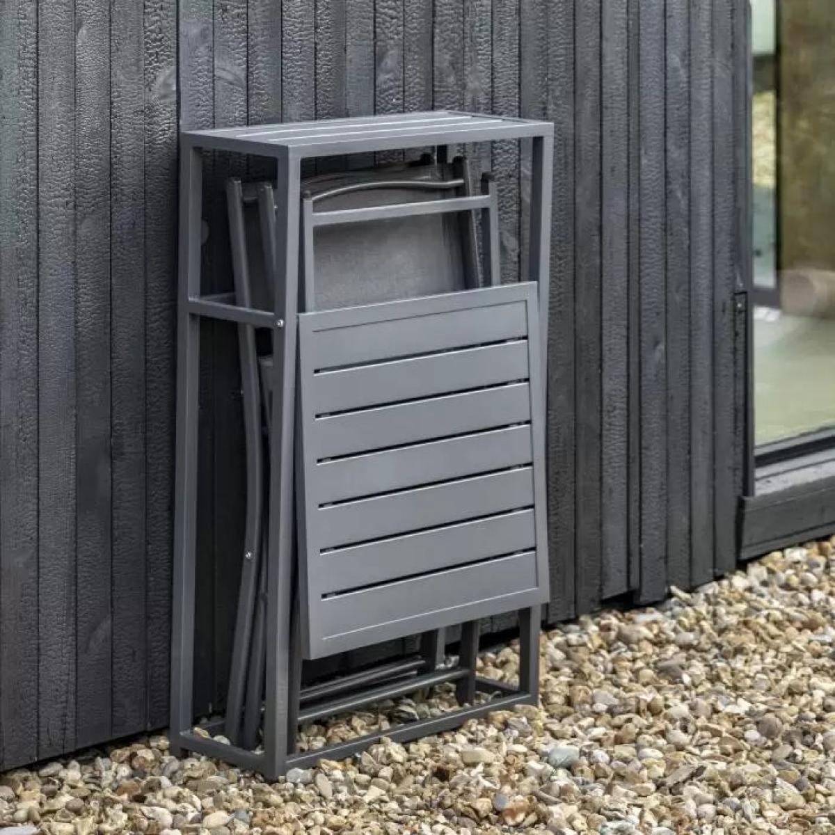 Perfect for balconies this practical and stylish set will let you make the most of your outdoor space no matter how small. With 2 foldable dining chairs and a multilayered foldable dining table providing extra shelf storage and space saving properties all in one this set is a great addition to your balcony. Made from dark grey powder coated steel with a Textilene seat and back on the chairs for extra comfort.