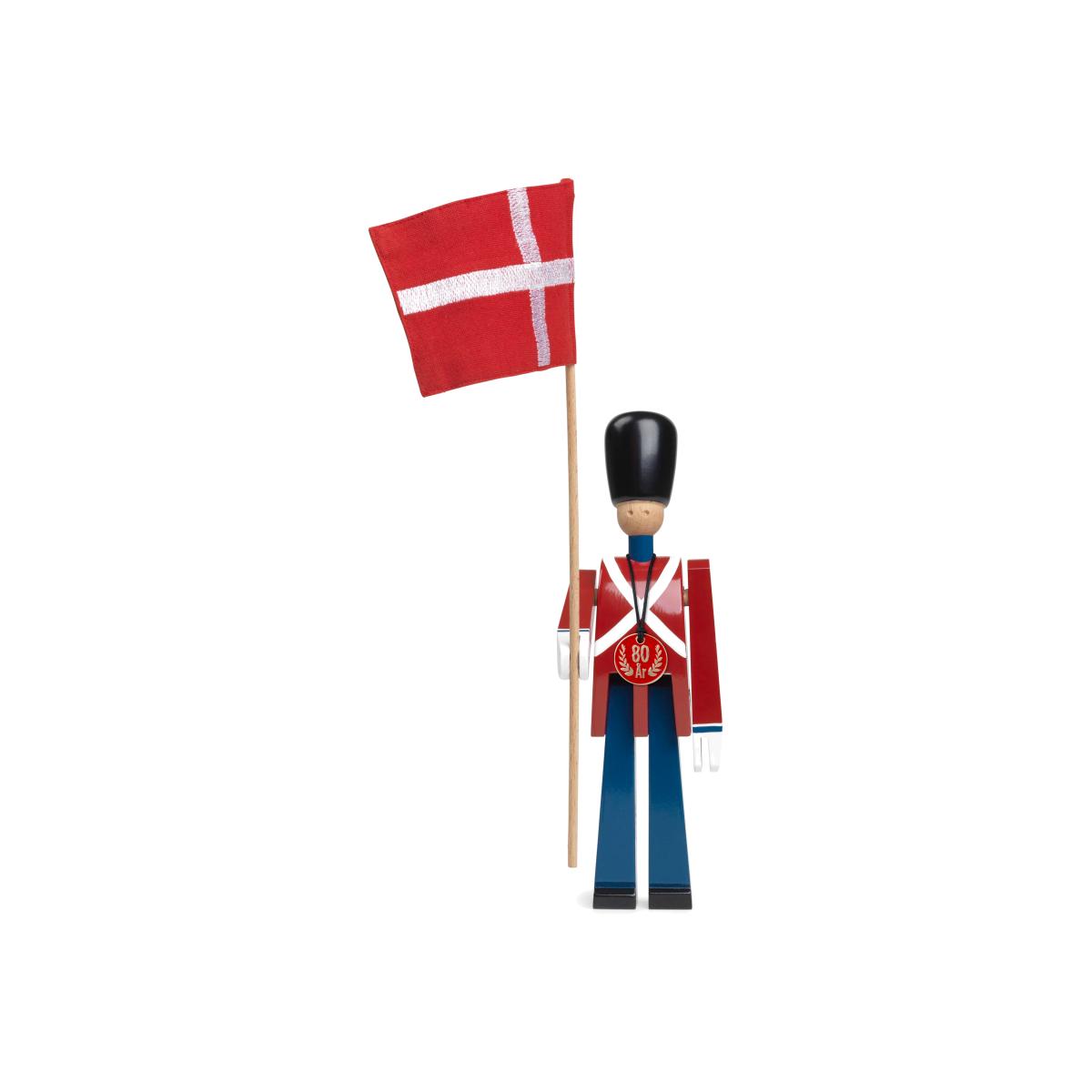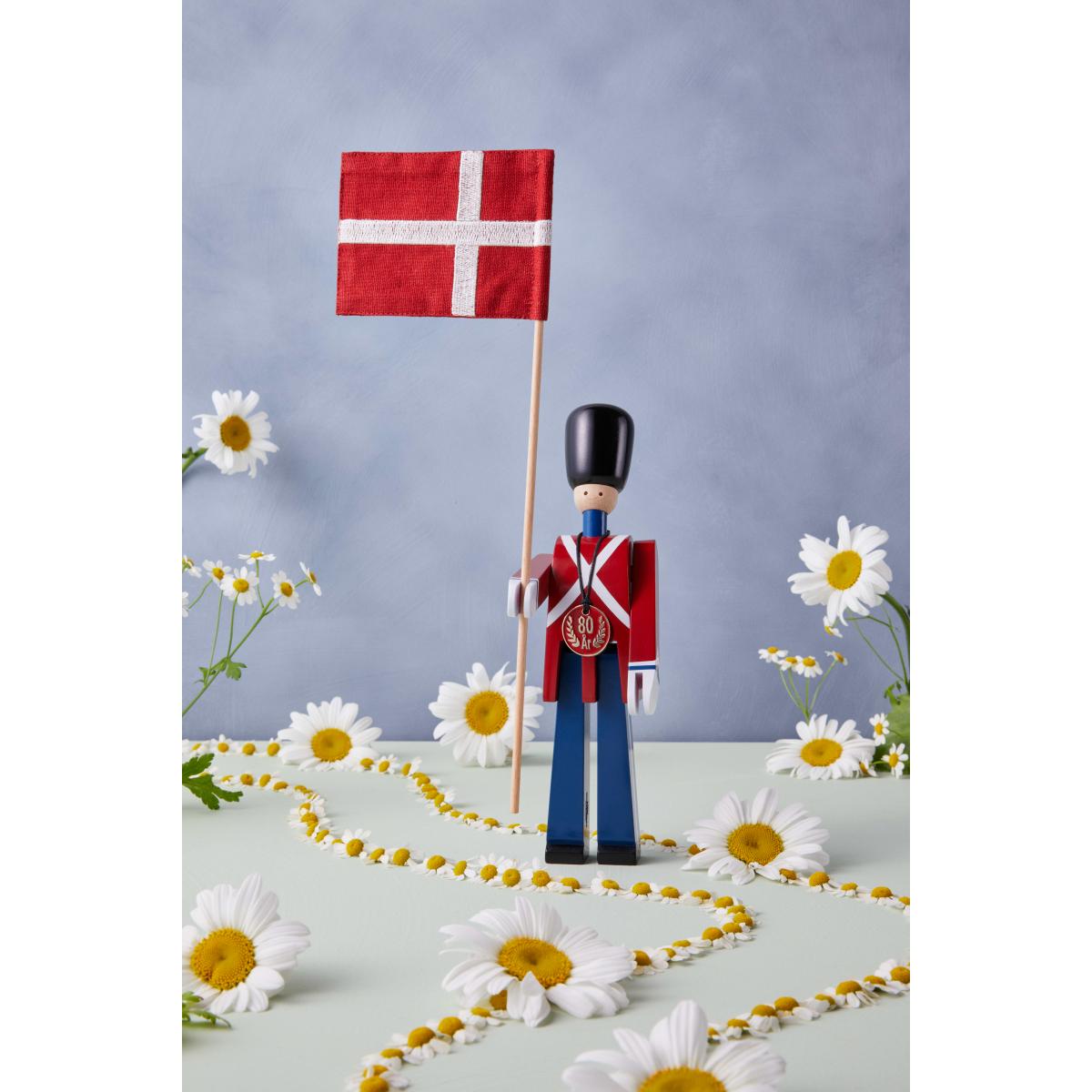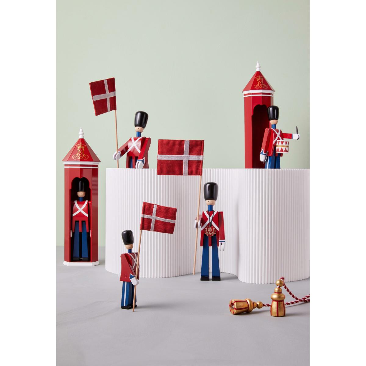 Kay Bojesen's guard with textile flag was sketched in 1942 and has represented Danish quality and design ever since. This guard is made from painted wood and a textile flag made from soft cotton. The guard is a playful figure that makes a beautiful gift as it also comes in a special gift box that carries Her Majesty The Queen of Denmark's seal. A timeless classic from the imaginative and creative world Kay Bojesen.