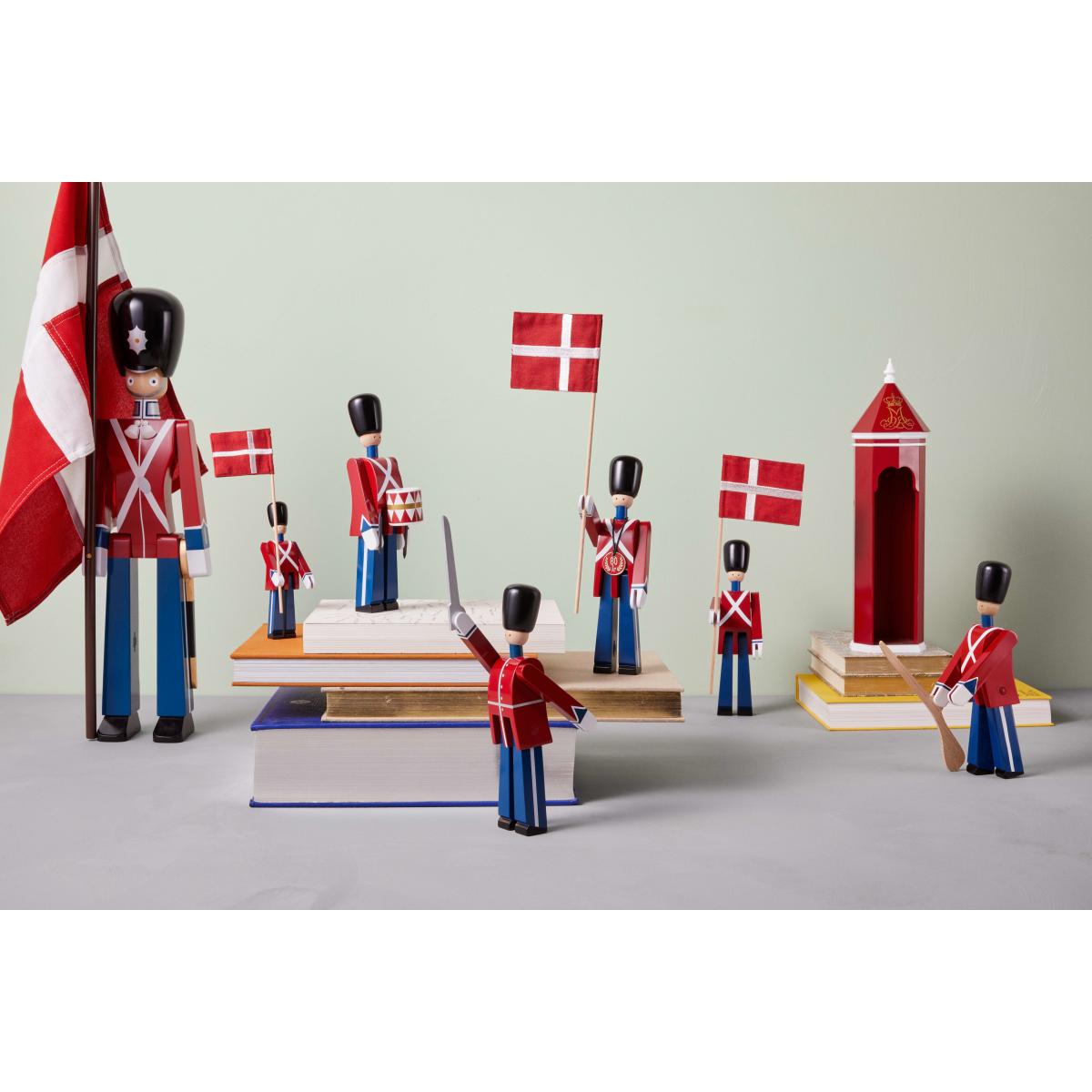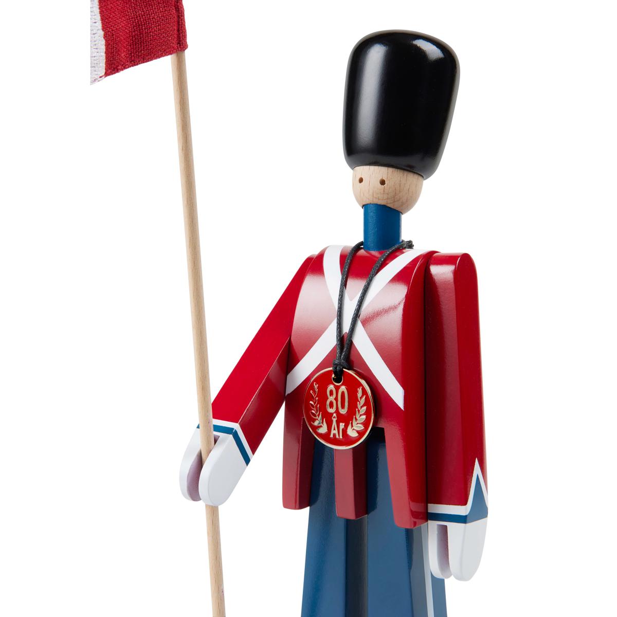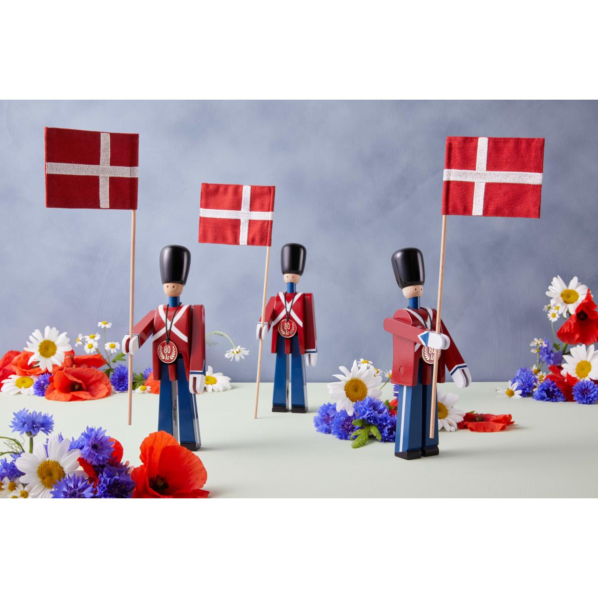 Kay Bojesen's guard with textile flag was sketched in 1942 and has represented Danish quality and design ever since. This guard is made from painted wood and a textile flag made from soft cotton. The guard is a playful figure that makes a beautiful gift as it also comes in a special gift box that carries Her Majesty The Queen of Denmark's seal. A timeless classic from the imaginative and creative world Kay Bojesen.