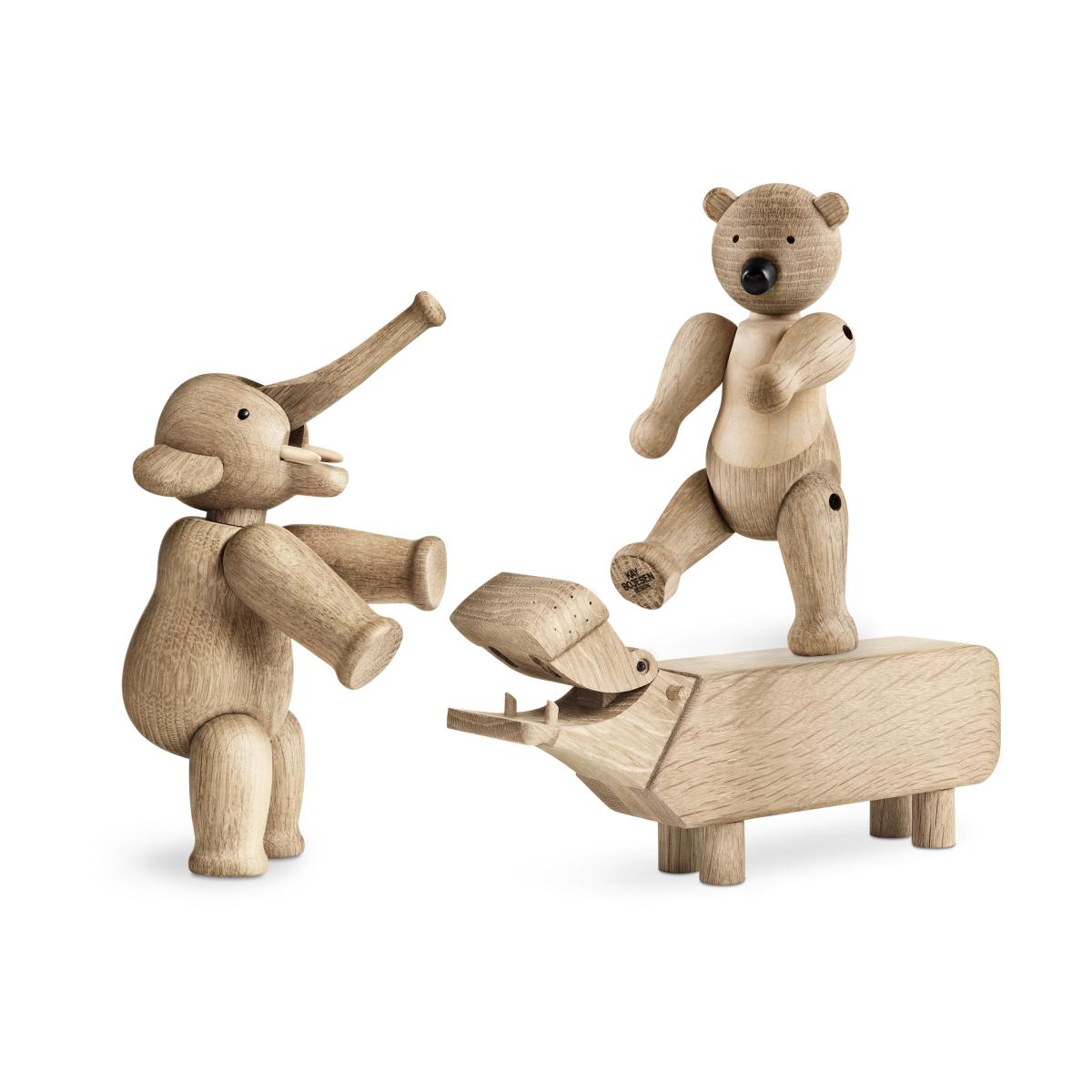 Kay Bojesen Liliput 3 pieces from Kay Bojesen consists of the charming bear, happy elephant, and playful hippopotamus in smaller versions. Made from FSC®-certified oak and maple, these wooden figures exude quality and craftsmanship. Perfect as a gift for the design lover.