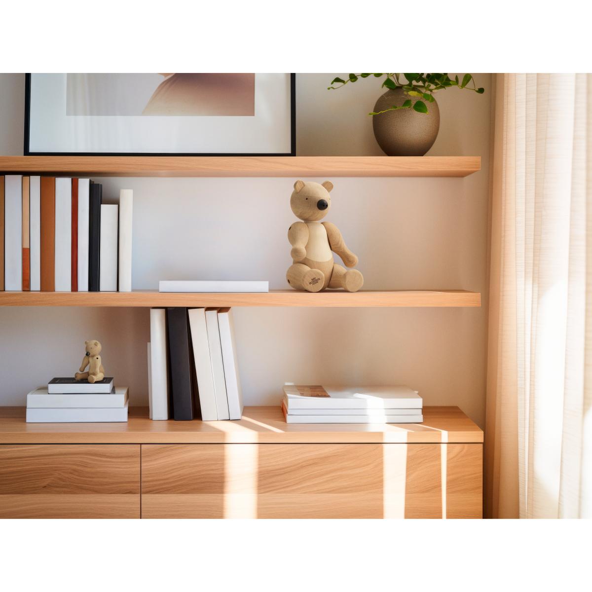 I love this wooden bear for its simple, timeless design and natural materials. It works particularly well in Scandinavian-inspired interiors or schemes that embrace natural textures and understated elegance. The large oak and maple finish gives it a warm, tactile quality that makes it a versatile sculpture for shelves, mantels, or side tables. Practical styling tips include pairing it with neutral coloured ceramics or layered textiles to create a cosy, curated look. It can also serve as a charming focal point in a children's room or a minimalist nursery, adding a sense of understated playfulness while remaining sophisticated.