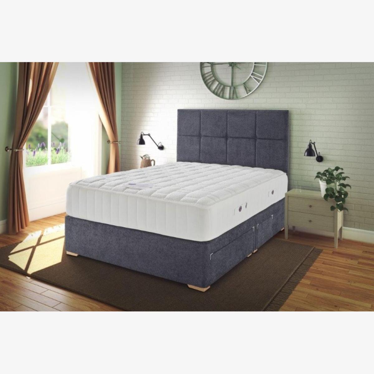 Note - The headboard pictured is not included but is available to purchase separately. The base or frame pictured in the image may not be representative of the specific base you require. Please contact us for more information, if needed. Kaymed Atlas Mattress & Divan Set Mighty Bed always deliver a firmer yet sumptuous feel, and are guaranteed to stay that way for many years. Our complimentary Mighty Bed divan base is reinforced and designed to withstand the vigours of hotel life, and are available in a wide range of striking fabrics and colours. Divan sets come with a standard 15-year manufacturing fault guarantee, so you will sleep sound knowing that you can enjoy your Mighty Bed for years to come. Sleep both sides to extend mattress life and performance - please turn and rotate regularly Choice of storage options Choice of base fabrics Mattress Depth - 30cm Divan Dimensions Single - 90cm (w) x 190cm (l) x 35cm (d) Small Double - 120 (w) x 190 (l) x 35cm (d) Double - 135cm (w) x 190cm (l) x 35cm (d) King - 150cm (w) x 200cm (l) x 35cm (d) Superking - 180cm (w) x 200cm (l) x 35cm (d) All screens vary in colour reproduction and whilst every effort has been made to display the colour as accurately as possible it is for guidance only.
