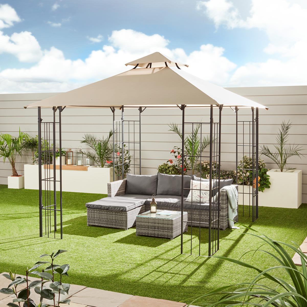 If you are looking for shelter from the sun and a luxurious outdoor space to relax in, this KD Athens Steel Gazebo is an excellent choice. This beautiful gazebo is perfect for al fresco dining, enjoying a refreshing drink, or socializing with family and friends, all while being protected from the sun's harmful rays and helping you stay cool. With a sturdy steel frame and a grid design complemented by a subtle beige cover, this gazebo will look great alongside your garden greenery. Plus, it's easy to assemble, making it a practical choice for any outdoor.