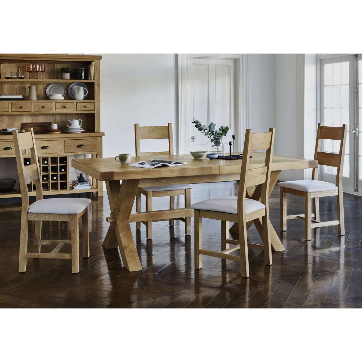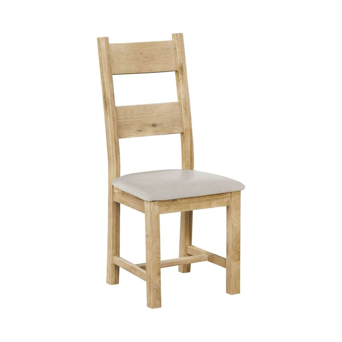 Beautifully crafted with gently curved lines, the Keating slatted back chair combines traditional chair design with a smooth modern finish.;Made from solid pale oak with a wonderful natural grain, this chair features a supportive back with three broad slats, squared-edged legs, and an H-frame base for extra strength.;Built to last, this chair is finished with a light oil which helps preserve and enhance the beautiful oak from which it is made. A comfortably-cushioned seat pad, upholstered in a soft yet hardwearing oatmeal beige-coloured fabric, completes this piece.;The Keating slatted chair is one of three seating options in the Keating collection of living and dining furniture. All three styles – the Keating slatted chair, the Keating button back chair, and the Keating bench – are designed to be mixed and matched with any of the Keating dining tables. The range also includes a wide selection of storage and occasional pieces.;Did you know? Natural wood has unique markings, with some colour variation. The colour and tone of wood improves with age.