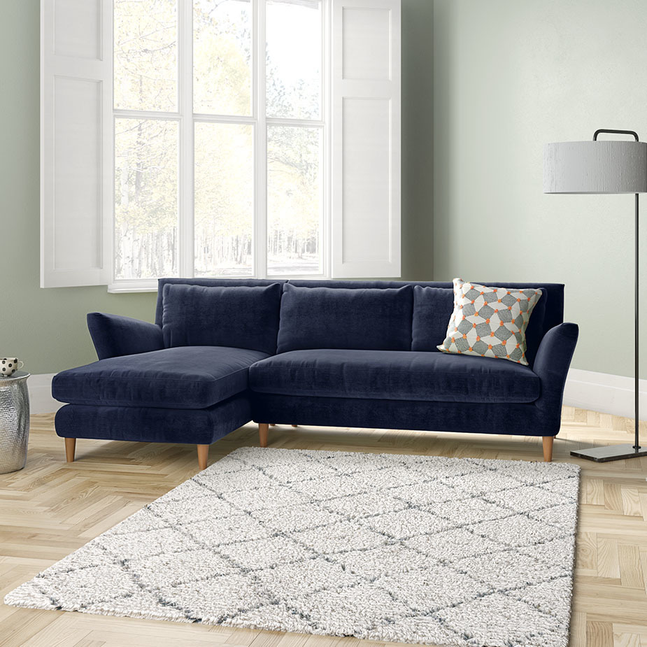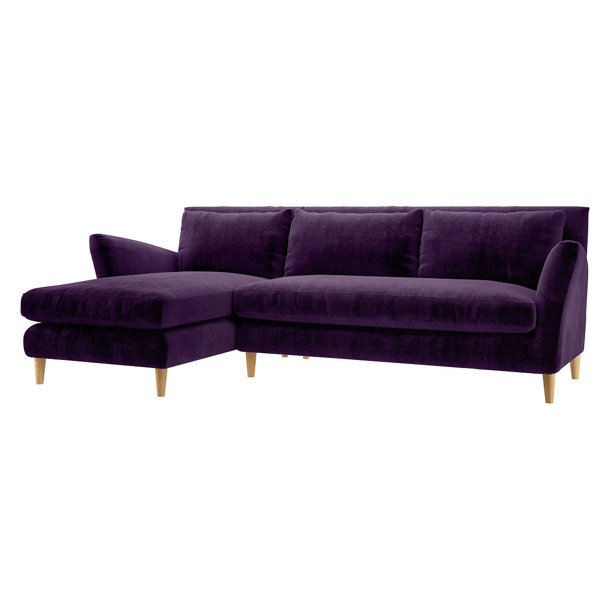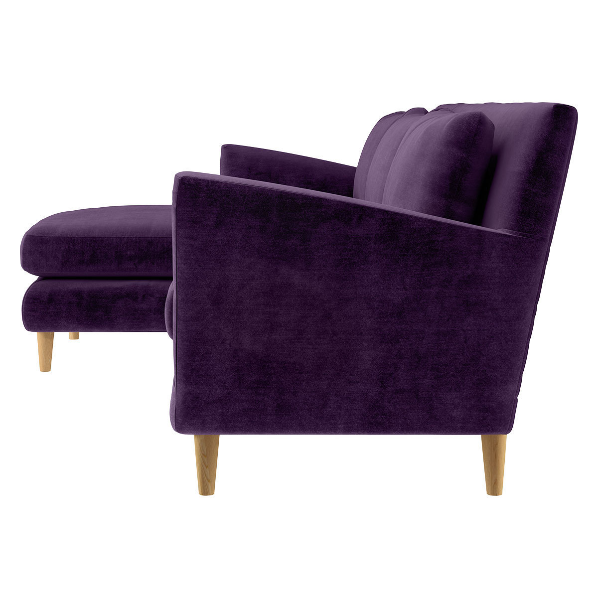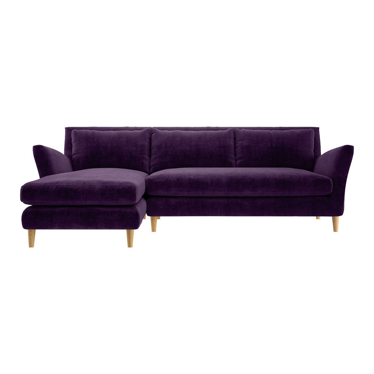 The glamorous Keele purple velvet left-arm 4 seater chaise sofa is a curvy, feminine design with welcoming flared arms and soft, plump cushions. Made in Italy, the sumptuous sofa has sloping arms to help you relax and offers exceptional back support due to its elegant high padded back. Feather-fibre filled back cushions, and feather and fibre-wrapped foam seat cushions ensure a long, comfortable sit. Keele is made to order and is available in a variety of configurations, in 2 fabrics and a choice of colours. The oak legs unscrew for easier access into your home, but please read our Sofa Measuring Guide to ensure this inviting design will fit nicely in your space.