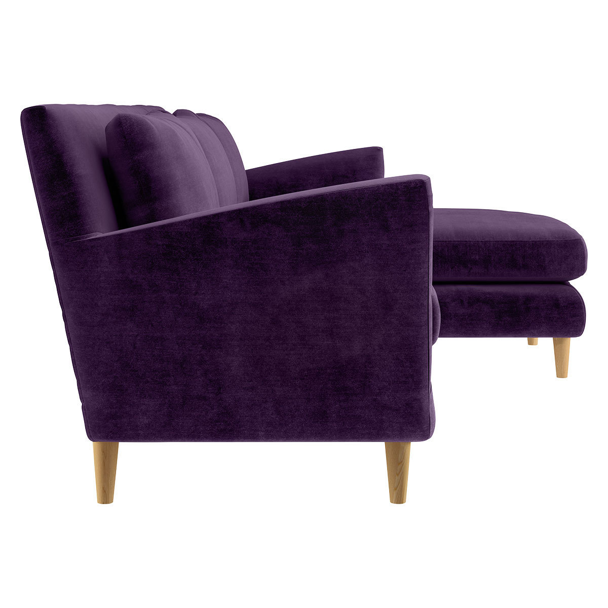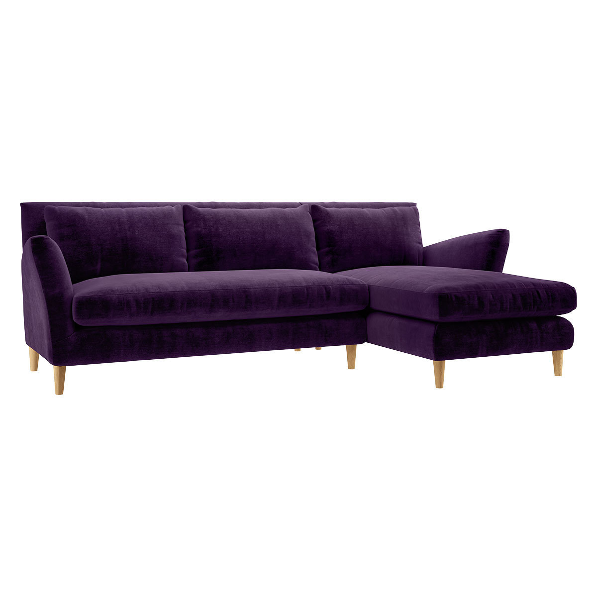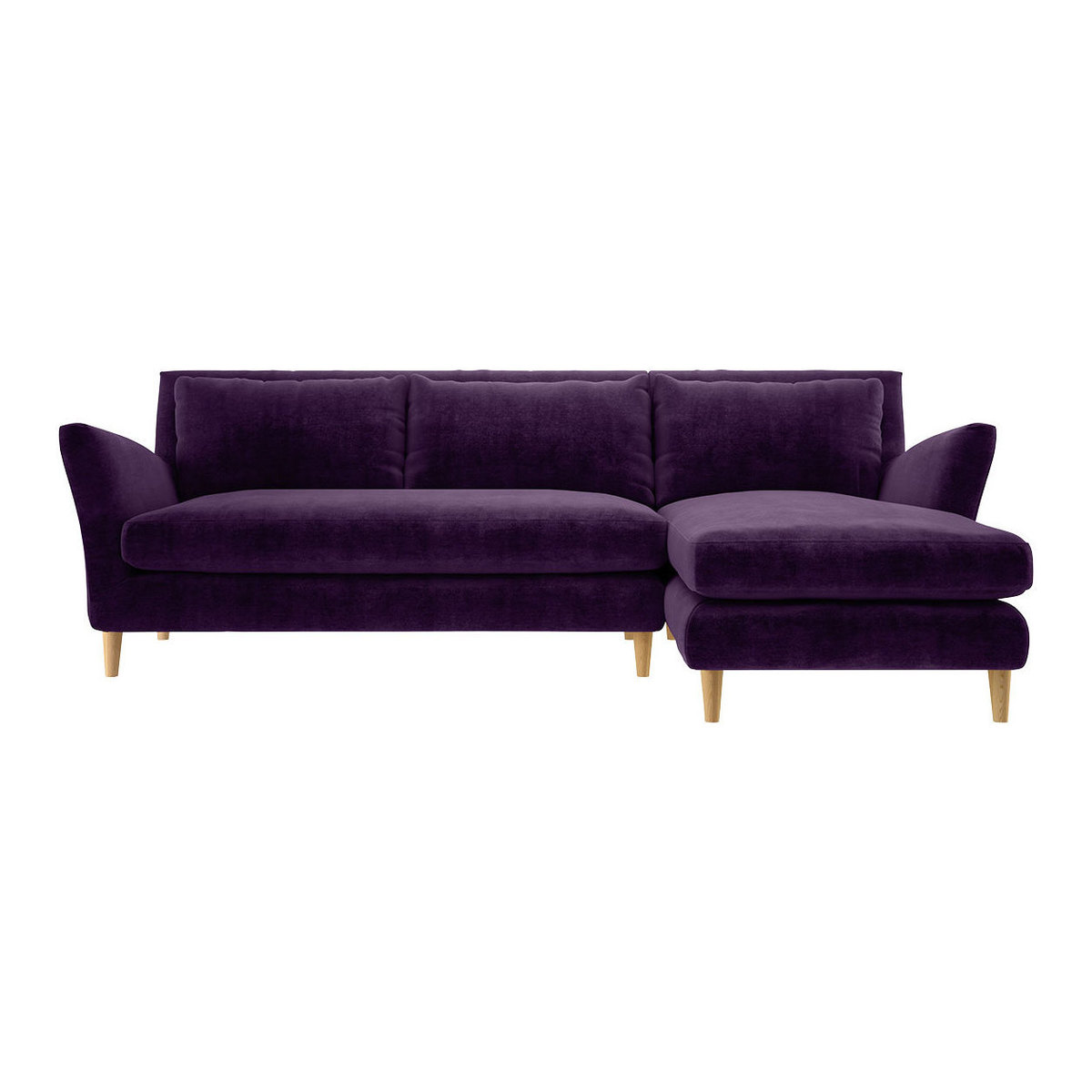 The glamorous Keele purple velvet right-arm 4 seater chaise sofa is a curvy, feminine design with welcoming flared arms and soft, plump cushions. Made in Italy, the sumptuous sofa has sloping arms to help you relax and offers exceptional back support due to its elegant high padded back. Feather-fibre filled back cushions, and feather and fibre-wrapped foam seat cushions ensure a long, comfortable sit. Keele is made to order and is available in a variety of configurations, in 2 fabrics and a choice of colours. The oak legs unscrew for easier access into your home, but please read our Sofa Measuring Guide to ensure this inviting design will fit nicely in your space.
