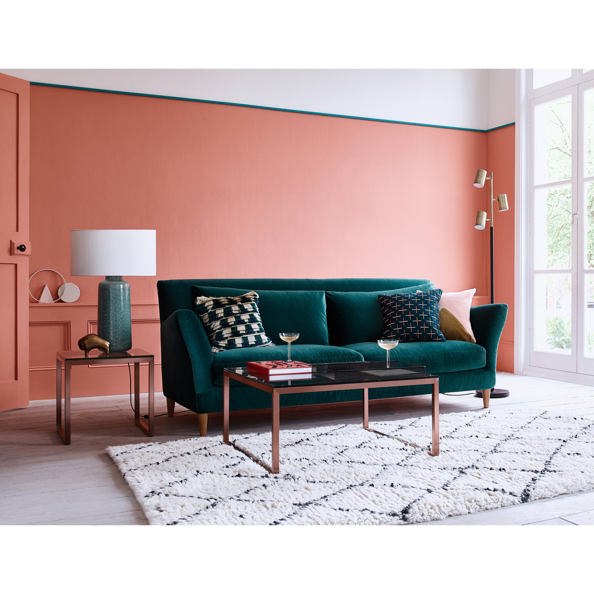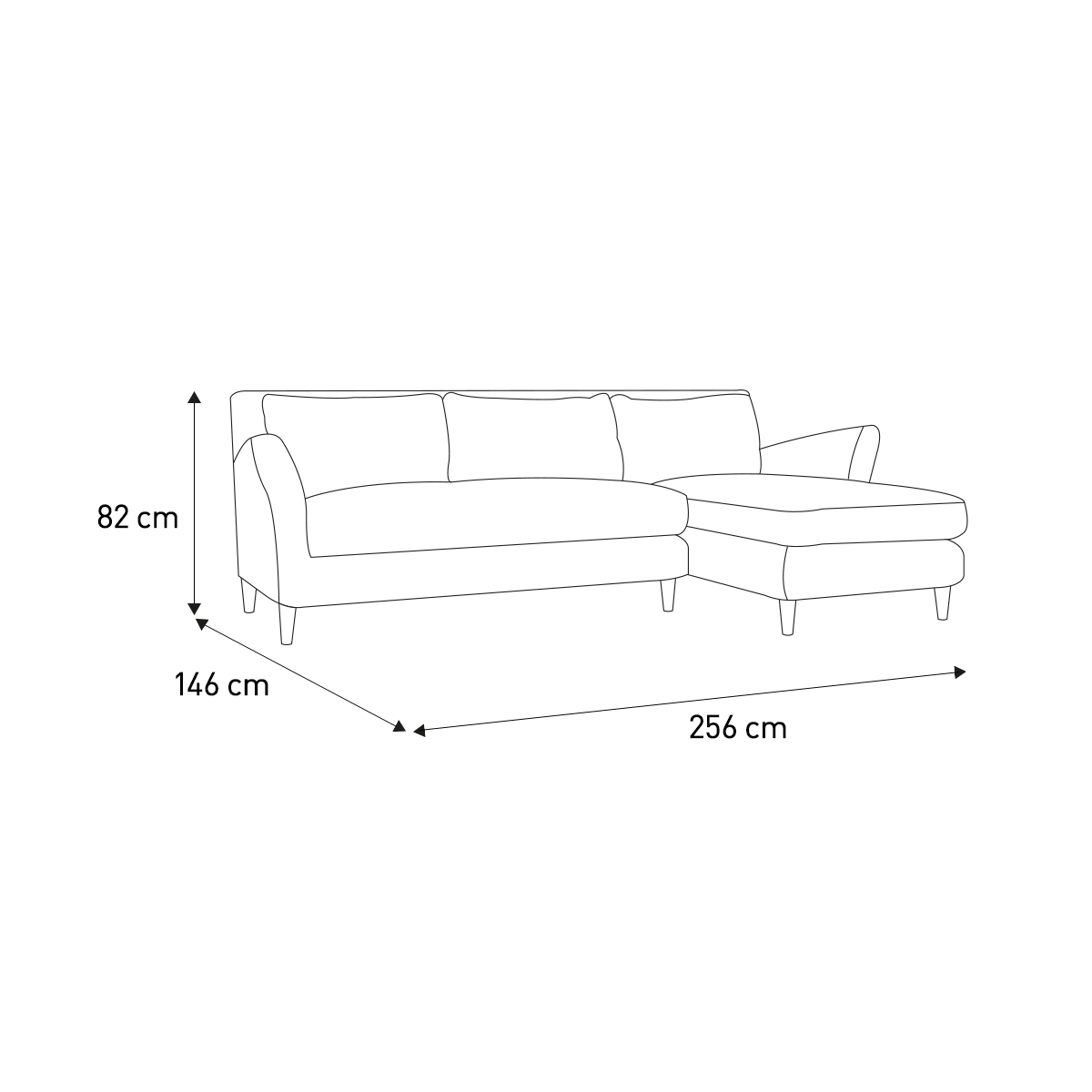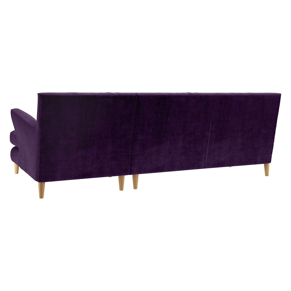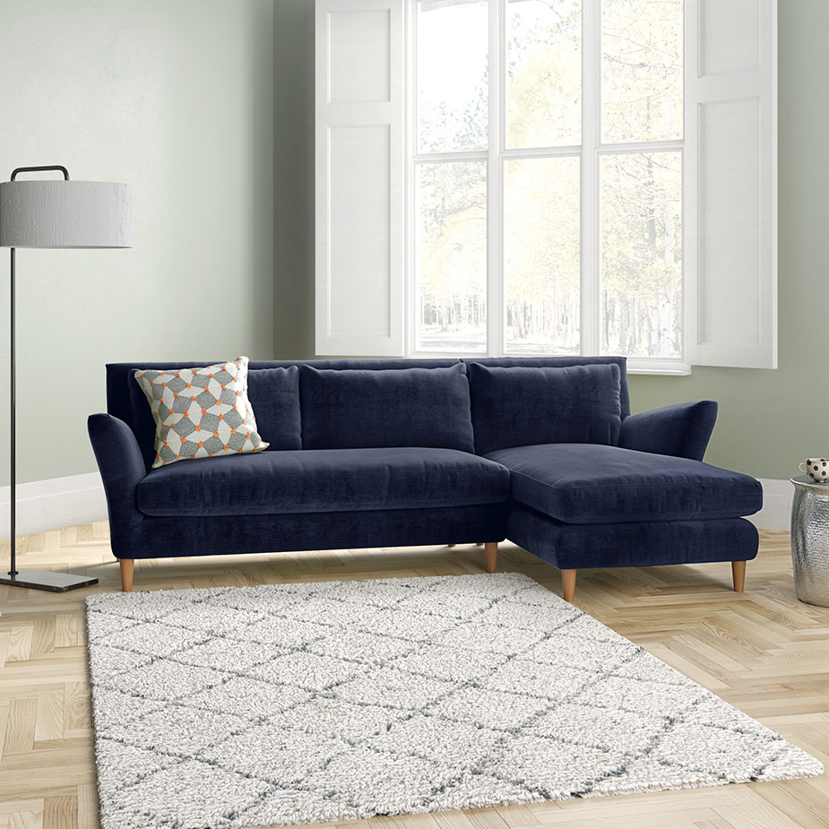 The glamorous Keele purple velvet right-arm 4 seater chaise sofa is a curvy, feminine design with welcoming flared arms and soft, plump cushions. Made in Italy, the sumptuous sofa has sloping arms to help you relax and offers exceptional back support due to its elegant high padded back. Feather-fibre filled back cushions, and feather and fibre-wrapped foam seat cushions ensure a long, comfortable sit. Keele is made to order and is available in a variety of configurations, in 2 fabrics and a choice of colours. The oak legs unscrew for easier access into your home, but please read our Sofa Measuring Guide to ensure this inviting design will fit nicely in your space.