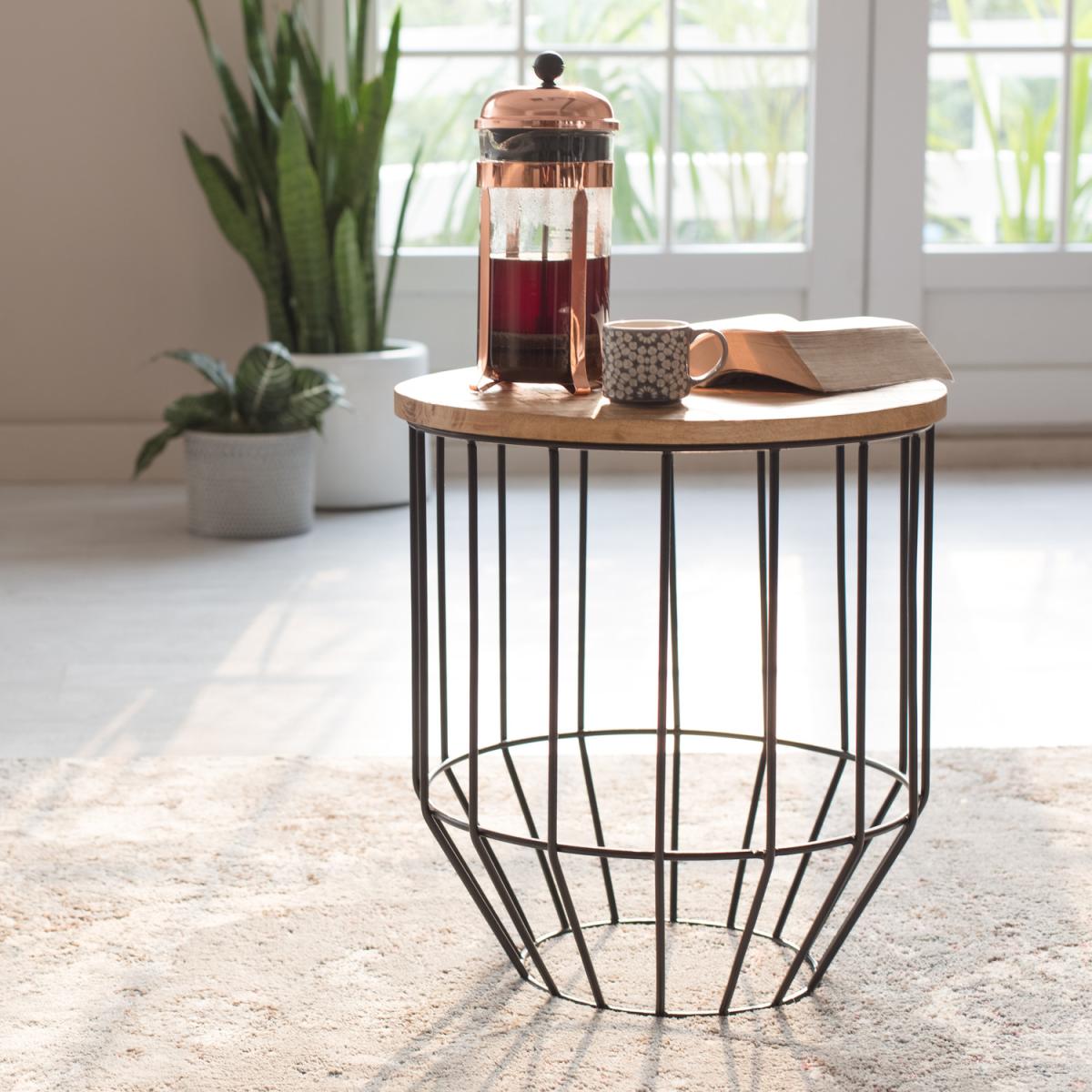 ALL ABOUT THE BASEA statement metal base Yes please. Mango wood au naturel Absolutely. An unexpected mix of materials this side table racks up all style points in our book Skilled artisans hand turn metal into a statement structure that holds up a chunky circular wooden top and looks really good doing it. It is the perfect perch for your drinks lamps books really anything you want close at hand. Crafted from real wood the solid top super durable retains its organic energy and warmth. It is like a small connection to the natural world a detail we love