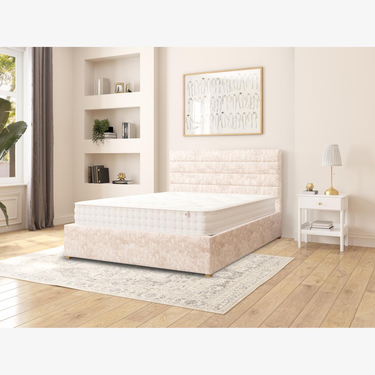 Quality upholstered ottoman storage bed, hand crafted in the UK. Each headboard is constructed with deep foam padding perfect for sitting up in bed and reading. We believe quality has no short cuts, meaning all our designs are hand upholstered by our skilled craftsmen. Our UK ottoman design features chunky upholstered panels, which means it is built to last. Quality sprung slats improve comfort and mattress lifespan. The easy lift ottoman mechanism is supported with quality gas pistons, enabling the storage to be accessed with minimal effort. Once the ottoman is elevated it will hold position, allowing hands free access to storage. Our ottomans offer the perfect storage solutions for rooms with no or limited space with a spacious storage area of approximately 28cm. The fabric base attaches to the underside of the bed, protecting your stored items. Each ottoman is finished with hardwood feet which have been hand turned and varnished.