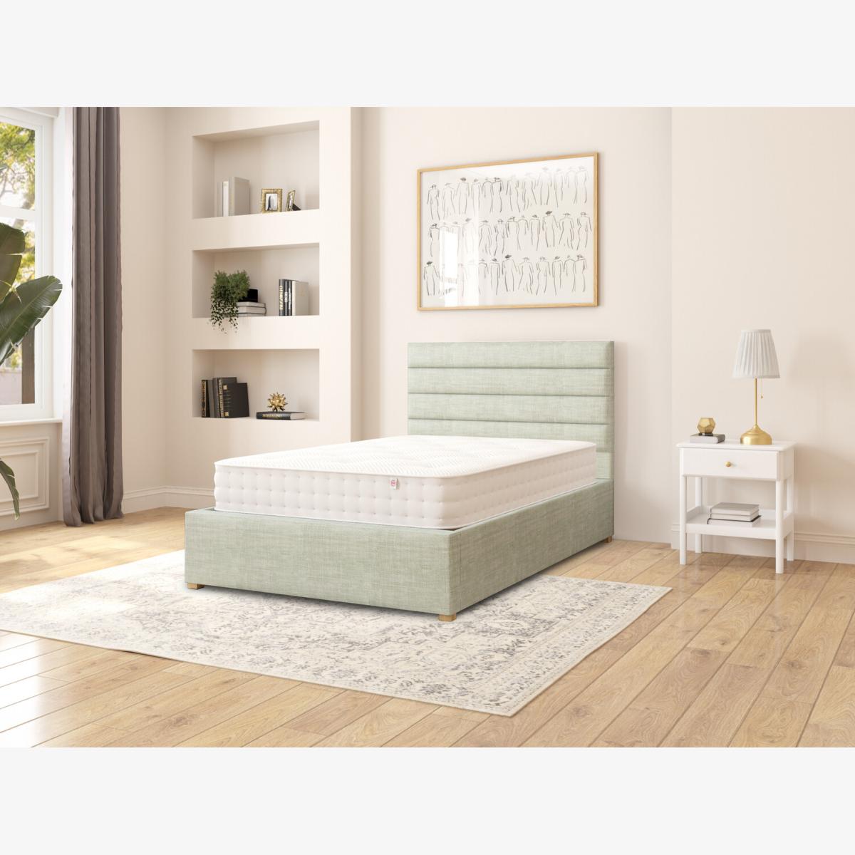 Quality upholstered ottoman storage bed, hand crafted in the UK. Each headboard is constructed with deep foam padding perfect for sitting up in bed and reading. We believe quality has no short cuts, meaning all our designs are hand upholstered by our skilled craftsmen. Our UK ottoman design features chunky upholstered panels, which means it is built to last. Quality sprung slats improve comfort and mattress lifespan. The easy lift ottoman mechanism is supported with quality gas pistons, enabling the storage to be accessed with minimal effort. Once the ottoman is elevated it will hold position, allowing hands free access to storage. Our ottomans offer the perfect storage solutions for rooms with no or limited space with a spacious storage area of approximately 28cm. The fabric base attaches to the underside of the bed, protecting your stored items. Each ottoman is finished with hardwood feet which have been hand turned and varnished.