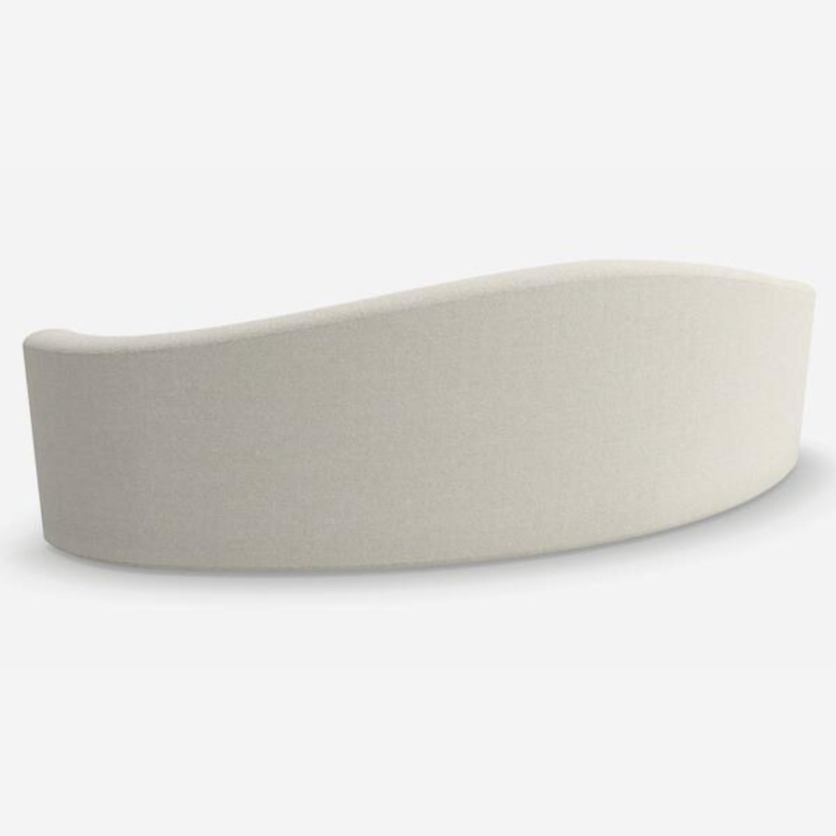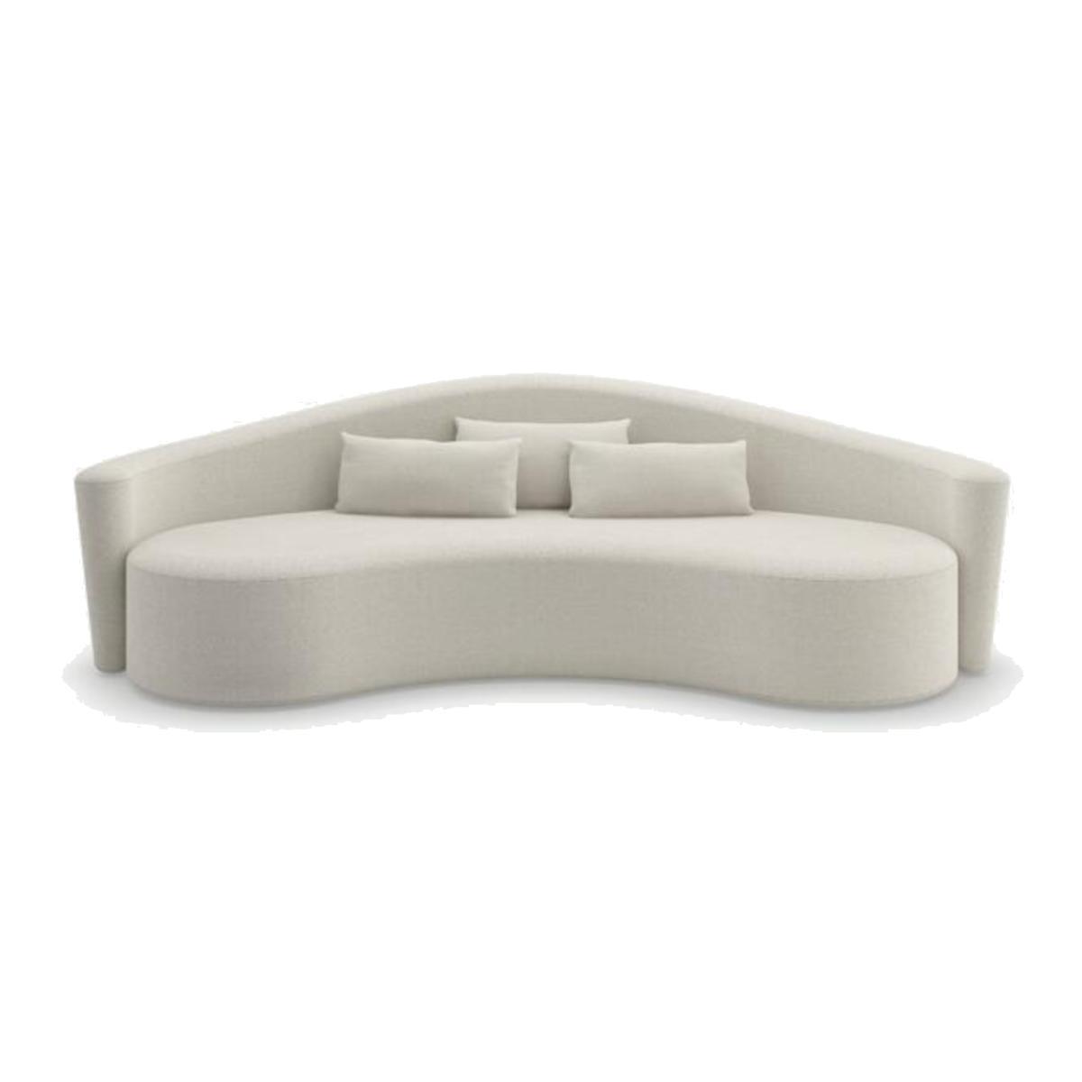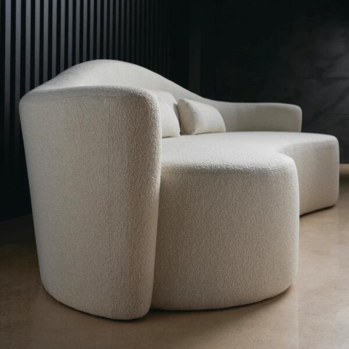 Chic curved sofa in off-white bouclé by Kelly Hoppen. Defined by soft, curving lines and a sleek silhouette, Ellipse embodies timeless elegance with a playful side. Its creamy bouclé fabric adds textural dimension, complemented by slim scatter cushions for comfort and layering. This sofa makes a chic statement, ideal for modern interiors.