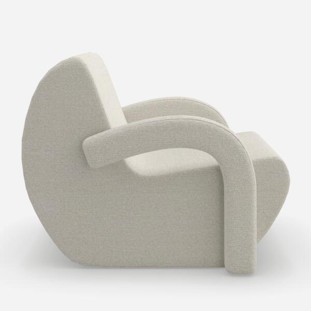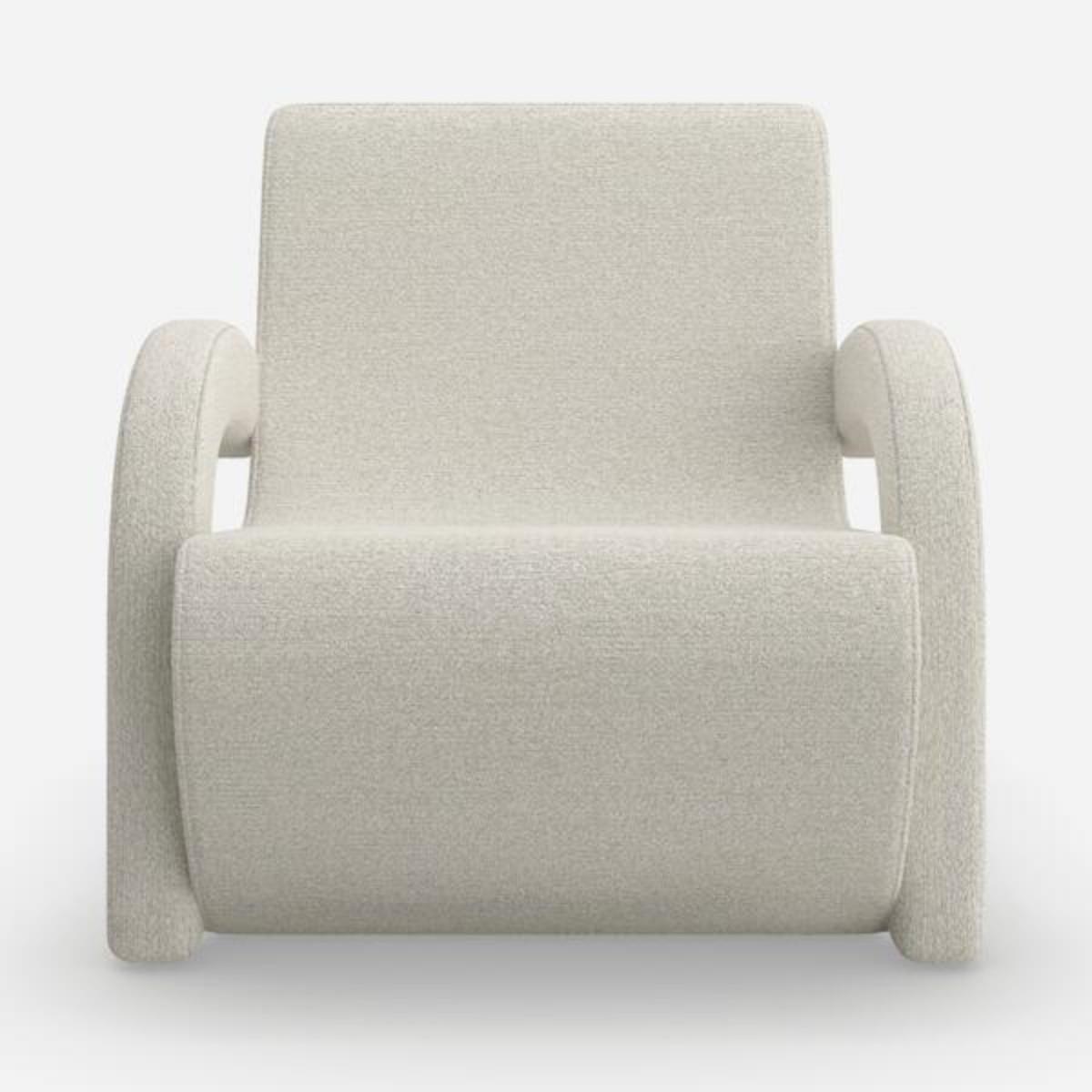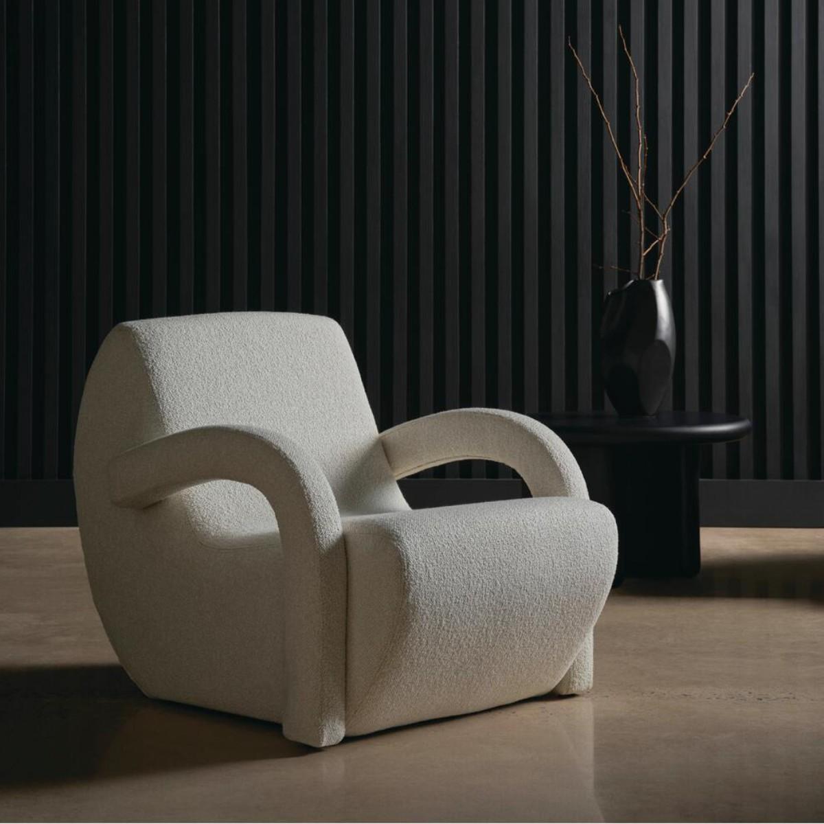Curved accent chair in off-white bouclé by Kelly Hoppen. Elegant curves and a sleek arc shape seamlessly blend with a softly textured bouclé fabric for a look that invites calm and comfort. A versatile piece for any interior, Leo's organic form introduces fluidity and a sense of unparalleled serenity.