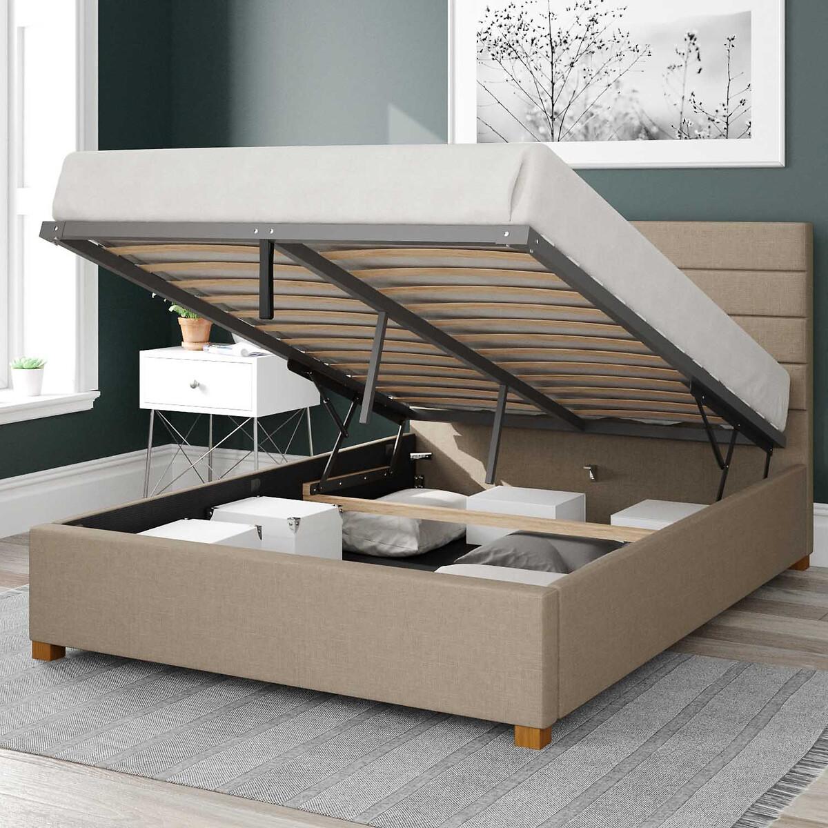 Modern and contemporary, the Kelly exudes clean lines and elegant style with a deep padded headboard upholstered in a clean crisp linen fabric. A well-proportioned compartment provides storage for clothes, shoes and bedroom clutter, and a fabric dust protection sheet attaches to the underside of the bed to keep your items neat and clean. Sturdy sprung slats create a base supportive of a good nights sleep which also promotes air circulation. Solid and square hardwood feet, hand-turned for a traditional touch, add a refined and elegant finish. Product details:• Ottoman storage bed• Modern horizontal headboard design, upholstered by hand• Upholstered in a plain weave linen. A tight and robust flat weave creates a classic look which is strong and durable• End-lift mechanism for convenient access• Large storage area with fabric dust protection sheet base• Durable gas pistons ensure the storage area remains securely open for hands-free use• Solid hand-turned hardwood feet• Sprung slatted base• Foam fillings• Made to order and expertly hand finished right here in the UK• Assembly required (2 person recommended)• Mattress not included• 12 month manufacturers warranty• Care advice:Wipe clean with a soft cloth Composition• Upholstery - Eire Linen (100% polyester)• Fillings - Foam• Frame - Chipboard, Plywood, MDF, Steel. This product will be dispatched by one of our trusted suppliers. You’ll be contacted by their selected courier about your delivery. Please note this item will be delivered to your doorstep. Please note that this item cannot be delivered to the Offshore Islands, Northern Ireland or the Republic of Ireland. Product Dimensions. Single• Total Dimensions - H112cm x W100cm x L209cm• Storage Area Dimensions - W94 cm x L193 cm x H26 cm• Suitable for use with standard single mattresses (90cm x 190cm)Small Double• Total Dimensions - H112cm x W130cm x L209cm• Storage Area Dimensions - W122 cm x L193 cm x H26 cm• Suitable for use with standard small double mattresses (120cm x 190cm)Double• Total Dimensions - H112cm x W147cm x L209cm• Storage Area Dimensions - W141 cm x L193 cm x H26 cm• Suitable for use with standard double mattresses (135cm x 190cm)King• Total Dimensions - H112cm x W160cm x L219cm• Storage Area Dimensions - W154cm x L204 cm x H26 cm• Suitable for use with standard king mattresses (150cm x 200cm)Super King• Total Dimensions - H112cm x W190cm x L219cm• Storage Area Dimensions - W184 cm x L204 cm x H26 cm• Suitable for use with standard king mattresses (180cm x 200cm)Other dimensions• Headboard Height - 110 cm• Footboard Height: 30cm• Underbed Clearance: 5cm• Ottoman lift mechanism functions with a mattress with weight of up to 60 kg. Package DimensionsSingle:. Parcel 1 - 140cm x 113cm x 12cm, Weight: 12kg Parcel 2 - 212cm x 32cm x 19cm, Weight: 13kg Parcel 3 - 240cm x 180cm x 12, Weight: 18kg. Small Double:Parcel 1 - 140cm x 113cm x 12cm, Weight: 19kg Parcel 2 - 212cm x 32cm x 19cm, Weight: 17kg Parcel 3 - 240cm x 180cm x 12cm, Weight: 22kgDouble: Parcel 1 - 171cm x 113cm x 12cm, Weight: 22kg Parcel 2 - 212cm x 32cm x 19cm, Weight: 18kg Parcel 3 - 240cm x 180cm x 12cm, Weight: 23kgKing:. Parcel 1 - 171cm x 113cm x 12cm, Weight: 27kg Parcel 2 - 212cm x 32cm x 19cm, Weight: 22kg Parcel 3 - 240cm x 180cm x 12cm, Weight: 25kg Super King:Parcel 1 - 201cm x 113cm x 12cm, Weight: 30kg Parcel 2 - 212cm x 32cm x 19cm, Weight: 25kg Parcel 3 - 240cm x 180cm x 12cm, Weight: 27kg