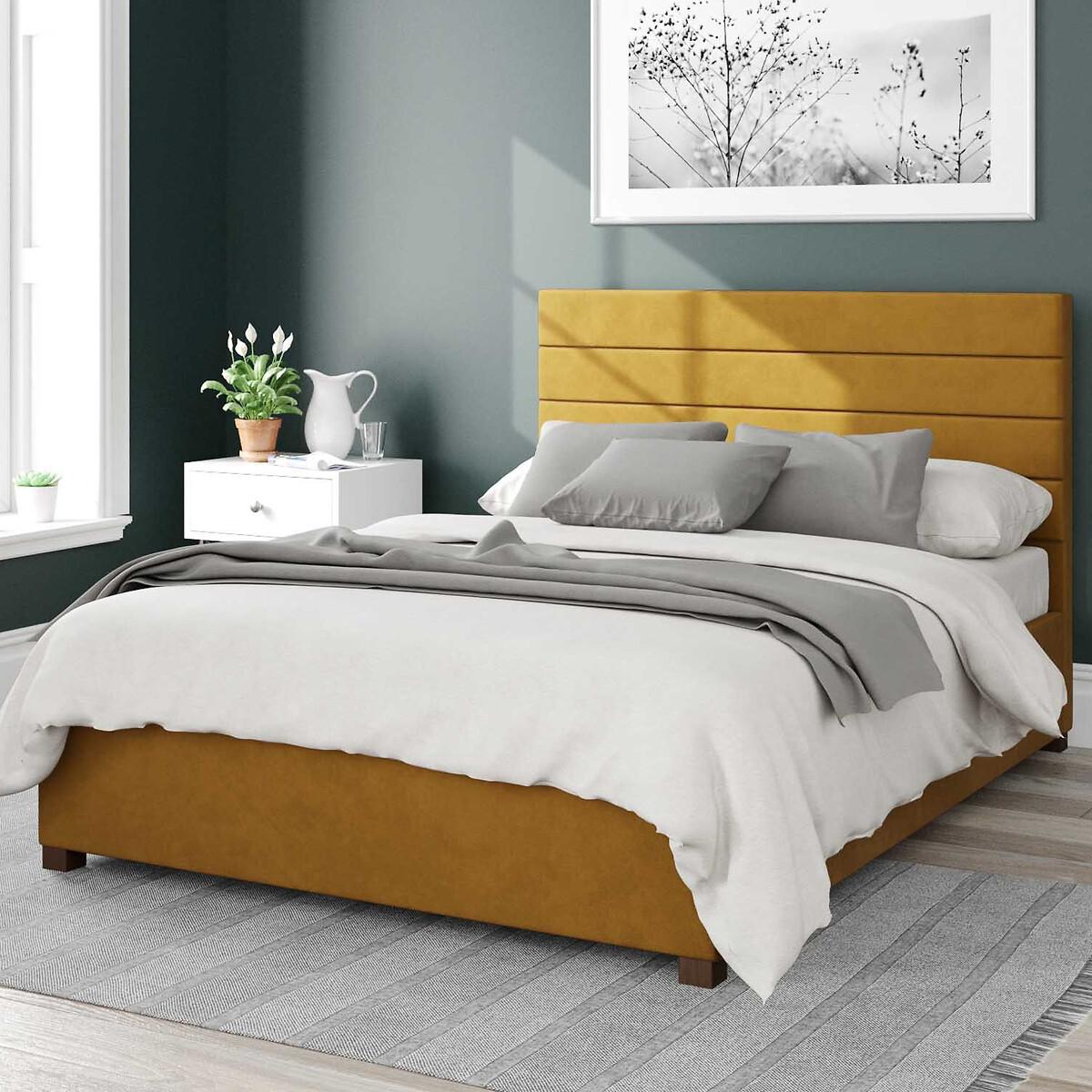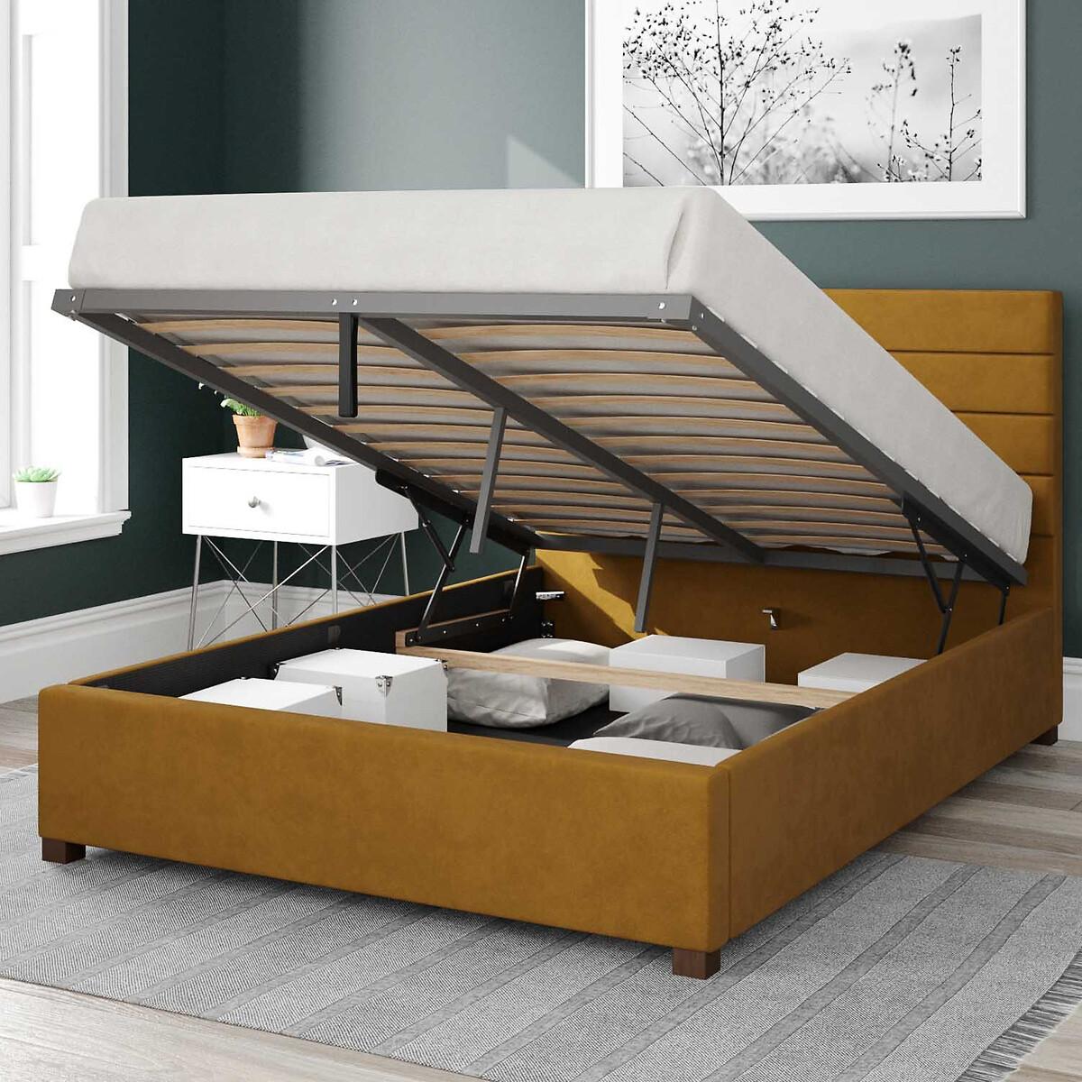 Modern and contemporary, the Kelly exudes clean lines and elegant style with a deep padded headboard upholstered in a sumptuous velvet. A well-proportioned compartment provides storage for clothes, shoes and bedroom clutter, and a fabric dust protection sheet attaches to the underside of the bed to keep your items neat and clean. Sturdy sprung slats create a base supportive of a good nights sleep which also promotes air circulation. Solid and square hardwood feet, hand-turned for a traditional touch, add a refined and elegant finish. Product details:• Ottoman storage bed• Modern horizontal headboard design, upholstered by hand• Upholstered in a luxurious velvet fabric with a soft lustre and plush texture• End-lift mechanism for convenient access• Large storage area with fabric dust protection sheet base• Durable gas pistons ensure the storage area remains securely open for hands-free use• Solid hand-turned hardwood feet• Sprung slatted base• Foam fillings• Made to order and expertly hand finished right here in the UK • Assembly required (2 person recommended)• Mattress not included• 12 month manufacturers warranty• Care advice:Wipe clean with a soft cloth Composition • Upholstery - Plush Velvet (100% polyester)• Fillings - Foam • Frame - Chipboard, Plywood, MDF, Steel. This product will be dispatched by one of our trusted suppliers. You’ll be contacted by their selected courier about your delivery. Please note this item will be delivered to your doorstep. Please note that this item cannot be delivered to the Offshore Islands, Northern Ireland or the Republic of Ireland. Product Dimensions Single • Total Dimensions - H112cm x W100cm x L209cm• Storage Area Dimensions - W94 cm x L193 cm x H26 cm • Suitable for use with standard single mattresses (90cm x 190cm)Small Double • Total Dimensions - H112cm x W130cm x L209cm• Storage Area Dimensions - W122 cm x L193 cm x H26 cm • Suitable for use with standard small double mattresses (120cm x 190cm)Double • Total Dimensions - H112cm x W147cm x L209cm• Storage Area Dimensions - W141 cm x L193 cm x H26 cm • Suitable for use with standard double mattresses (135cm x 190cm)King• Total Dimensions - H112cm x W160cm x L219cm• Storage Area Dimensions - W154cm x L204 cm x H26 cm • Suitable for use with standard king mattresses (150cm x 200cm)Super King• Total Dimensions - H112cm x W190cm x L219cm• Storage Area Dimensions - W184 cm x L204 cm x H26 cm • Suitable for use with standard king mattresses (180cm x 200cm)Other dimensions• Headboard Height - 110 cm• Footboard Height: 30cm• Underbed Clearance: 5cm• Ottoman lift mechanism functions with a mattress with weight of up to 60 kg. Package DimensionsSingle:. Parcel 1 - 140cm x 113cm x 12cm, Weight: 12kg Parcel 2 - 212cm x 32cm x 19cm, Weight: 13kg Parcel 3 - 240cm x 180cm x 12, Weight: 18kg. Small Double:Parcel 1 - 140cm x 113cm x 12cm, Weight: 19kg Parcel 2 - 212cm x 32cm x 19cm, Weight: 17kg Parcel 3 - 240cm x 180cm x 12cm, Weight: 22kgDouble: Parcel 1 - 171cm x 113cm x 12cm, Weight: 22kg Parcel 2 - 212cm x 32cm x 19cm, Weight: 18kg Parcel 3 - 240cm x 180cm x 12cm, Weight: 23kgKing:. Parcel 1 - 171cm x 113cm x 12cm, Weight: 27kg Parcel 2 - 212cm x 32cm x 19cm, Weight: 22kg Parcel 3 - 240cm x 180cm x 12cm, Weight: 25kg Super King:Parcel 1 - 201cm x 113cm x 12cm, Weight: 30kg Parcel 2 - 212cm x 32cm x 19cm, Weight: 25kg Parcel 3 - 240cm x 180cm x 12cm, Weight: 27kg
