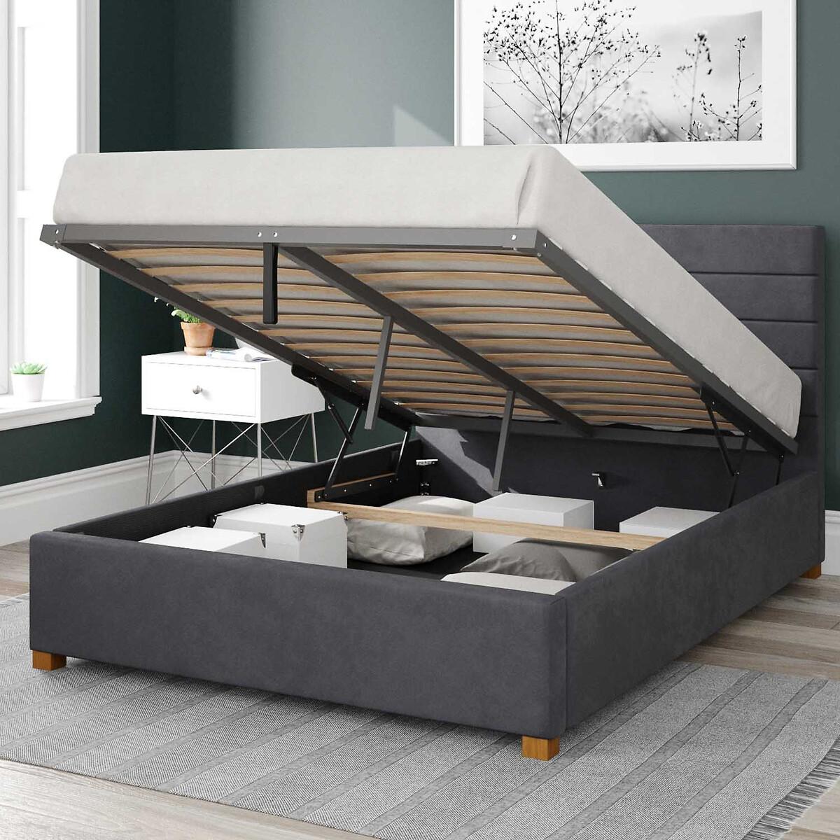 Modern and contemporary, the Kelly exudes clean lines and elegant style with a deep padded headboard upholstered in a sumptuous velvet. A well-proportioned compartment provides storage for clothes, shoes and bedroom clutter, and a fabric dust protection sheet attaches to the underside of the bed to keep your items neat and clean. Sturdy sprung slats create a base supportive of a good nights sleep which also promotes air circulation. Solid and square hardwood feet, hand-turned for a traditional touch, add a refined and elegant finish. Product details:• Ottoman storage bed• Modern horizontal headboard design, upholstered by hand• Upholstered in a luxurious velvet fabric with a soft lustre and plush texture• End-lift mechanism for convenient access• Large storage area with fabric dust protection sheet base• Durable gas pistons ensure the storage area remains securely open for hands-free use• Solid hand-turned hardwood feet• Sprung slatted base• Foam fillings• Made to order and expertly hand finished right here in the UK • Assembly required (2 person recommended)• Mattress not included• 12 month manufacturers warranty• Care advice:Wipe clean with a soft cloth Composition • Upholstery - Plush Velvet (100% polyester)• Fillings - Foam • Frame - Chipboard, Plywood, MDF, Steel. This product will be dispatched by one of our trusted suppliers. You’ll be contacted by their selected courier about your delivery. Please note this item will be delivered to your doorstep. Please note that this item cannot be delivered to the Offshore Islands, Northern Ireland or the Republic of Ireland. Product Dimensions Single • Total Dimensions - H112cm x W100cm x L209cm• Storage Area Dimensions - W94 cm x L193 cm x H26 cm • Suitable for use with standard single mattresses (90cm x 190cm)Small Double • Total Dimensions - H112cm x W130cm x L209cm• Storage Area Dimensions - W122 cm x L193 cm x H26 cm • Suitable for use with standard small double mattresses (120cm x 190cm)Double • Total Dimensions - H112cm x W147cm x L209cm• Storage Area Dimensions - W141 cm x L193 cm x H26 cm • Suitable for use with standard double mattresses (135cm x 190cm)King• Total Dimensions - H112cm x W160cm x L219cm• Storage Area Dimensions - W154cm x L204 cm x H26 cm • Suitable for use with standard king mattresses (150cm x 200cm)Super King• Total Dimensions - H112cm x W190cm x L219cm• Storage Area Dimensions - W184 cm x L204 cm x H26 cm • Suitable for use with standard king mattresses (180cm x 200cm)Other dimensions• Headboard Height - 110 cm• Footboard Height: 30cm• Underbed Clearance: 5cm• Ottoman lift mechanism functions with a mattress with weight of up to 60 kg. Package DimensionsSingle:. Parcel 1 - 140cm x 113cm x 12cm, Weight: 12kg Parcel 2 - 212cm x 32cm x 19cm, Weight: 13kg Parcel 3 - 240cm x 180cm x 12, Weight: 18kg. Small Double:Parcel 1 - 140cm x 113cm x 12cm, Weight: 19kg Parcel 2 - 212cm x 32cm x 19cm, Weight: 17kg Parcel 3 - 240cm x 180cm x 12cm, Weight: 22kgDouble: Parcel 1 - 171cm x 113cm x 12cm, Weight: 22kg Parcel 2 - 212cm x 32cm x 19cm, Weight: 18kg Parcel 3 - 240cm x 180cm x 12cm, Weight: 23kgKing:. Parcel 1 - 171cm x 113cm x 12cm, Weight: 27kg Parcel 2 - 212cm x 32cm x 19cm, Weight: 22kg Parcel 3 - 240cm x 180cm x 12cm, Weight: 25kg Super King:Parcel 1 - 201cm x 113cm x 12cm, Weight: 30kg Parcel 2 - 212cm x 32cm x 19cm, Weight: 25kg Parcel 3 - 240cm x 180cm x 12cm, Weight: 27kg