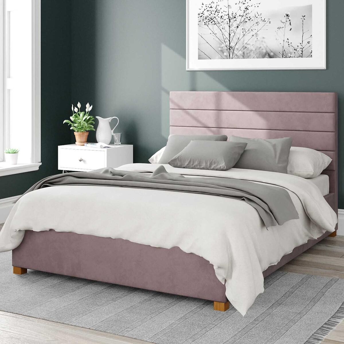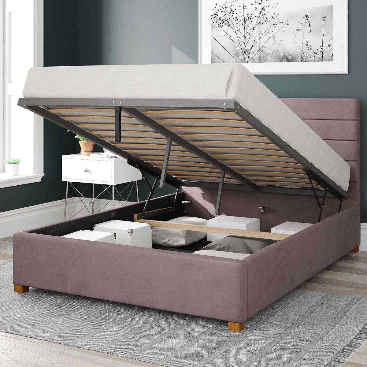 Modern and contemporary, the Kelly exudes clean lines and elegant style with a deep padded headboard upholstered in a sumptuous velvet. A well-proportioned compartment provides storage for clothes, shoes and bedroom clutter, and a fabric dust protection sheet attaches to the underside of the bed to keep your items neat and clean. Sturdy sprung slats create a base supportive of a good nights sleep which also promotes air circulation. Solid and square hardwood feet, hand-turned for a traditional touch, add a refined and elegant finish. Product details:• Ottoman storage bed• Modern horizontal headboard design, upholstered by hand• Upholstered in a luxurious velvet fabric with a soft lustre and plush texture• End-lift mechanism for convenient access• Large storage area with fabric dust protection sheet base• Durable gas pistons ensure the storage area remains securely open for hands-free use• Solid hand-turned hardwood feet• Sprung slatted base• Foam fillings• Made to order and expertly hand finished right here in the UK • Assembly required (2 person recommended)• Mattress not included• 12 month manufacturers warranty• Care advice:Wipe clean with a soft cloth Composition • Upholstery - Plush Velvet (100% polyester)• Fillings - Foam • Frame - Chipboard, Plywood, MDF, Steel. This product will be dispatched by one of our trusted suppliers. You’ll be contacted by their selected courier about your delivery. Please note this item will be delivered to your doorstep. Please note that this item cannot be delivered to the Offshore Islands, Northern Ireland or the Republic of Ireland. Product Dimensions Single • Total Dimensions - H112cm x W100cm x L209cm• Storage Area Dimensions - W94 cm x L193 cm x H26 cm • Suitable for use with standard single mattresses (90cm x 190cm)Small Double • Total Dimensions - H112cm x W130cm x L209cm• Storage Area Dimensions - W122 cm x L193 cm x H26 cm • Suitable for use with standard small double mattresses (120cm x 190cm)Double • Total Dimensions - H112cm x W147cm x L209cm• Storage Area Dimensions - W141 cm x L193 cm x H26 cm • Suitable for use with standard double mattresses (135cm x 190cm)King• Total Dimensions - H112cm x W160cm x L219cm• Storage Area Dimensions - W154cm x L204 cm x H26 cm • Suitable for use with standard king mattresses (150cm x 200cm)Super King• Total Dimensions - H112cm x W190cm x L219cm• Storage Area Dimensions - W184 cm x L204 cm x H26 cm • Suitable for use with standard king mattresses (180cm x 200cm)Other dimensions• Headboard Height - 110 cm• Footboard Height: 30cm• Underbed Clearance: 5cm• Ottoman lift mechanism functions with a mattress with weight of up to 60 kg. Package DimensionsSingle:. Parcel 1 - 140cm x 113cm x 12cm, Weight: 12kg Parcel 2 - 212cm x 32cm x 19cm, Weight: 13kg Parcel 3 - 240cm x 180cm x 12, Weight: 18kg. Small Double:Parcel 1 - 140cm x 113cm x 12cm, Weight: 19kg Parcel 2 - 212cm x 32cm x 19cm, Weight: 17kg Parcel 3 - 240cm x 180cm x 12cm, Weight: 22kgDouble: Parcel 1 - 171cm x 113cm x 12cm, Weight: 22kg Parcel 2 - 212cm x 32cm x 19cm, Weight: 18kg Parcel 3 - 240cm x 180cm x 12cm, Weight: 23kgKing:. Parcel 1 - 171cm x 113cm x 12cm, Weight: 27kg Parcel 2 - 212cm x 32cm x 19cm, Weight: 22kg Parcel 3 - 240cm x 180cm x 12cm, Weight: 25kg Super King:Parcel 1 - 201cm x 113cm x 12cm, Weight: 30kg Parcel 2 - 212cm x 32cm x 19cm, Weight: 25kg Parcel 3 - 240cm x 180cm x 12cm, Weight: 27kg