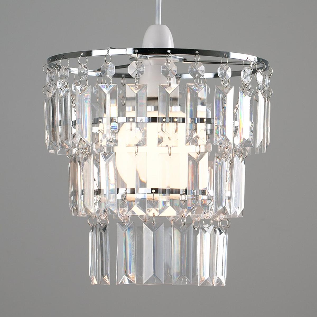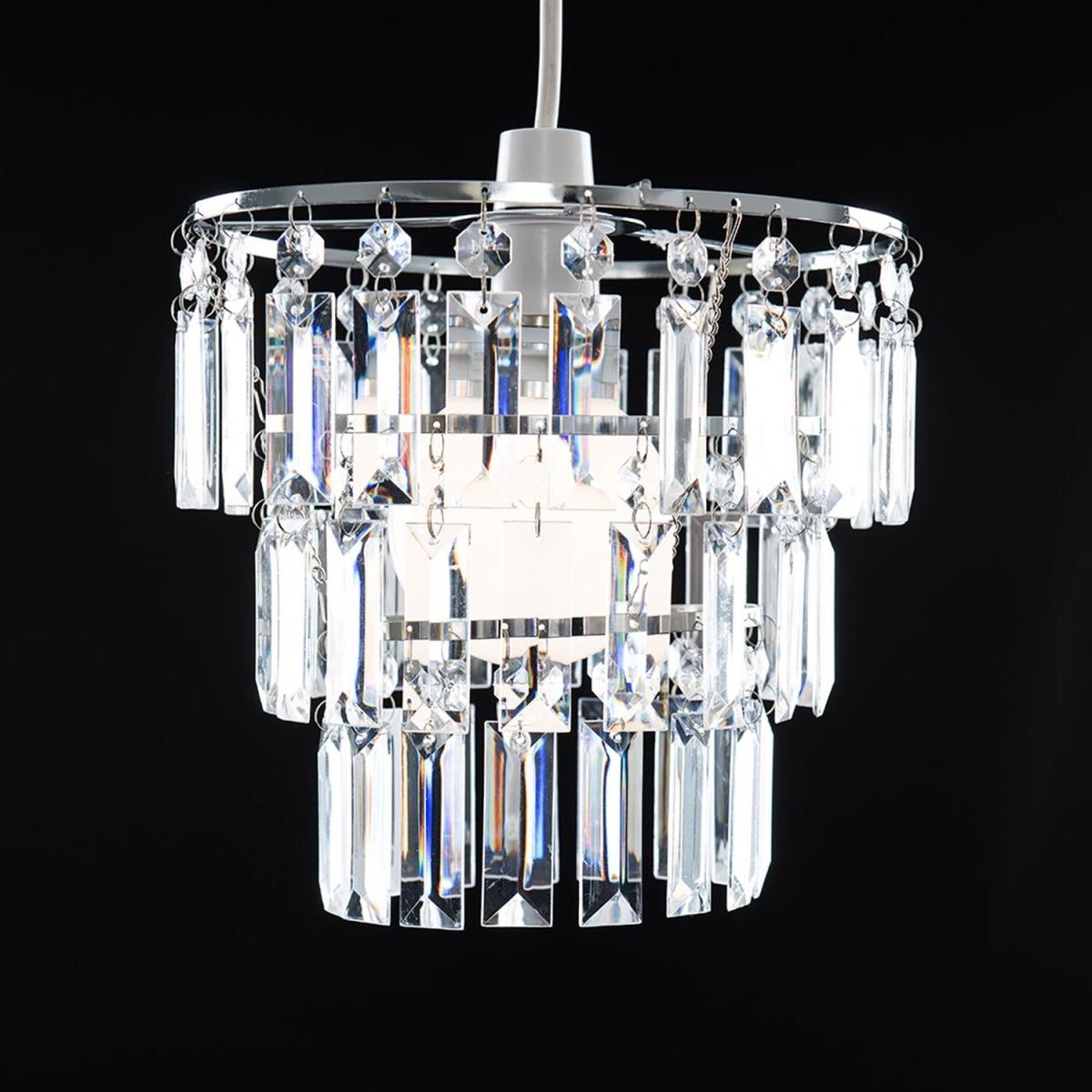 Beautiful three tiered ceiling pendant light shade chandelier. Features cascading, light-reflecting clear acrylic jewel effect droplets, suspended from a silver chrome metal frame, which cast the light beautifully around the room. Easily fits to your standard ceiling light socket - no wiring required. With a variety of colours available, this elegant lampshade goes perfectly with almost any style of interior design. Ideal for lounges, dining rooms, bedrooms and hallways. A non electric ceiling pendant shade is a quick and economical way to update your room in seconds! 1 x 60w BC B22 GLS bulb is required - not supplied.