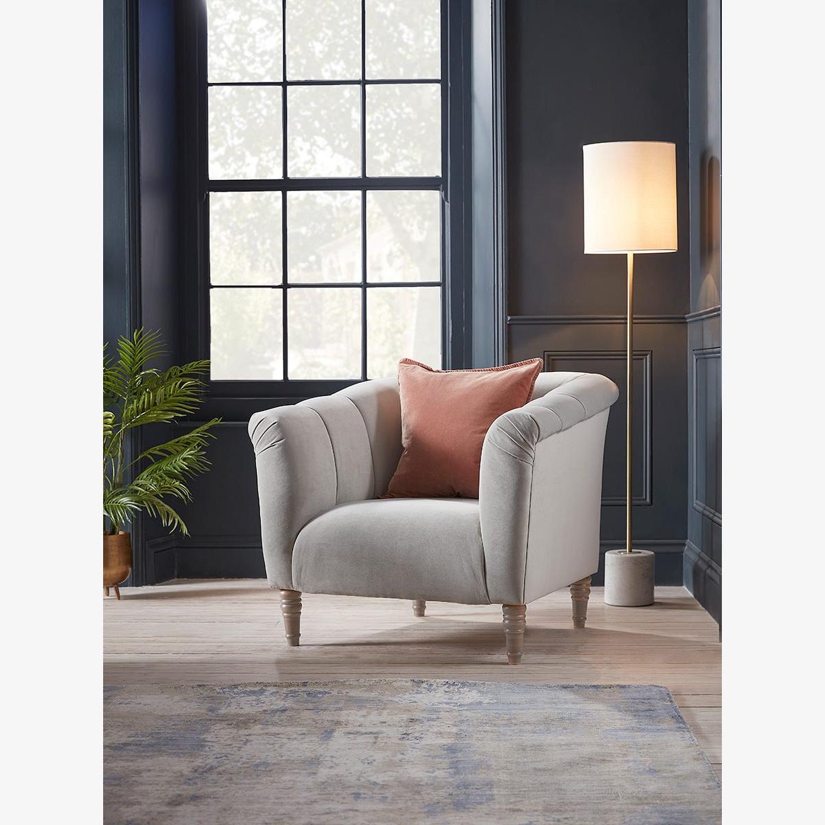 Deep vertical channels create a sculpted feminine outline across our Kemi range which will bring a sophisticated touch of old school glamour to your living space. An elegant slope from back to arm tip, hand pleated finishing and turned polished legs add engaging refinement. The Kemi armchair features a form fitted back and sleek fixed seat which ensure it retains a smart appearance. Our Kemi collection can be upholstered in a choice of 34 distinctive shades and six fabrics to suit your style. Read our Upholstery FAQs View our full Upholstery Terms and Conditions