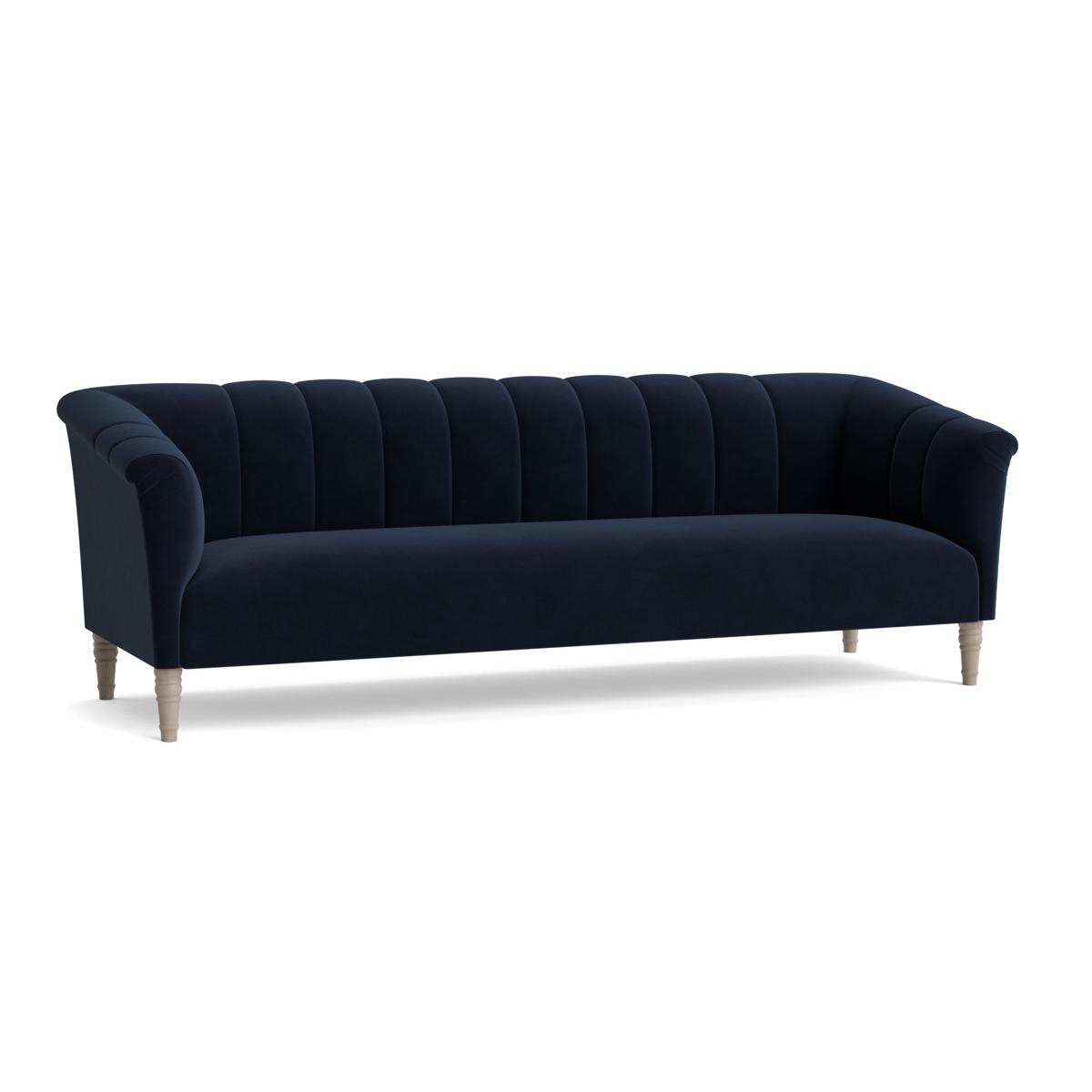 Deep vertical channels create a sculpted feminine outline across our Kemi range which will bring a sophisticated touch of old school glamour to your living space. An elegant slope from back to arm tip, hand pleated finishing and turned polished legs add engaging refinement. The sofa, available in both two seater and three seater sizes has a form fitted back and sleek single seat cushion which retains its shape even after prolonged lounging sessions. Pictured here in our Navy Velvet, our Kemi collection can be upholstered in a choice of 34 distinctive shades and six fabrics to suit your style. Read our Upholstery FAQs View our full Upholstery Terms and Conditions