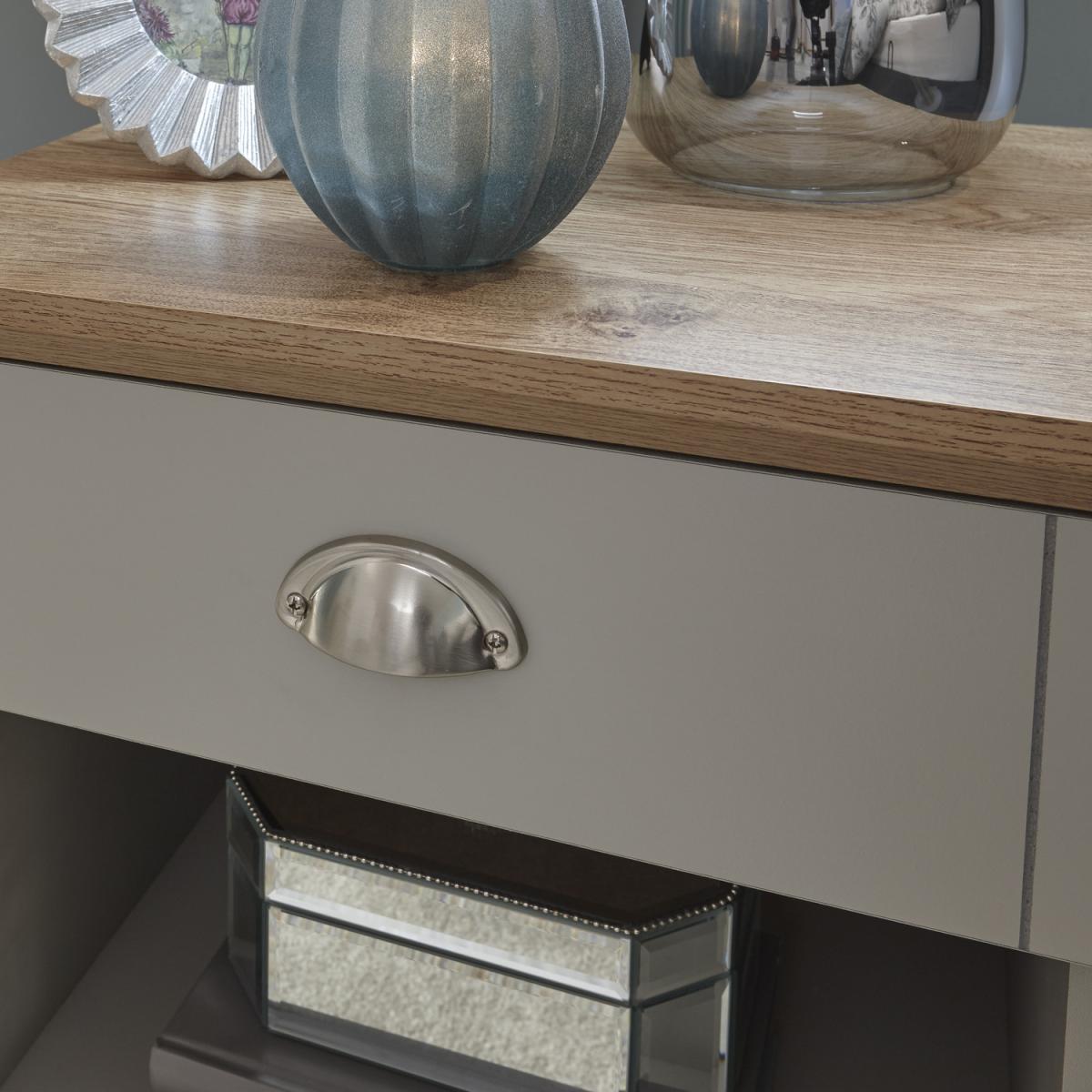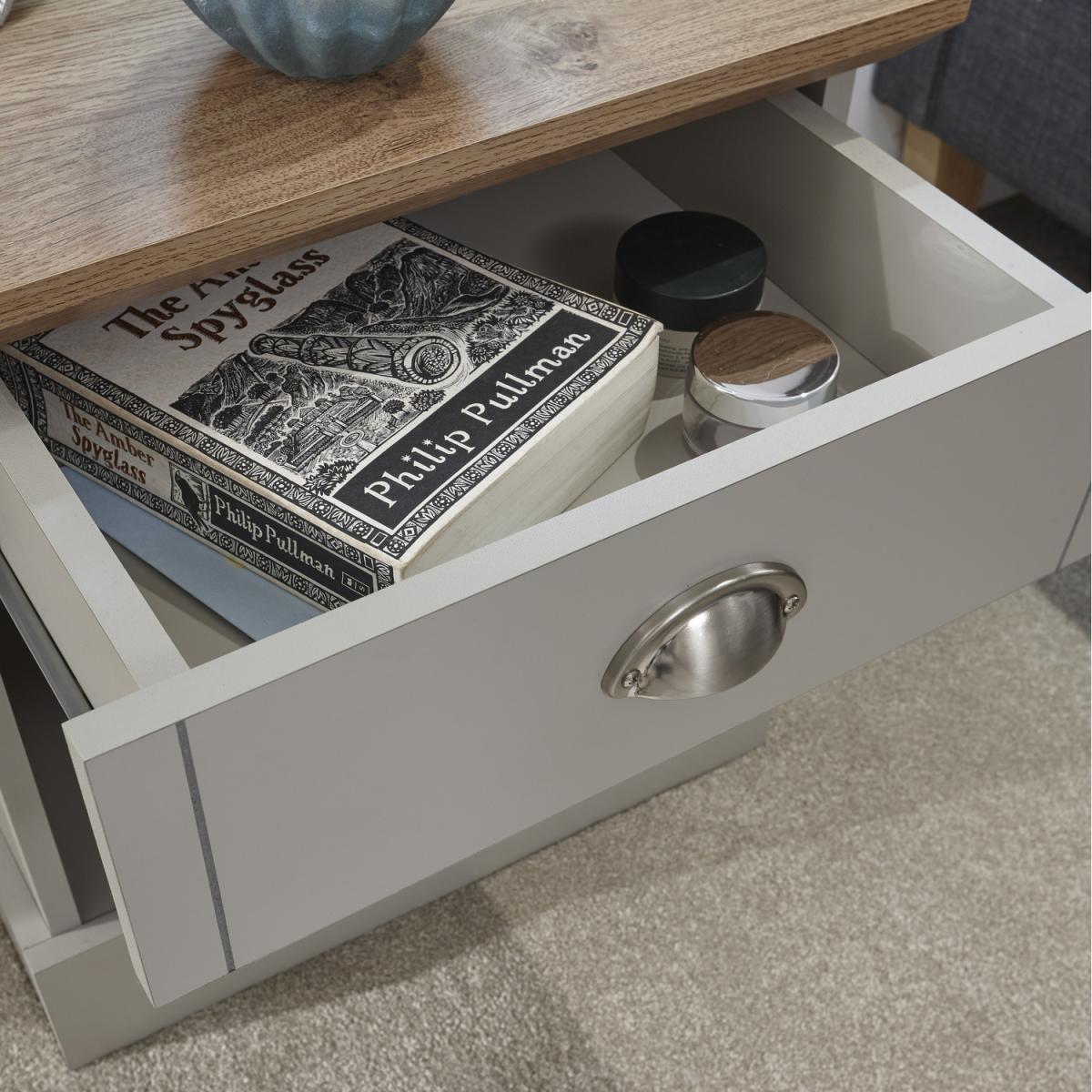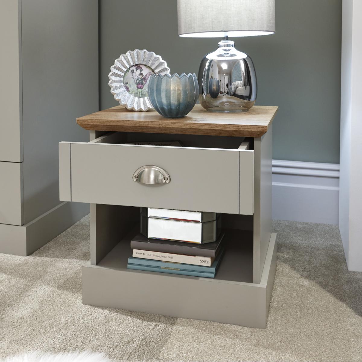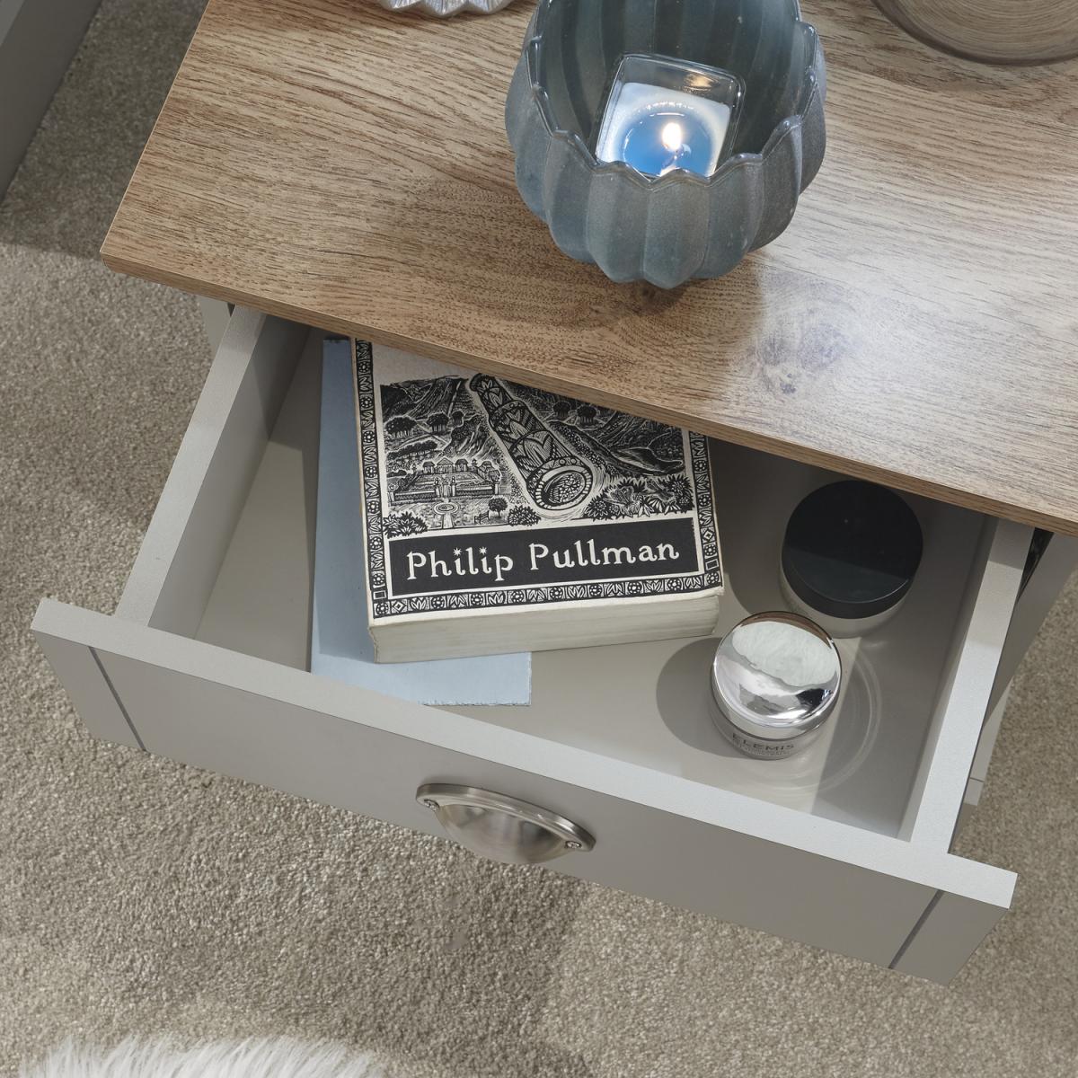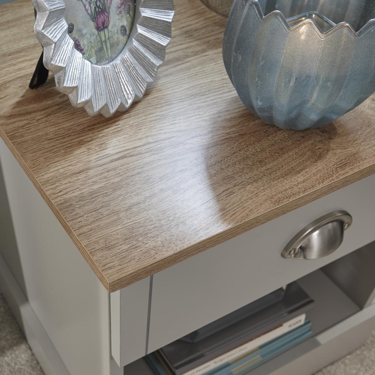 Upgrade your bedroom furniture with classy Kendal. This smart bedside table will suit any classic or contemporary interior scheme, uniting a soft grey or slate blue painted base with a bevelled oak-effect top to a stylish effect. The unit incorporates a neat top drawer, complete with a brushed steel cup handle and features an open shelf that makes a great repository for books and other nightstand essentials.