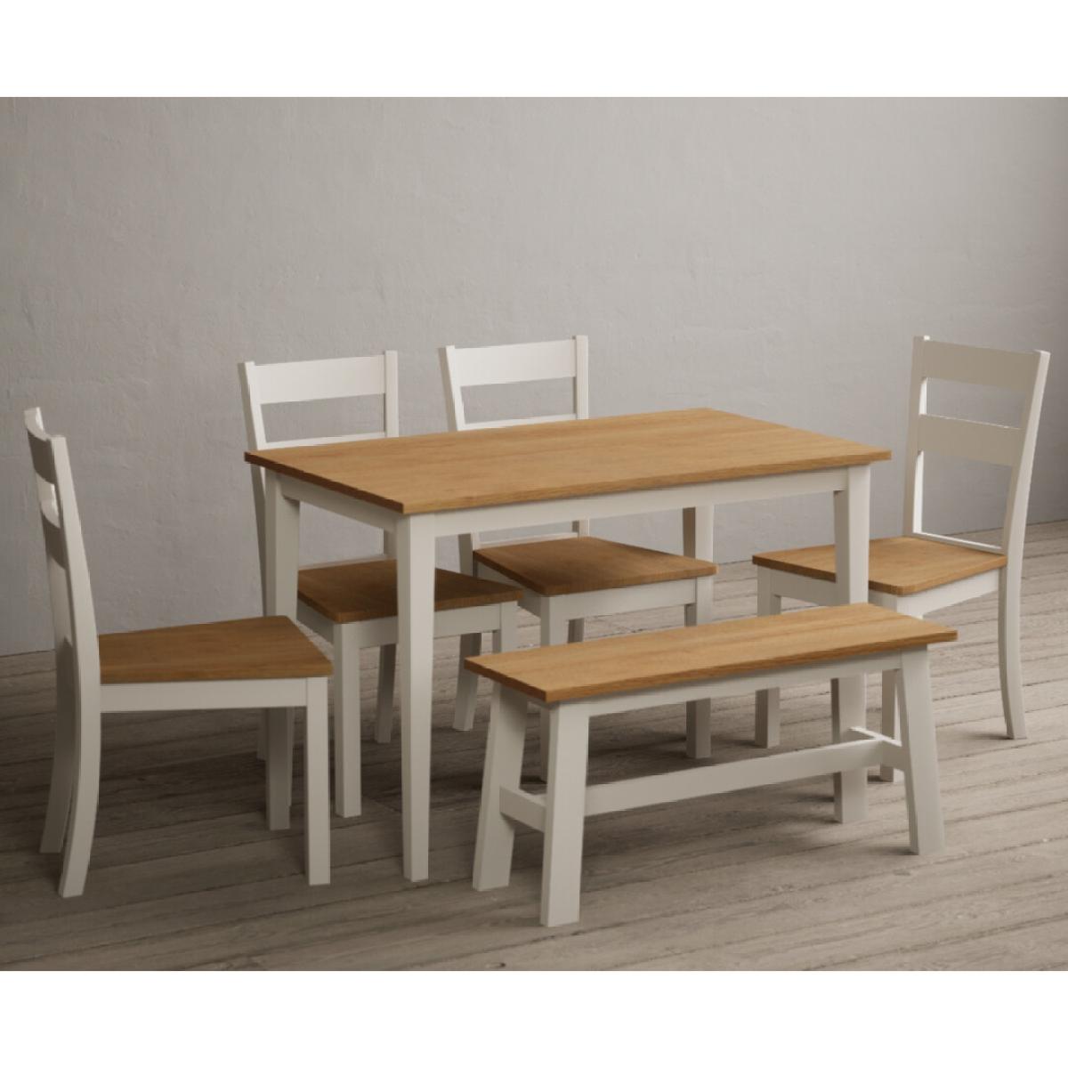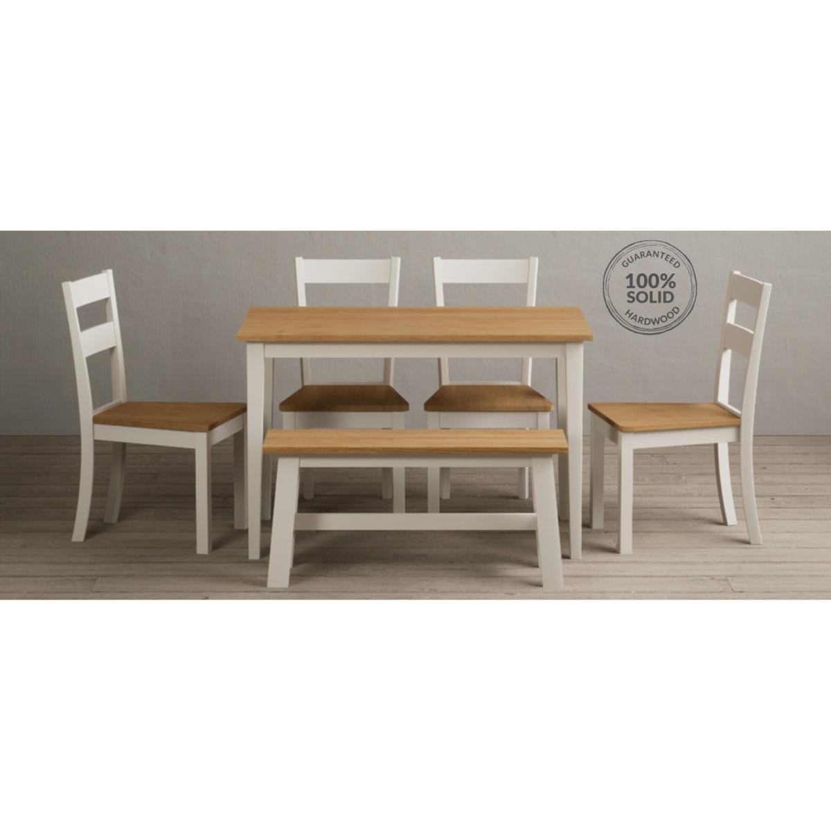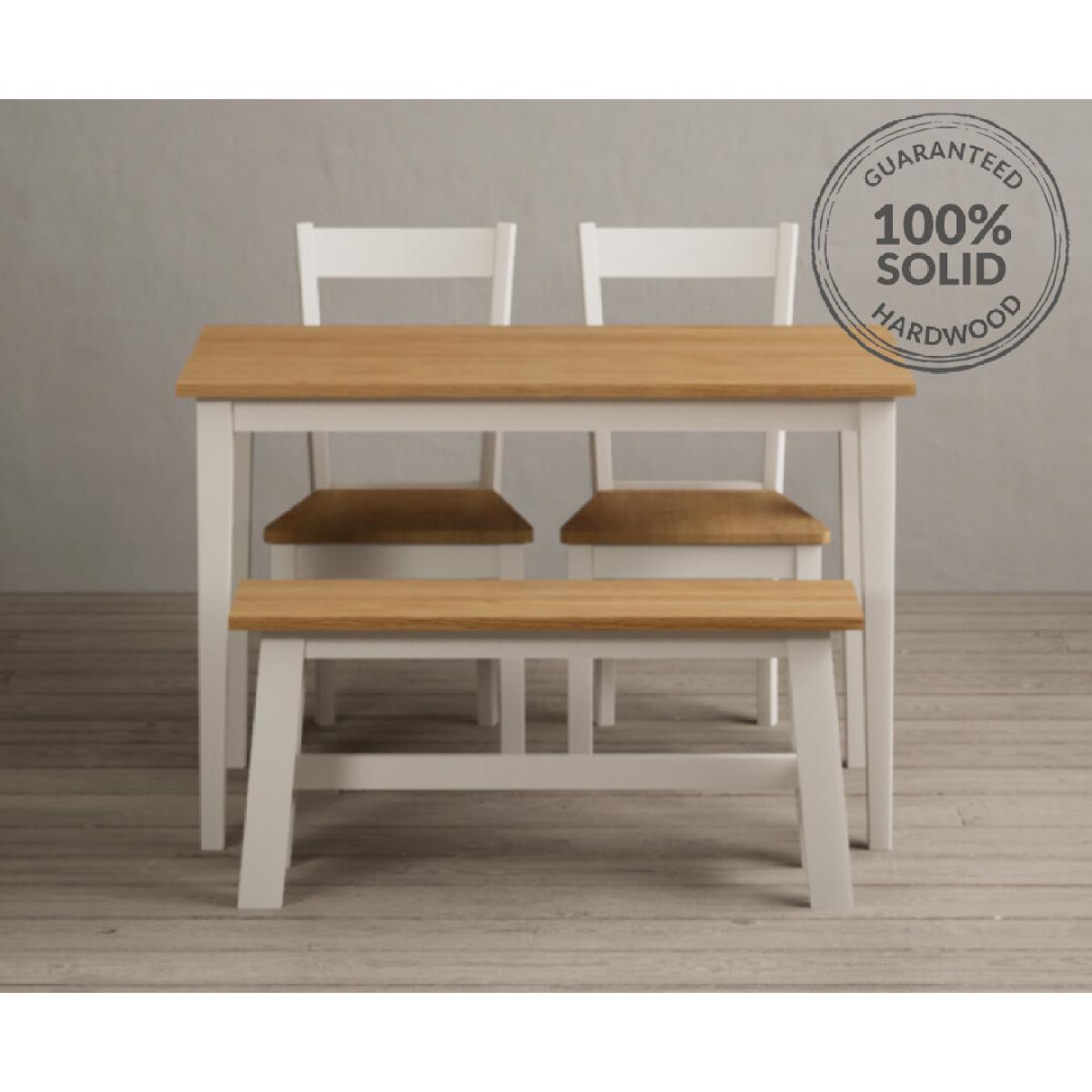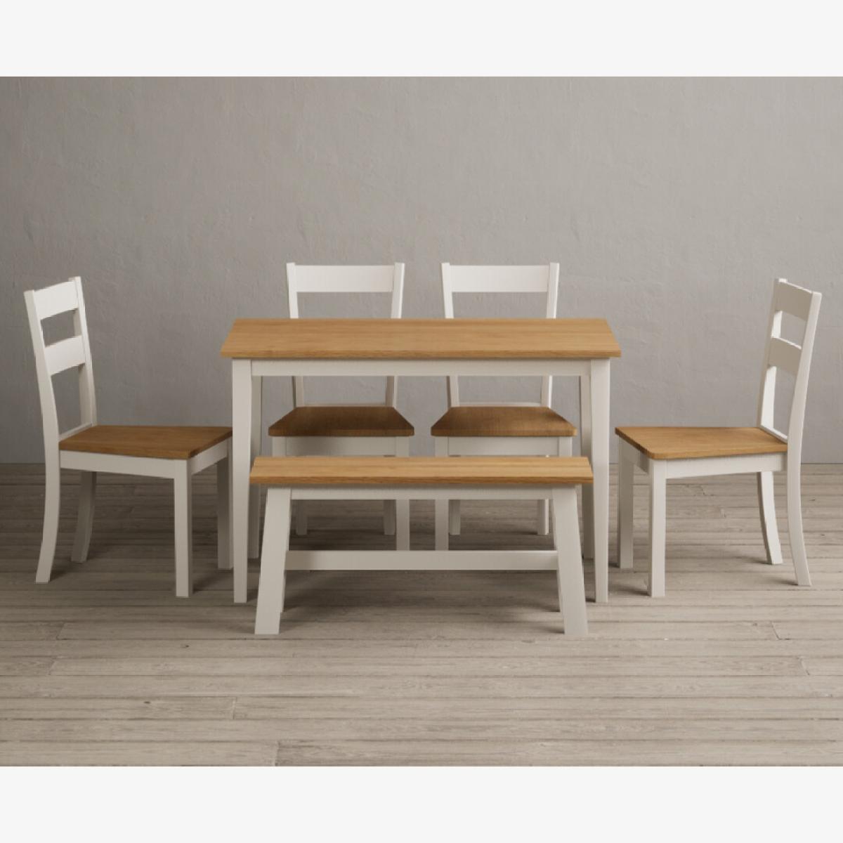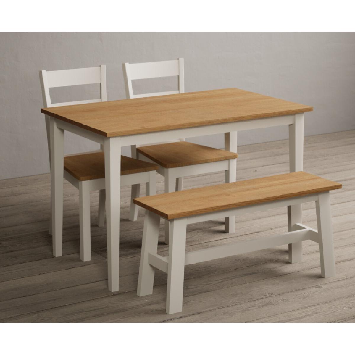 Kendal 115cm Solid Oak and Cream Painted Dining Table with Kendal Chairs and Benches is a stylish dining set featuring a painted solid hardwood dining table with a solid oak tabletop matched with solid hardwood chairs and benches.