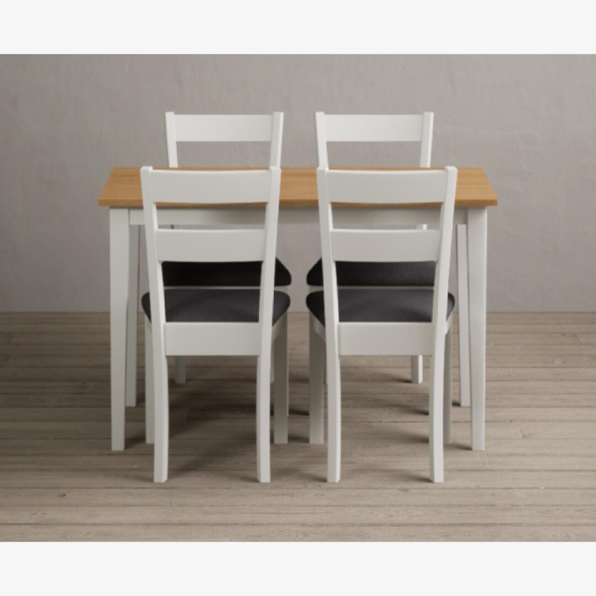 I really like this dining set because it balances natural warmth with a fresh, contemporary look. The solid oak top adds tactile richness and durability, making it a great centrepiece in both traditional and modern interiors, while the signal white painted finish of the table and chairs helps to keep the look light and airy - perfect for smaller spaces or open-plan areas. The charcoal grey Kendal chairs introduce a subtle colour contrast that grounds the set without overwhelming it, offering versatility in styling. To keep it looking its best, consider adding metallic accents or textured placemats; for a cosy feel, layer with neutral or patterned cushions on the chairs. It works beautifully in Scandi, coastal, or minimalist schemes, but can also be jazzed up with colourful accessories or bold textiles for more eclectic designs.