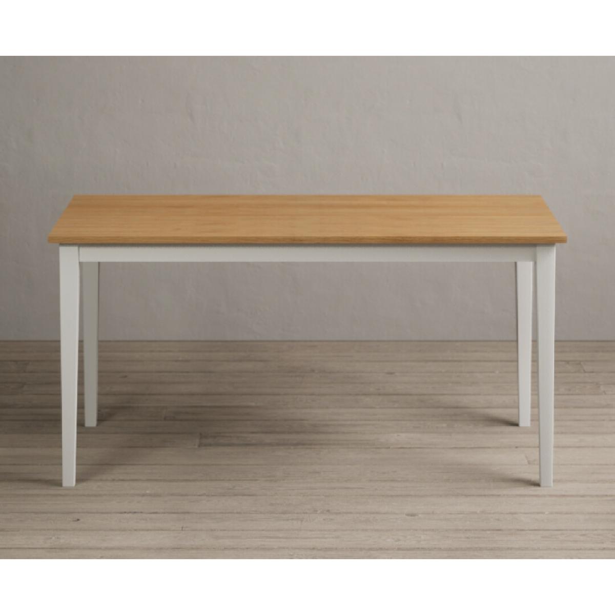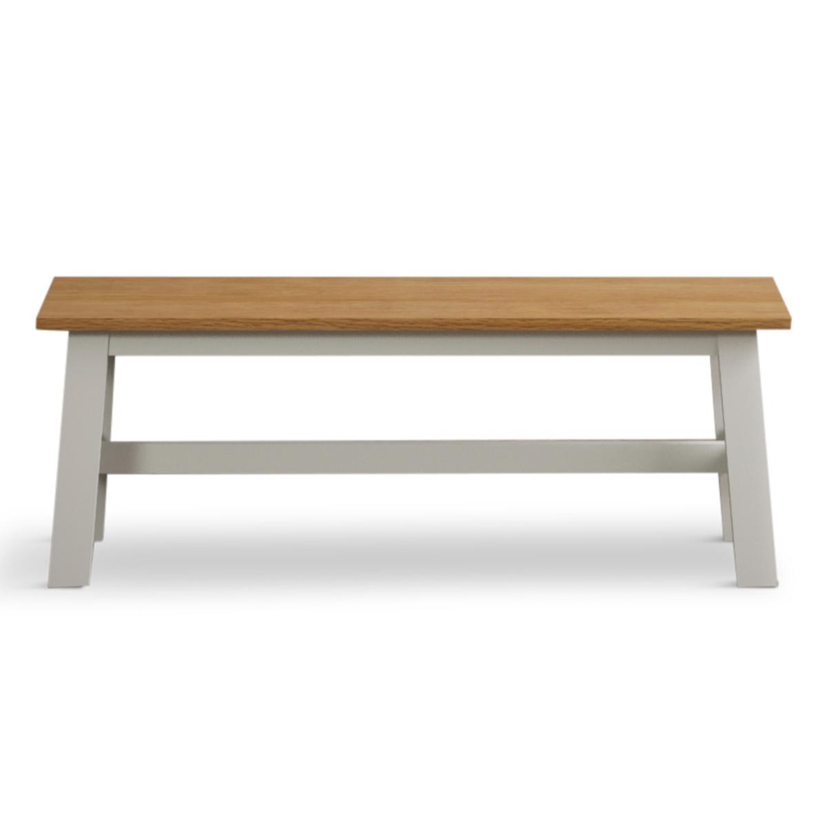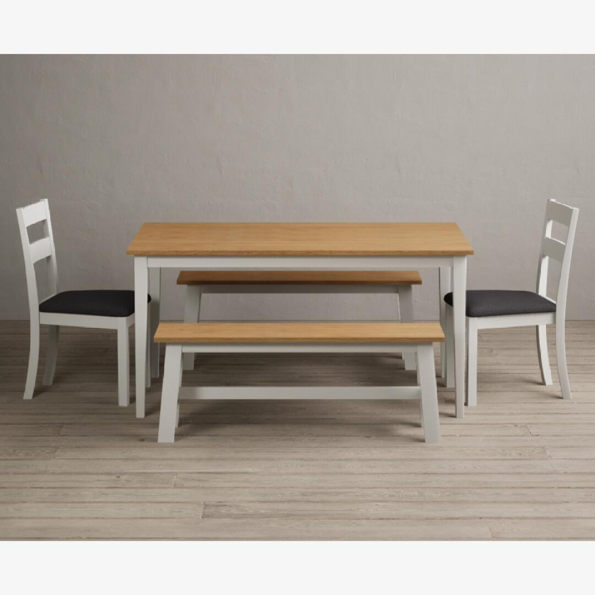 The Kendal 150cm Solid Oak and Signal White Painted Dining Table with Kendal Chairs and Benches is a stylish and sturdy dining set with a painted solid hardwood dining table with a solid oak top matched with painted chairs and benches.