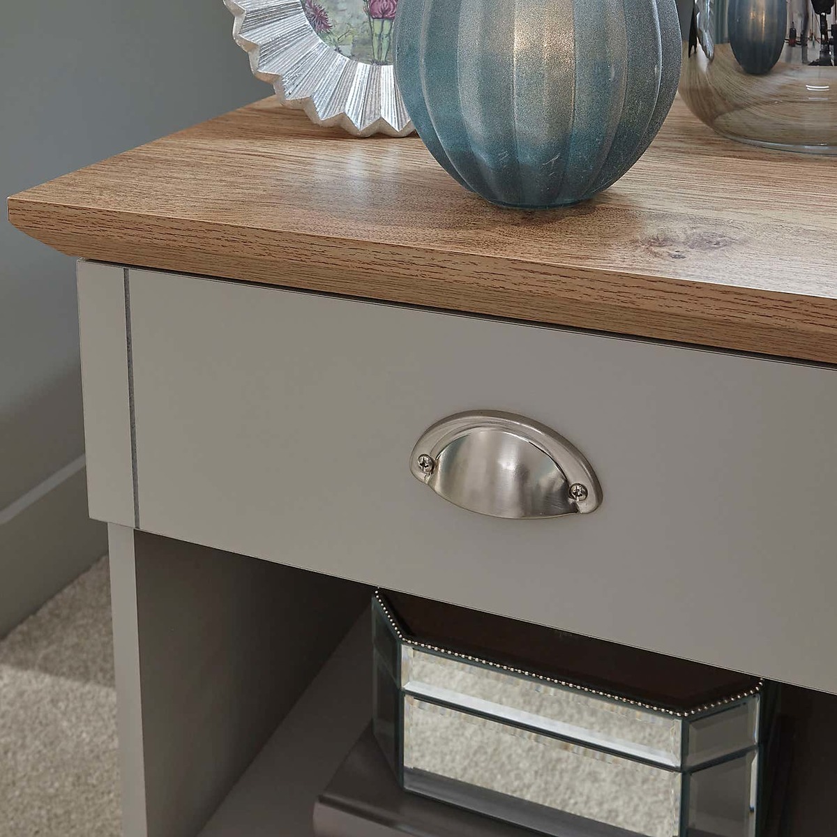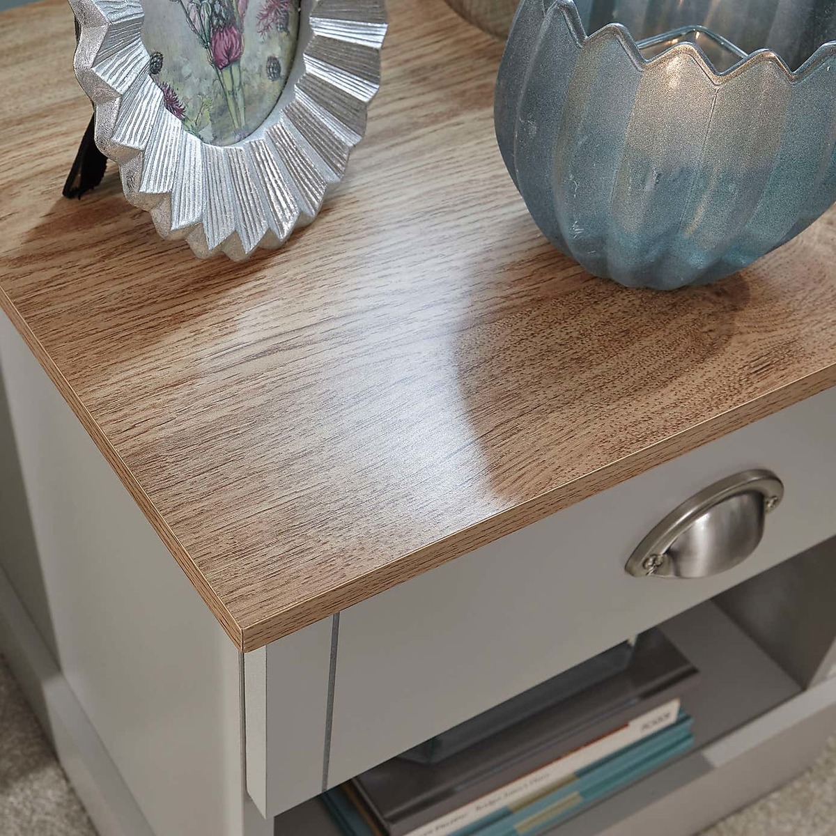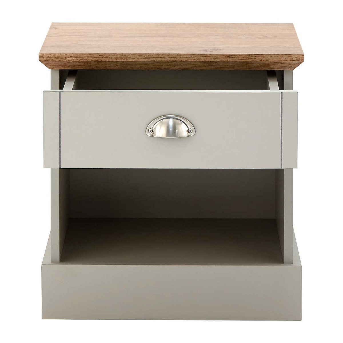 Finished in a grey colourway with a contrasting bevelled edge oak-effect top and brushed steel cup handles, the Kendal bedside table has a design that would suit any classic or contemporary bedroom. This self-assembly bedside table features a spacious top drawer and a large open shelf for convenient storage. Please note, unfortunately we cannot deliver this item to the Channel Islands.