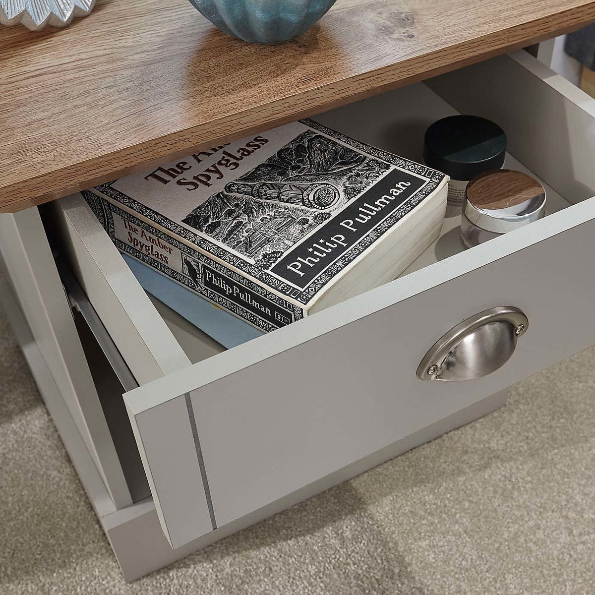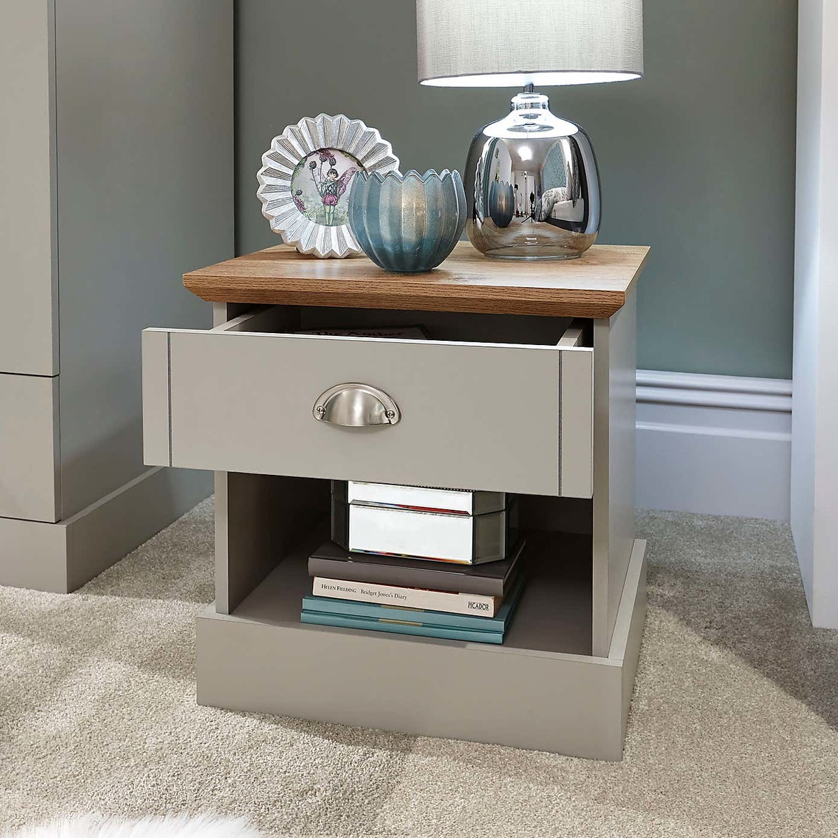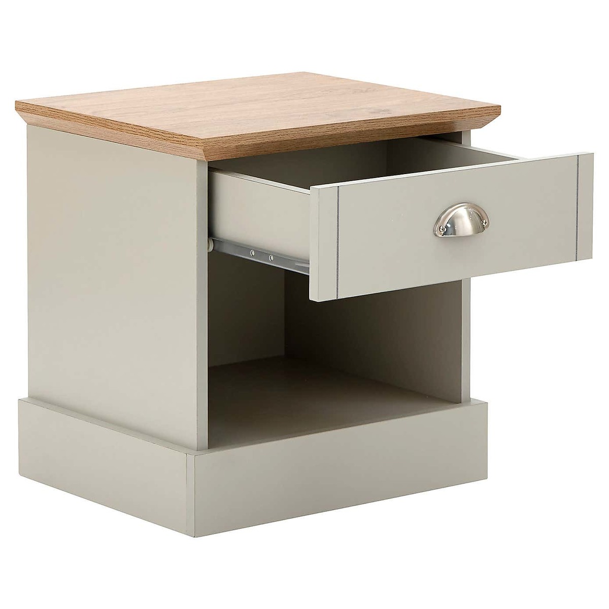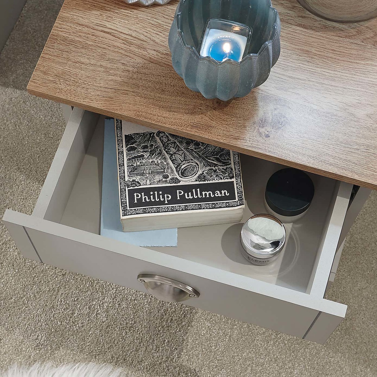 Finished in a grey colourway with a contrasting bevelled edge oak-effect top and brushed steel cup handles, the Kendal bedside table has a design that would suit any classic or contemporary bedroom. This self-assembly bedside table features a spacious top drawer and a large open shelf for convenient storage. Please note, unfortunately we cannot deliver this item to the Channel Islands.