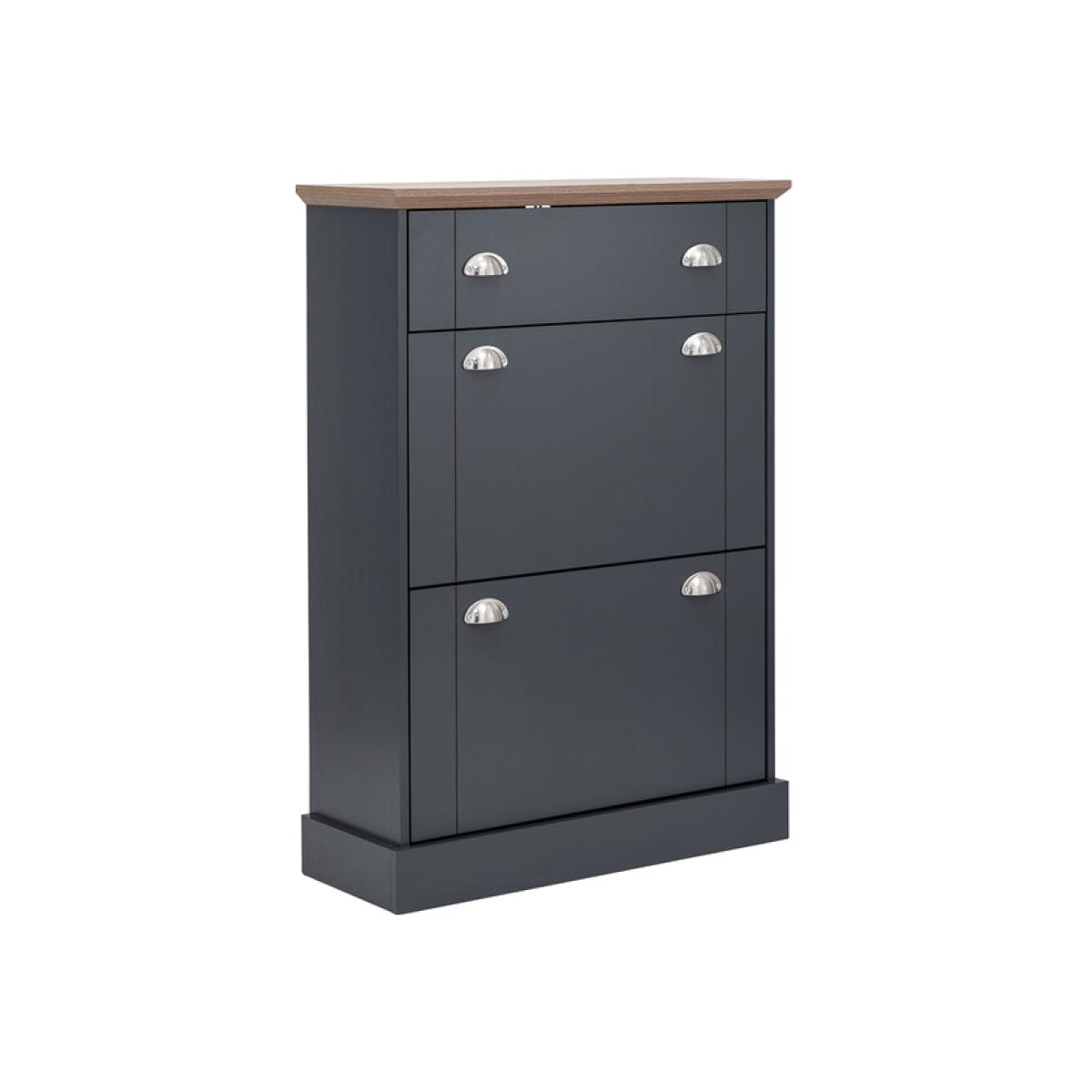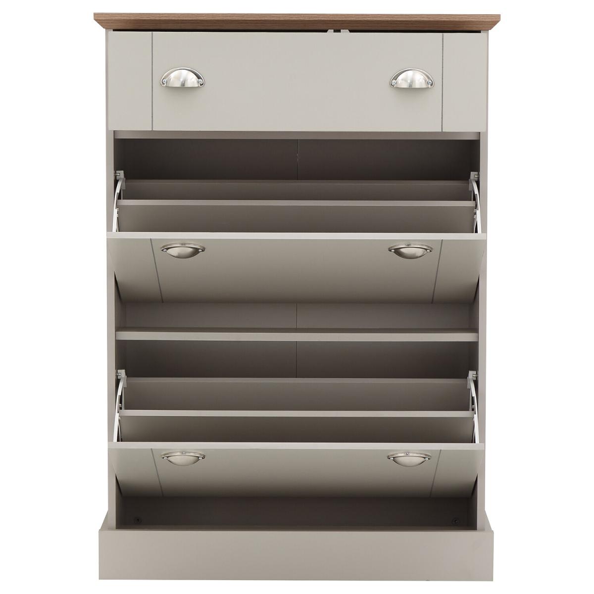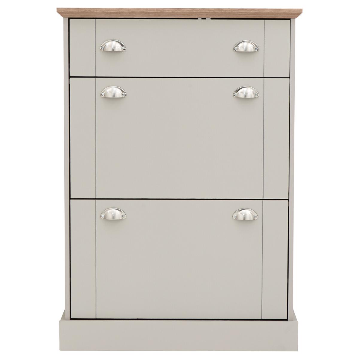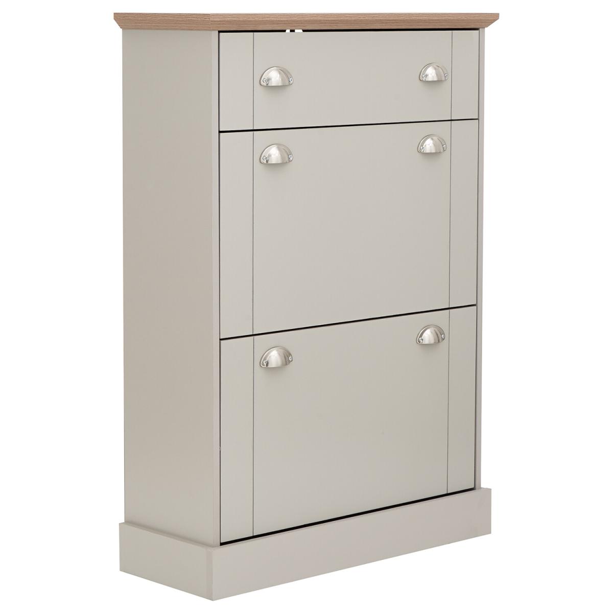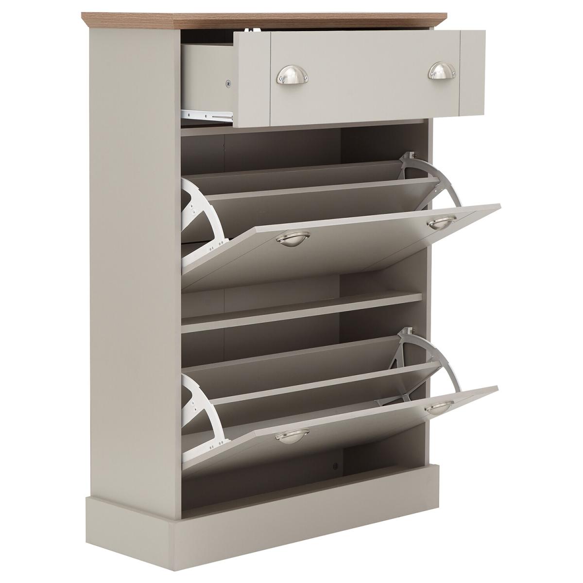 Make the smart choice with a shoe cabinet that fits perfectly into Kendal's timeless country furnishing aesthetic. The Kendal Deluxe Shoe Cabinet features elegant panels are finished in a choice of muted colours and complemented by brushed nickel cup handles that reflect the unit's classic look and feel. The full width top drawer is perfect for gloves, pet paraphernalia and outdoor accessories, while the twin pull down shoe compartments are each capable of accommodating up to six pairs of standard size (UK10) men's shoes, a dozen pairs in all. The chunky oak effect top adds to the rustic charm and creates a handy surface for a lamp or ornament.