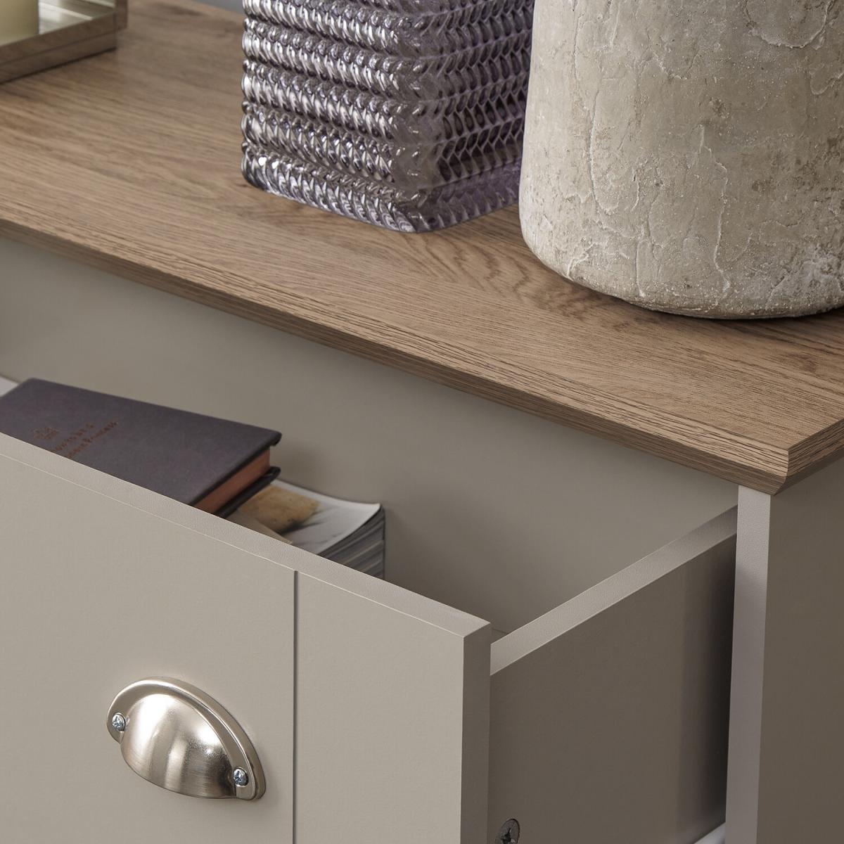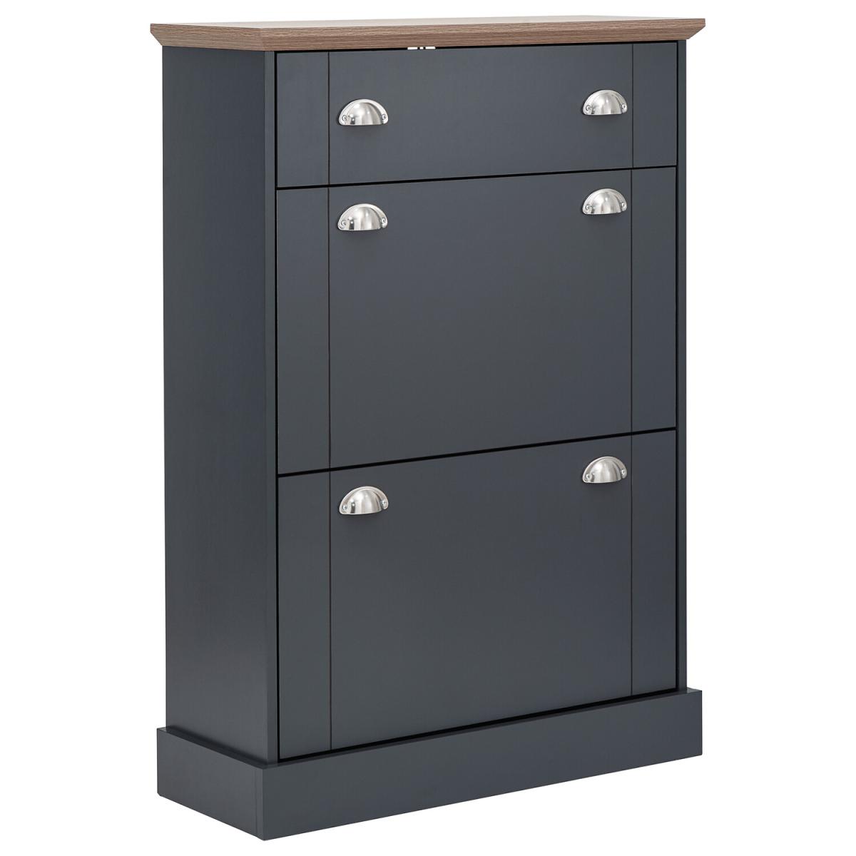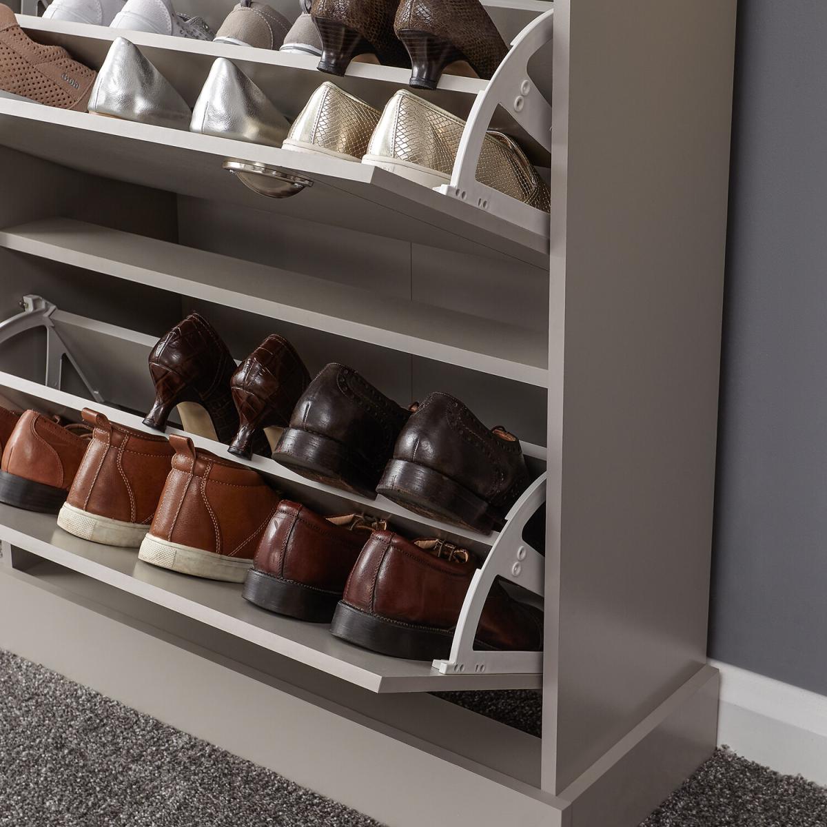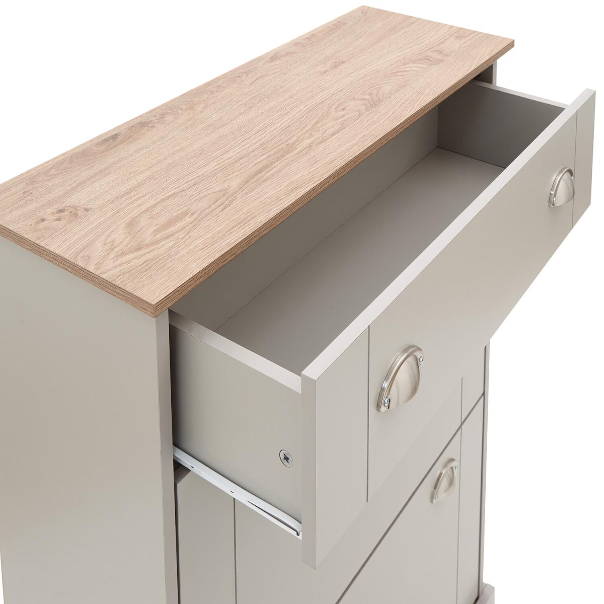 Make the smart choice with a shoe cabinet that fits perfectly into Kendal's timeless country furnishing aesthetic. The Kendal Deluxe Shoe Cabinet features elegant panels are finished in a choice of muted colours and complemented by brushed nickel cup handles that reflect the unit's classic look and feel. The full width top drawer is perfect for gloves, pet paraphernalia and outdoor accessories, while the twin pull down shoe compartments are each capable of accommodating up to six pairs of standard size (UK10) men's shoes, a dozen pairs in all. The chunky oak effect top adds to the rustic charm and creates a handy surface for a lamp or ornament.