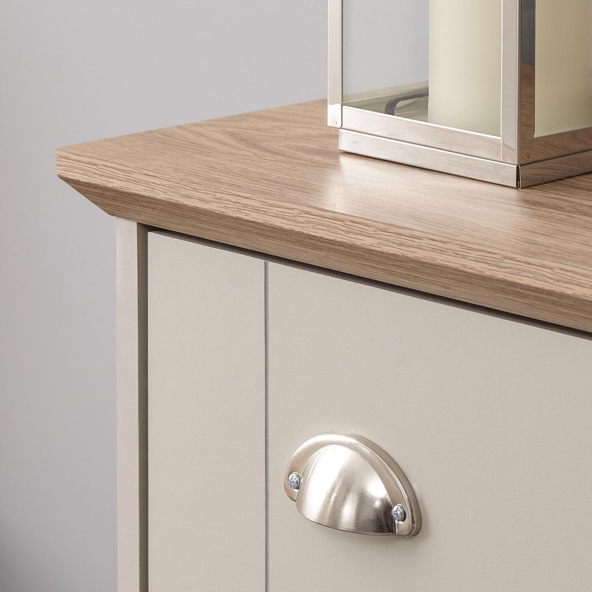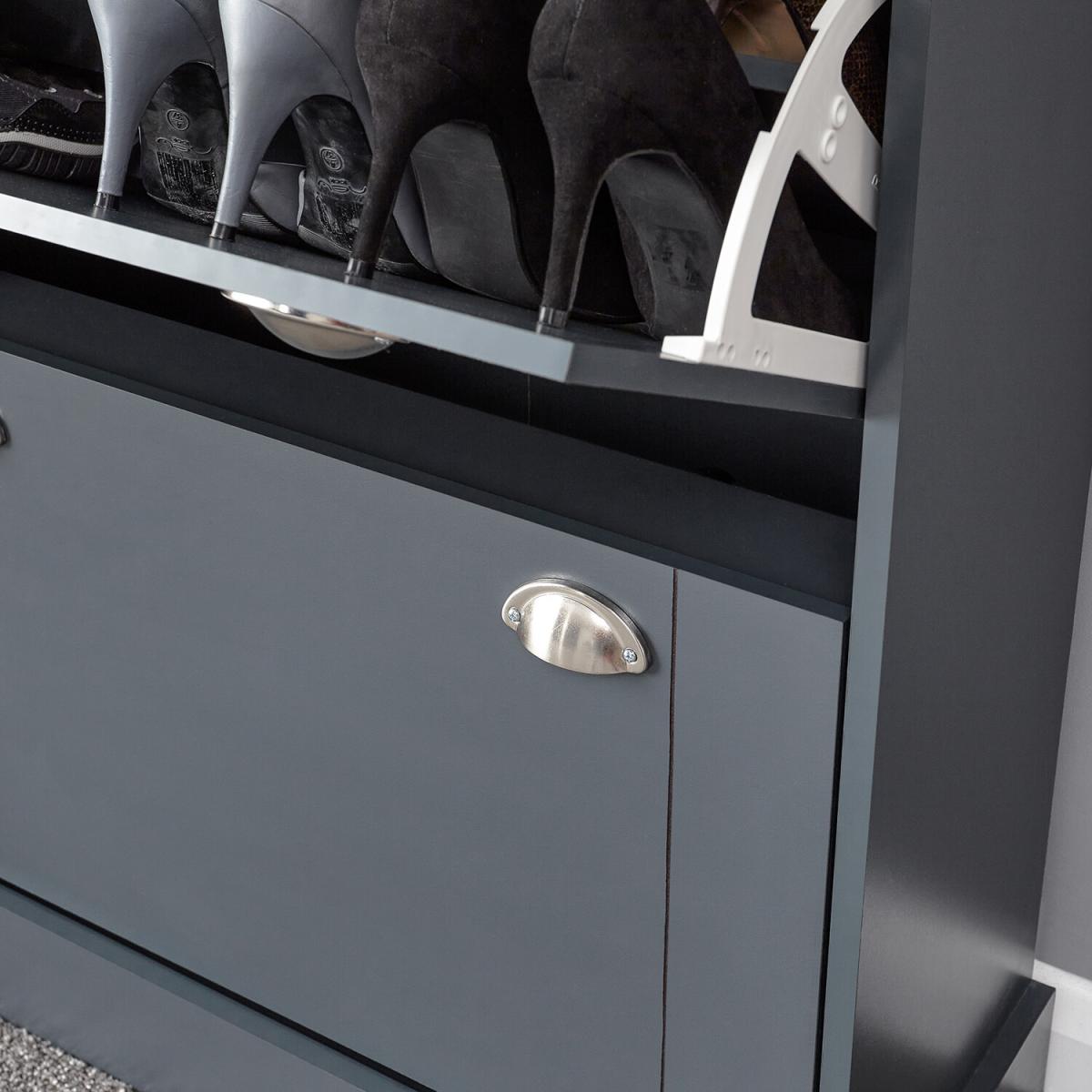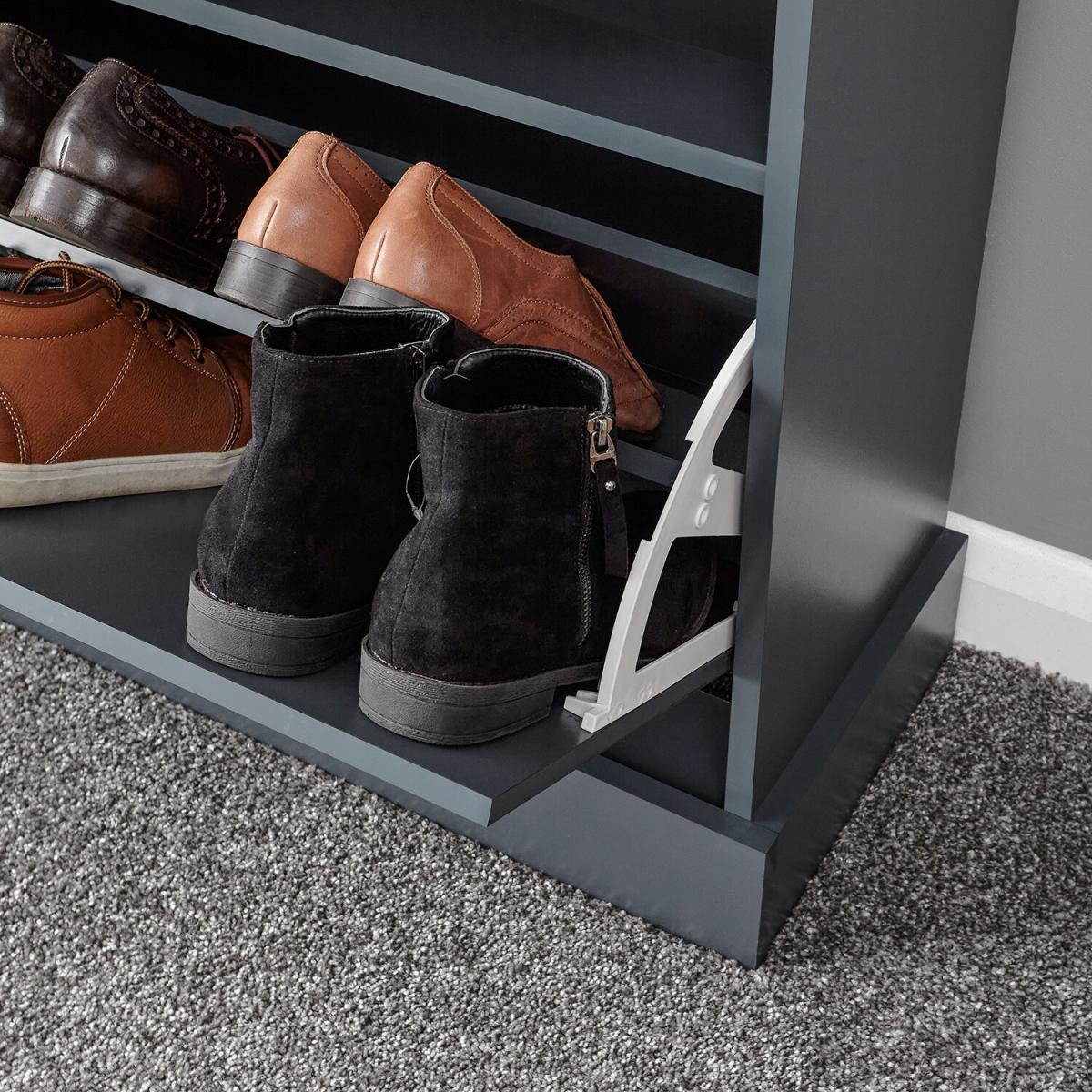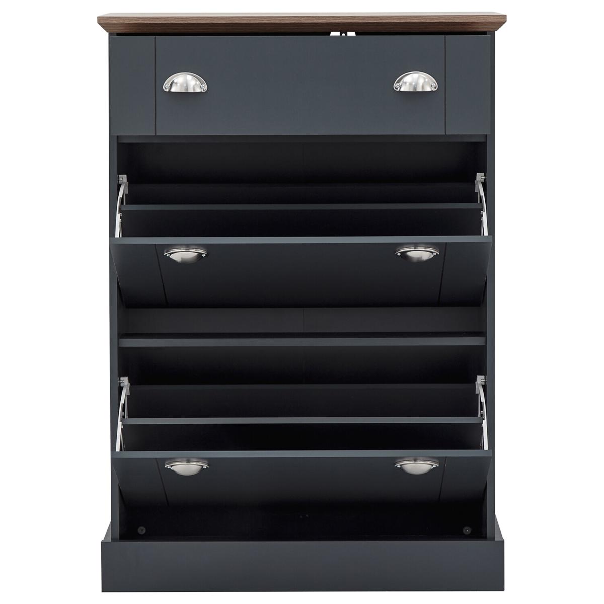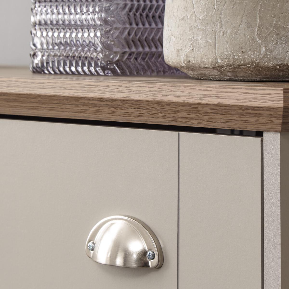 Make the smart choice with a shoe cabinet that fits perfectly into Kendal's timeless country furnishing aesthetic. The Kendal Deluxe Shoe Cabinet features elegant panels are finished in a choice of muted colours and complemented by brushed nickel cup handles that reflect the unit's classic look and feel. The full width top drawer is perfect for gloves, pet paraphernalia and outdoor accessories, while the twin pull down shoe compartments are each capable of accommodating up to six pairs of standard size (UK10) men's shoes, a dozen pairs in all. The chunky oak effect top adds to the rustic charm and creates a handy surface for a lamp or ornament.