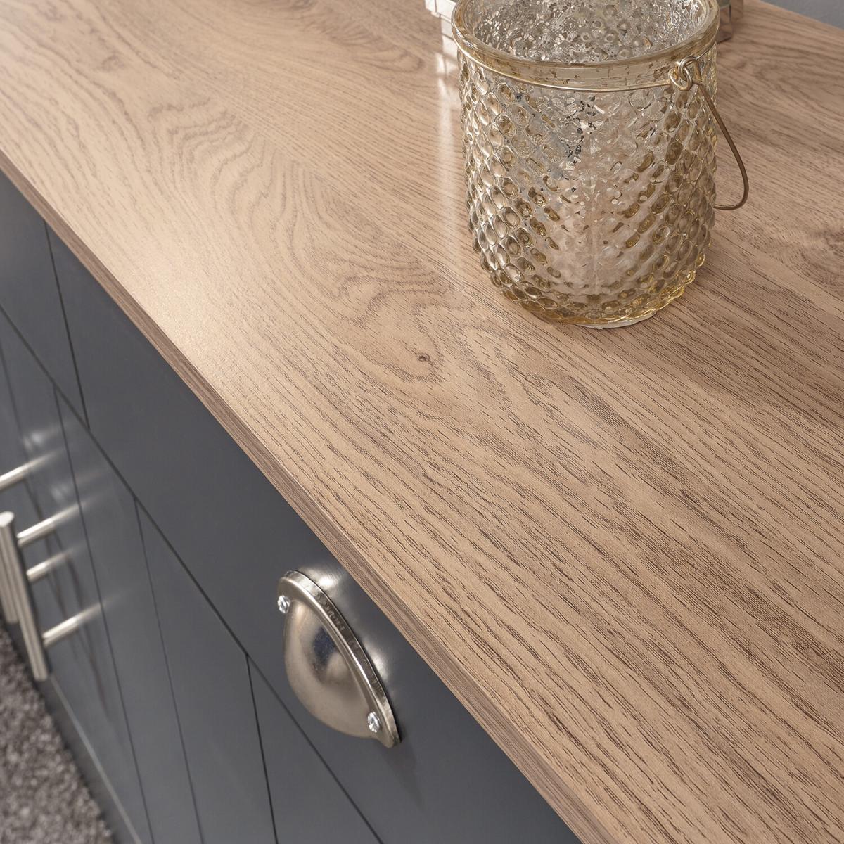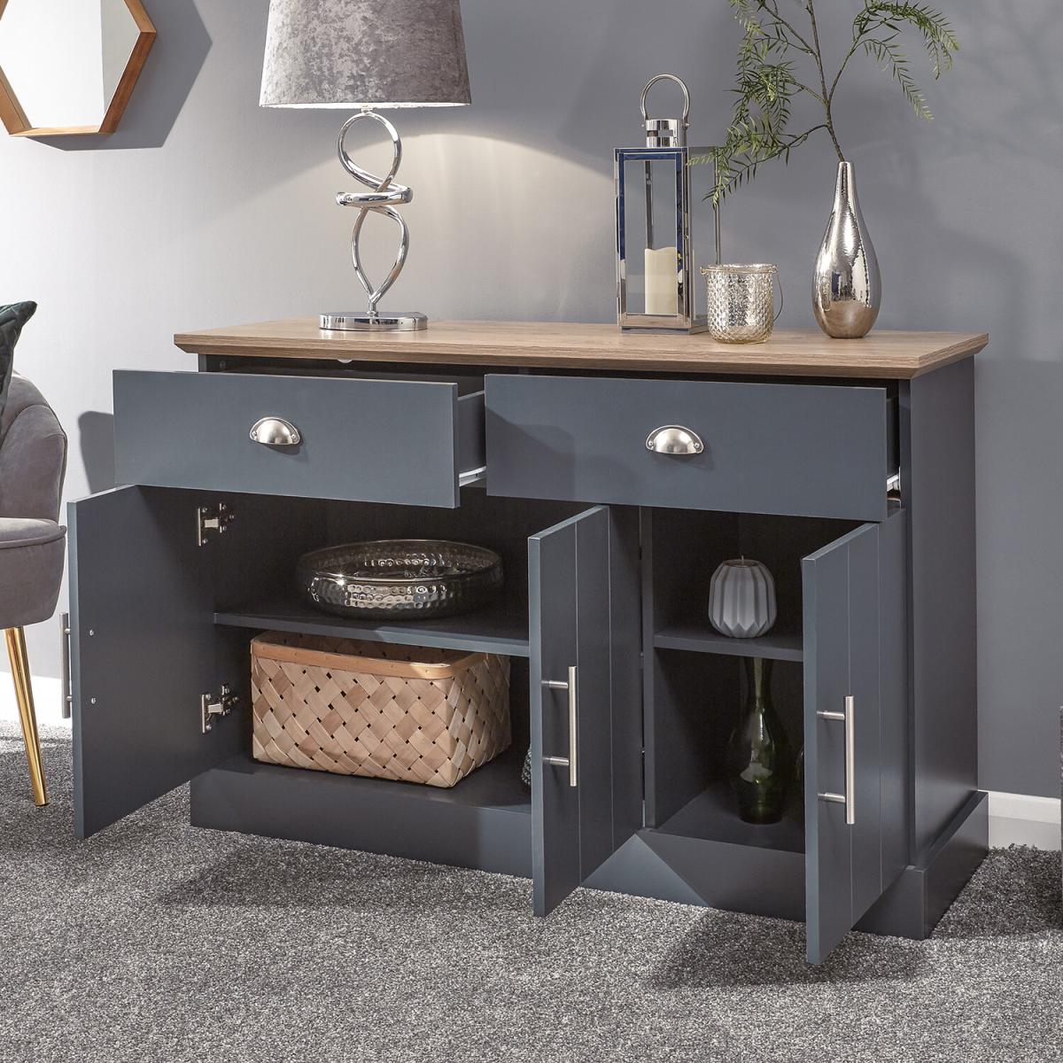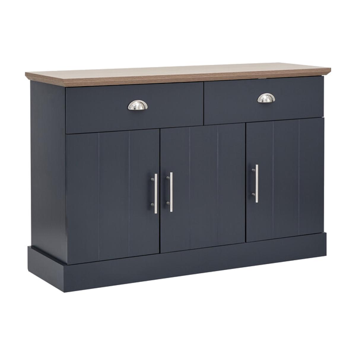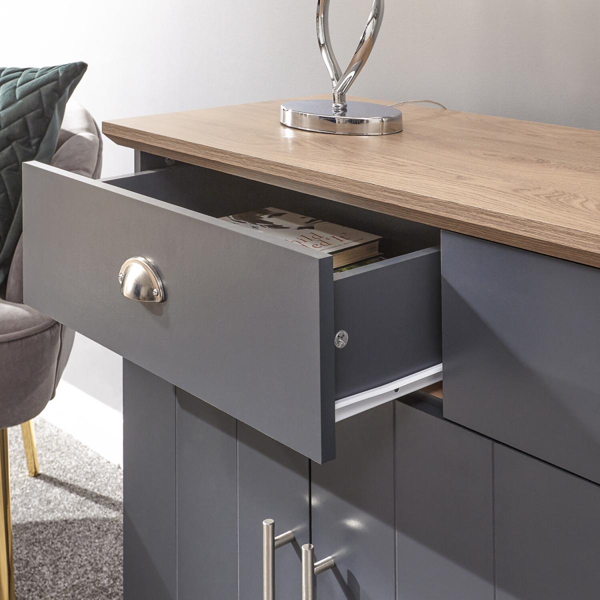 Every home needs ample practical storage solutions, especially if you want to be in with a chance of keeping your living space neat and tidy. But practical doesn't have to mean boring. Take this Kendal Large Sideboard, the classic country design allows it to shine in either a traditional or contemporary setting. A substantial piece, it incorporates shelved storage space below a pair of drawers. The combination of grooved panelling with deep base plinth and oak-effect top roots it in the cottage aesthetic, the slate bue or cool grey finish applying a contemporary twist.