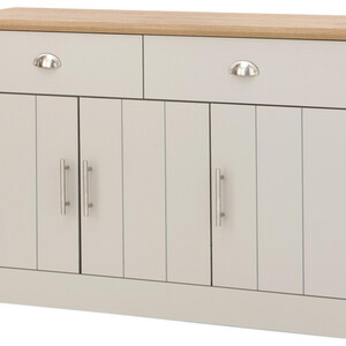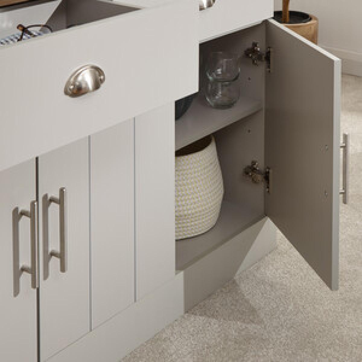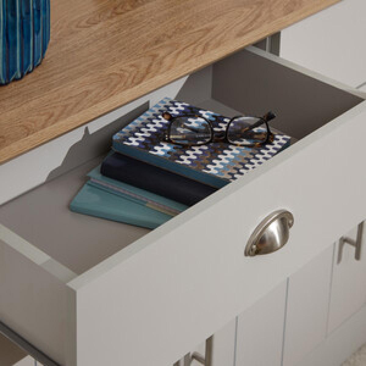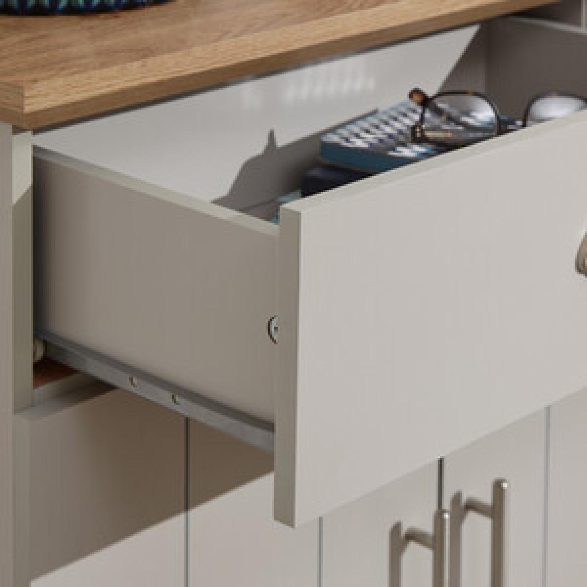 Every home needs ample practical storage solutions, especially if you want to be in with a chance of keeping your living space neat and tidy. But practical doesn't have to mean boring. Take this Kendal Large Sideboard, the classic country design allows it to shine in either a traditional or contemporary setting. A substantial piece, it incorporates shelved storage space below a pair of drawers. The combination of grooved panelling with deep base plinth and oak-effect top roots it in the cottage aesthetic, the slate bue or cool grey finish applying a contemporary twist.