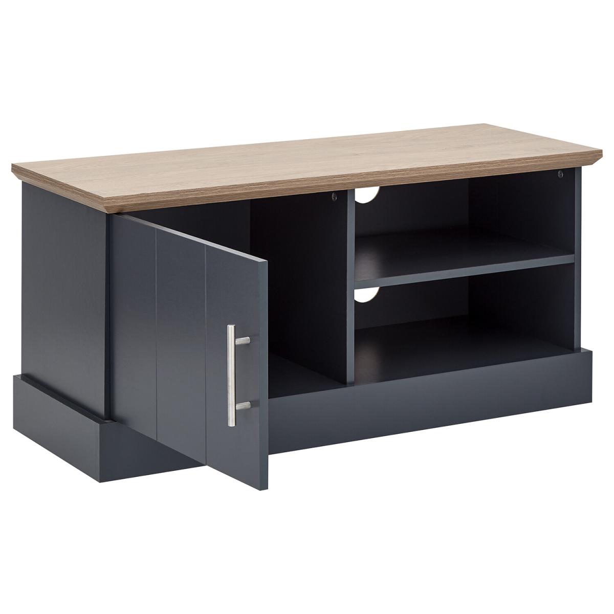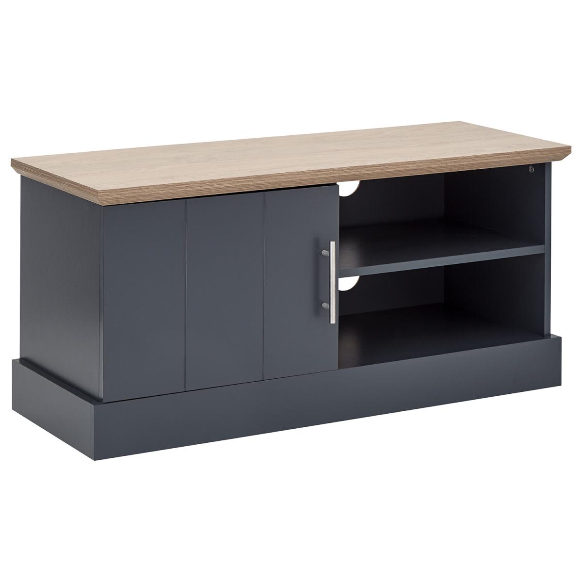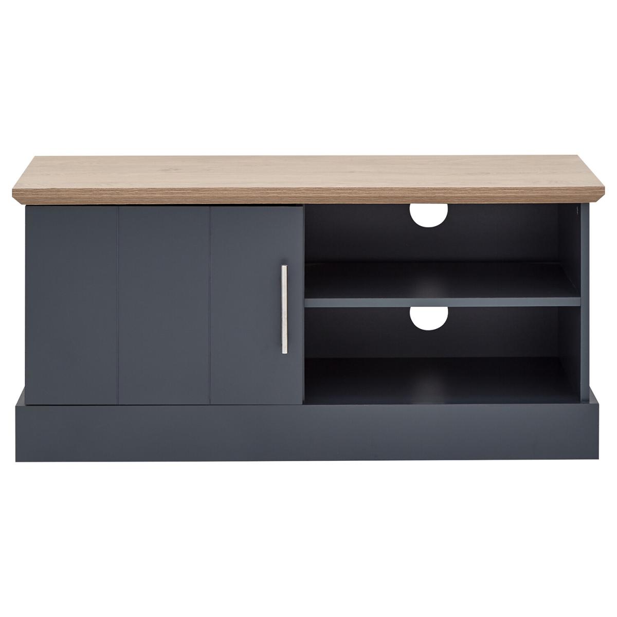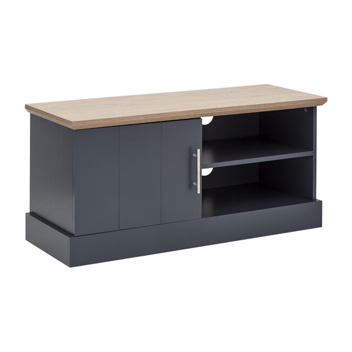 Even if you have only the most basic TV tech, TV screen plus viewing box or DVD player you need somewhere to put it. If you're not a fan of glass-and-chrome showboating, you may well favour a more classically designed furnishing piece like this Kendal Small TV Unit from the Kendal range. The unit's neat construction pairs a single door-fronted, groove-panelled cupboard with an open shelving section atop a deep base plinth all in slate blue or soft grey. The chunky oak-effect top adds rustic charm and provides sturdy support for a TV screen.