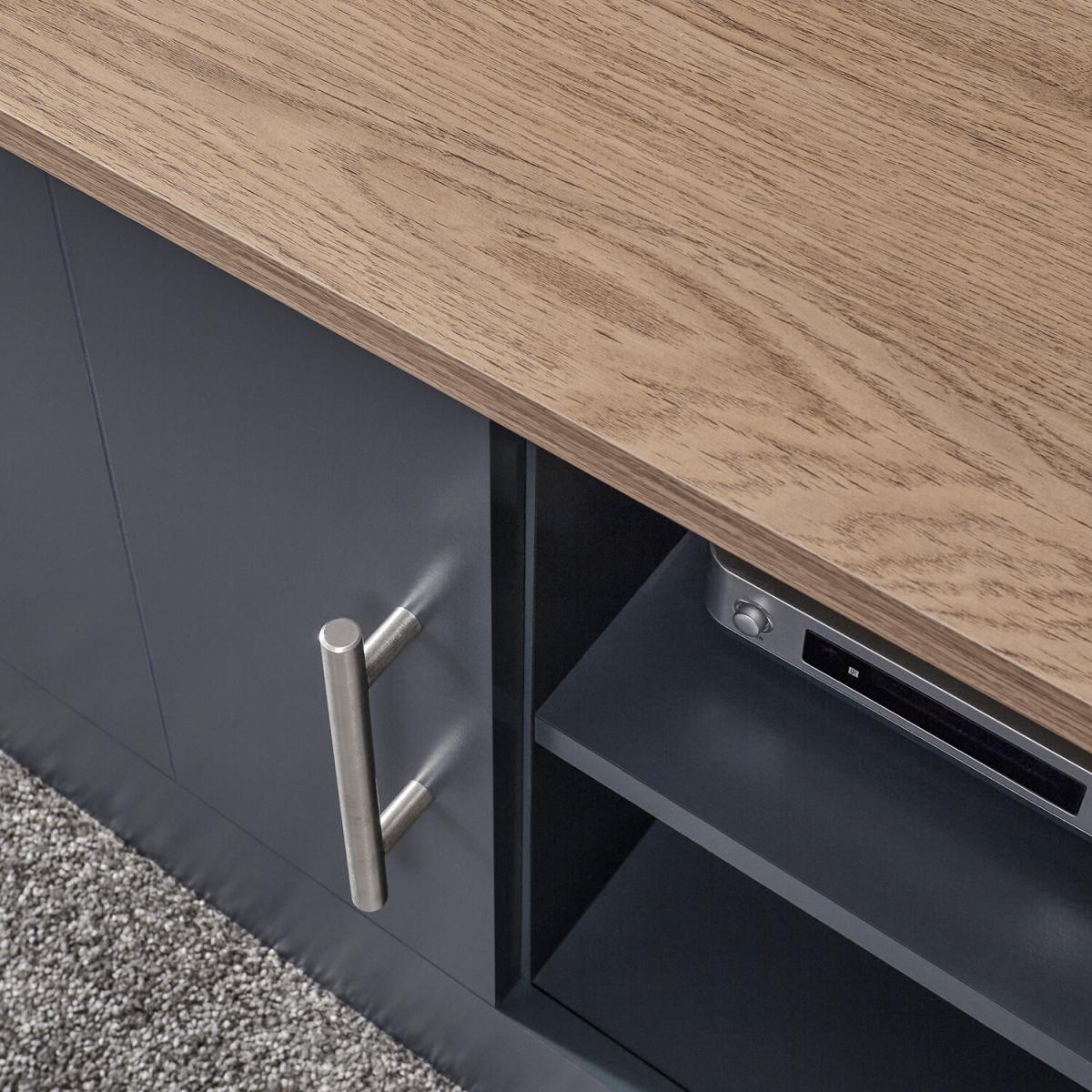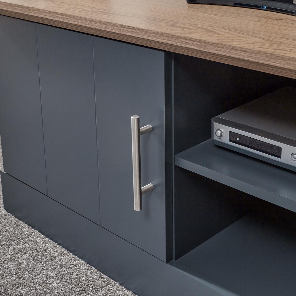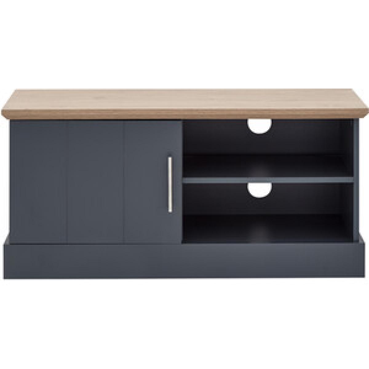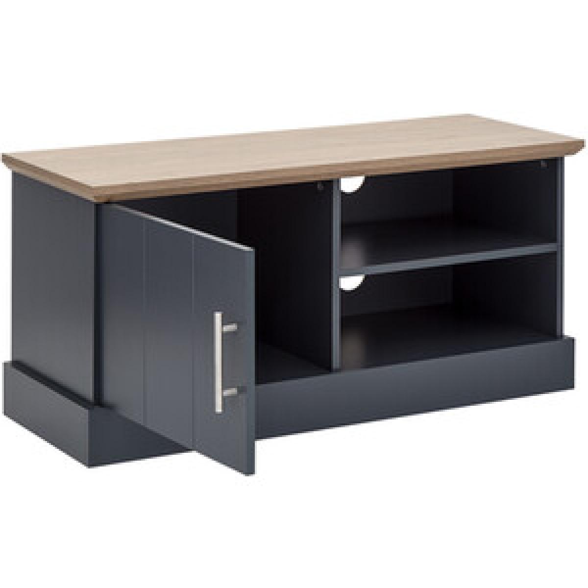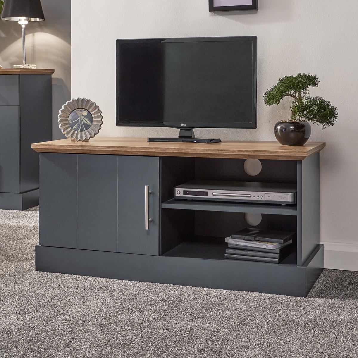Even if you have only the most basic TV tech, TV screen plus viewing box or DVD player you need somewhere to put it. If you're not a fan of glass-and-chrome showboating, you may well favour a more classically designed furnishing piece like this Kendal Small TV Unit from the Kendal range. The unit's neat construction pairs a single door-fronted, groove-panelled cupboard with an open shelving section atop a deep base plinth all in slate blue or soft grey. The chunky oak-effect top adds rustic charm and provides sturdy support for a TV screen.